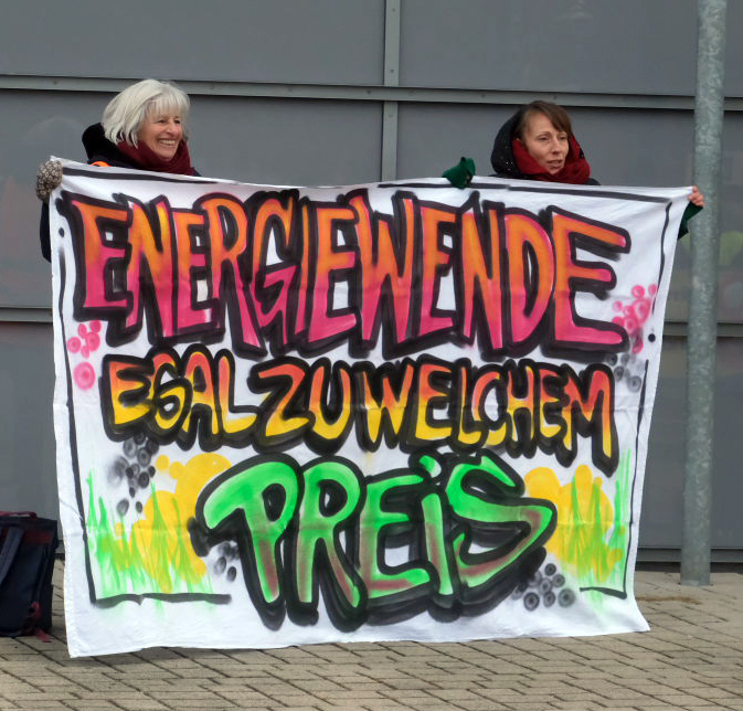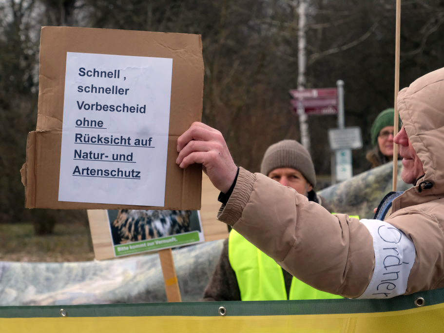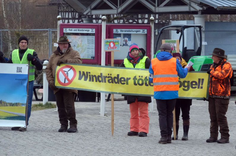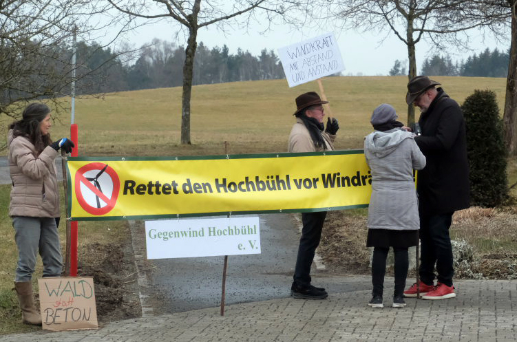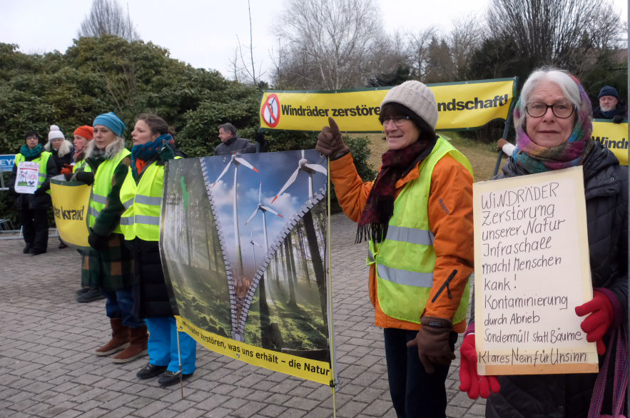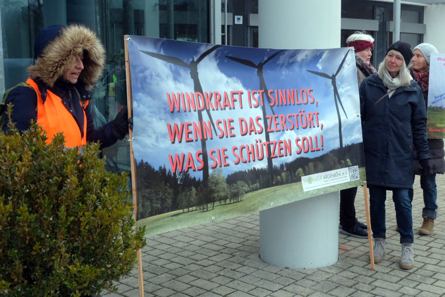 Lautstark skandierten die Demonstranten „Schützt Natur und Wald, sonst kommt das Ende bald“, als nach und nach die Mitglieder der Verbandsversammlung eintrafen. Auf ihren Transparenten und Plakaten artikulierten sie die Sorgen und Nöte, die sie umtreiben. Da wurde die Energiewende im Allgemeinen angeprangert: „Energiewende, egal zu welchem Preis.“ „Windräder zerstören, was uns erhält – die Natur“. „Windräder zerstören Lebensräume“. „Windkraft ist sinnlos, wenn sie zerstört, was sie schützen soll.“ Aber auch die konkreten Aspekte wurden thematisiert: „Kontaminierung durch Abrieb, Sondermüll statt Bäume.“ „Windstrom ist Zufallsstrom– Zufallsstrom ist Deindustrialisierung“.