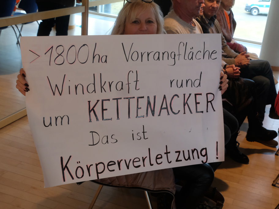 Eine BI aus der Gegend rund um Ratzenried bat die Abgeordneten um den Schutz von Rotmilan, Storch und Silberreiher in den Wäldern um Ratzenried und Siggen. Auch „Laubegg sagt nein zu Windrädern im Wald“. Die Vertreter aus Kettenacker vertraten die Meinung: „1800 ha Windkraftvorrangfläche rund um Kettenacker. Das ist Körperverletzung.“ Auch wurde die grundsätzliche Eignung von Baden-Württemberg als Standort für Windkraft infrage gestellt: „Zuwenig Wind – falscher Standort!“ Die Folge davon sind die Riesenanlagen, die allerorten entstehen sollen. Ebenfalls wurde angeprangert: „Infraschall und Druckpulse machen krank.“
