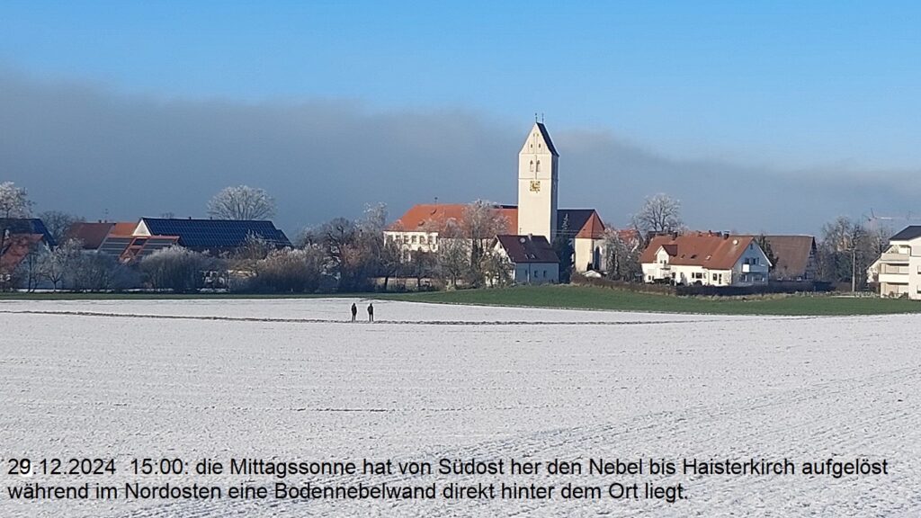 Haisterkirch vor Nebelwand: 29. Dezember, 15.00 Uhr: Die Mittagssonne hat von Südost her den Nebel bis Haisterkirch aufgelöst, während im Nordosten eine Bodennebelwand direkt hinter dem Ort steht.