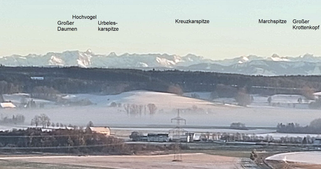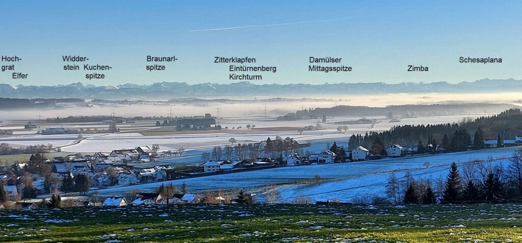 Blick über die Haidgauer Heide auf die Vorarlberger Berggrößen. Im Mittelgrund Bodennebel über dem Rohrsee-Becken. Die Aufnahme hat Josef Zell am 29. Dezember vom Winterbrandhof oberhalb Haidgaus gemacht.