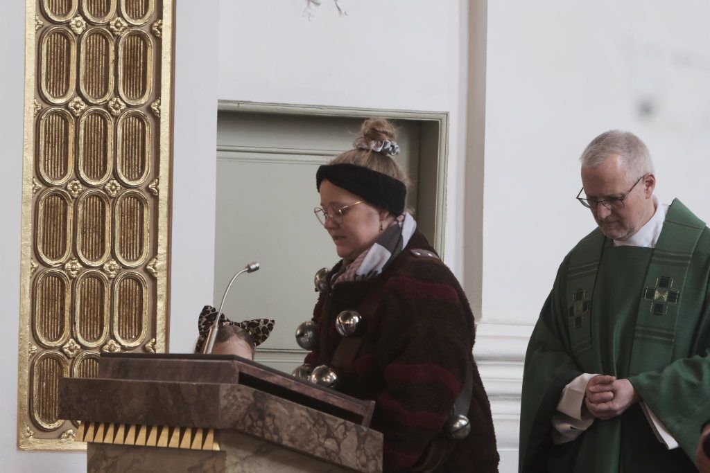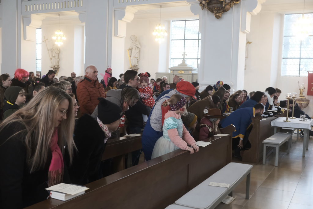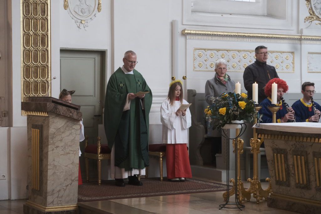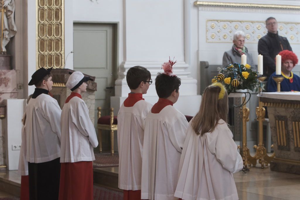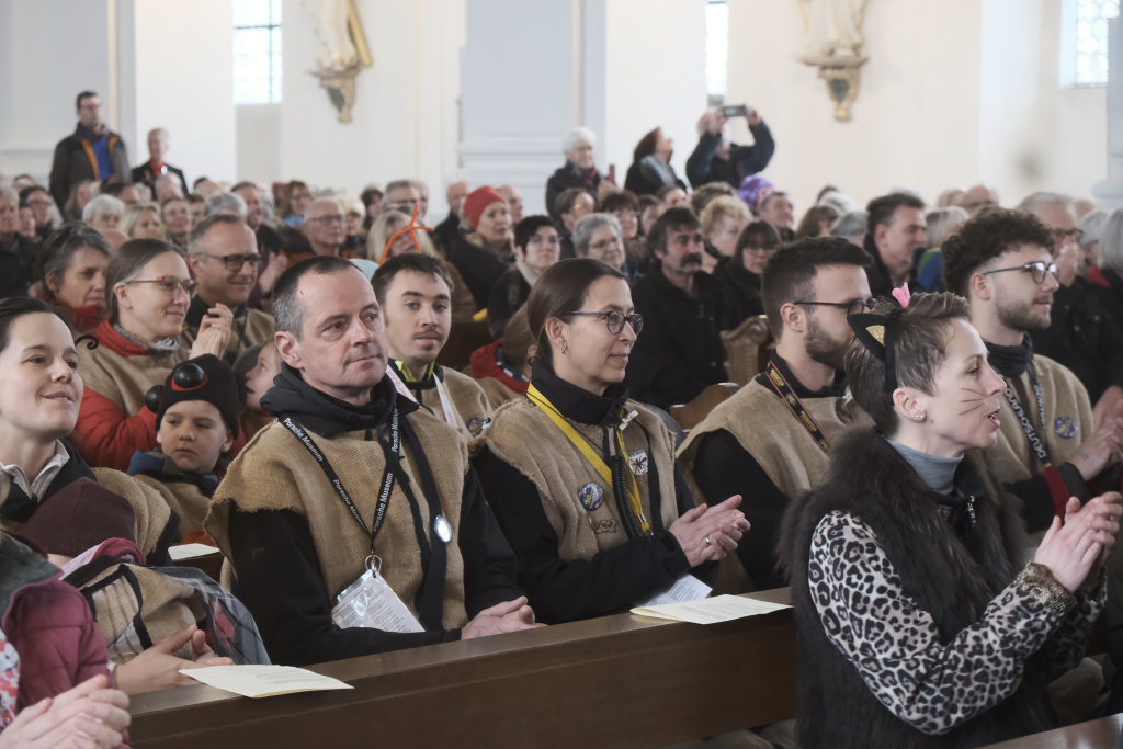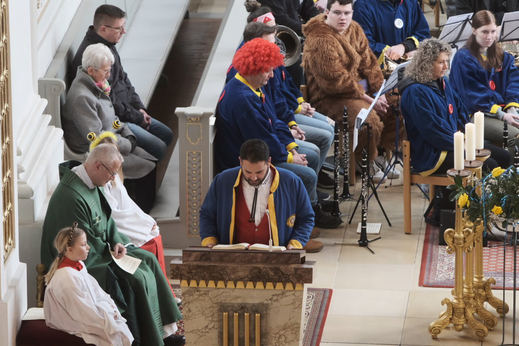 Zunftmeister Dominic Neher hielt als Lektor die Lesung aus dem Buch Levitikus. Nach dem Matthäus-Evangelium, in dem Jesus einen Aussätzigen heilt, sowie der Predigt verlasen je zwei Vertreter der Narrenzunft und der Freunde des Ungeziefers die Fürbitten. Darin beteten sie für alle Schwerkranken und Behinderten, die von der Gesellschaft ausgegrenzt werden, für alle die sich im Ukraine- und Israelkonflikt um Frieden bemühen und alle, die sich für ihre Mitmenschen einsetzen.
