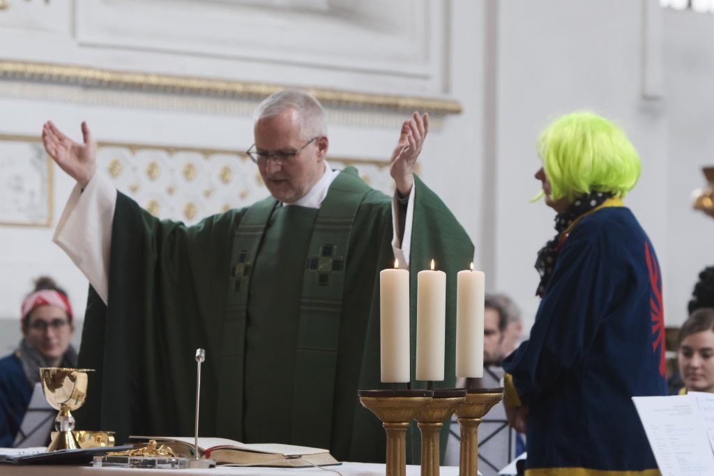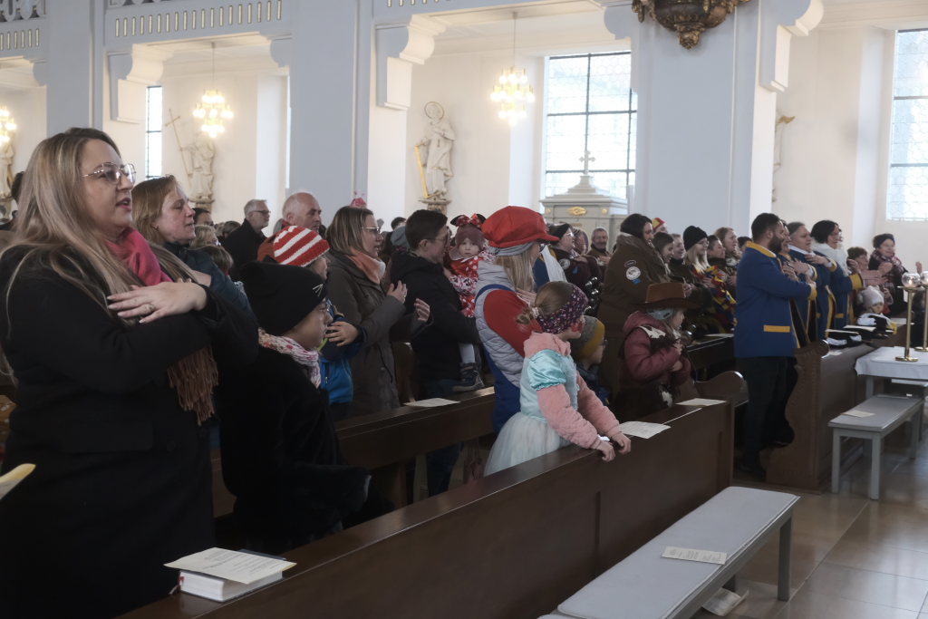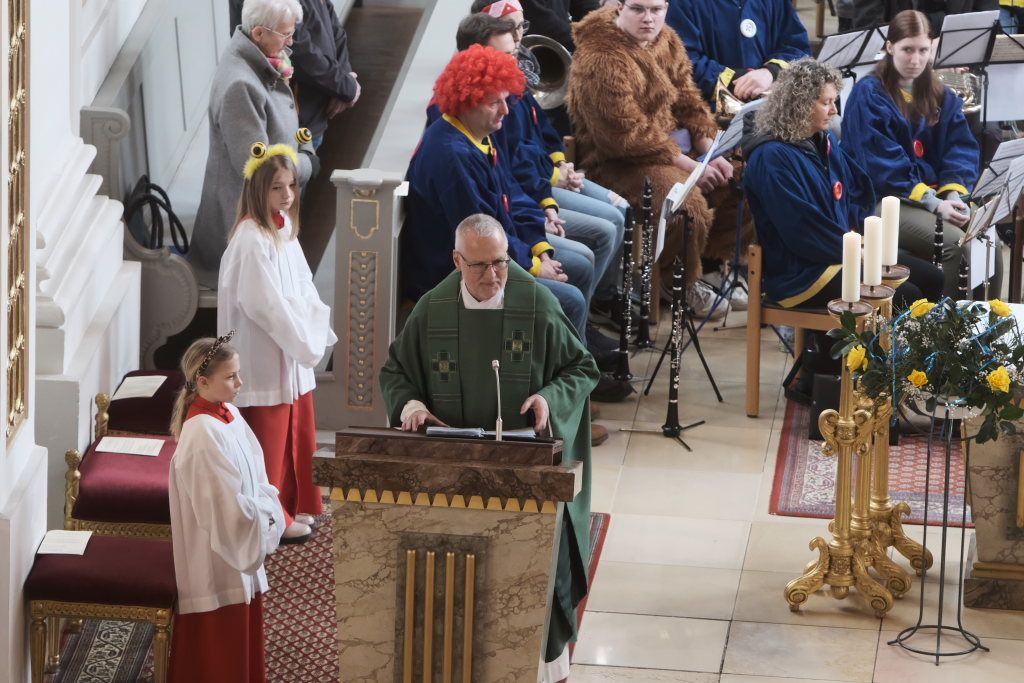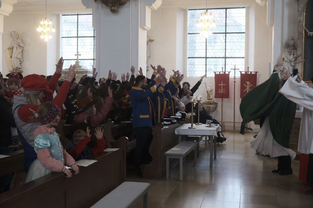 Die Stadtkapelle spielte zum Einzug von Pfarrer, Ministranten, Hästrägern und Zunftrat die Toccata in D-Moll, eine Blasmusik-Adaption von Bachs wohl berühmtesten Orgelwerk. Gleich daran anschließend intonierte sie das Kirchenlied „Manchmal feiern wir mitten am Tag“, für die Narren in diesen Tagen wohl ein sehr wahres Wort. Solchermaßen musikalisch auf die diesjährige Narrenmesse eingestimmt, sagte Pfarrer Stefan Maier in seiner Begrüßung – natürlich in Reimform – dass es außer den vier Jahreszeiten noch die Fünfte gebe, in der ein Tag besonders herausrage: der Fasnetssonntag. „Do standet mir zsamme in d‘ Kirchabänk nei, do sind Narre und au Normale dabei. Zsamma das Wort Gottes höra, horcha au auf seine Lehra, dem Herrn im Sakrament begegna und so ´s oigne Leba segna.“