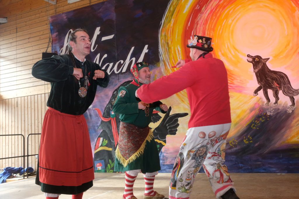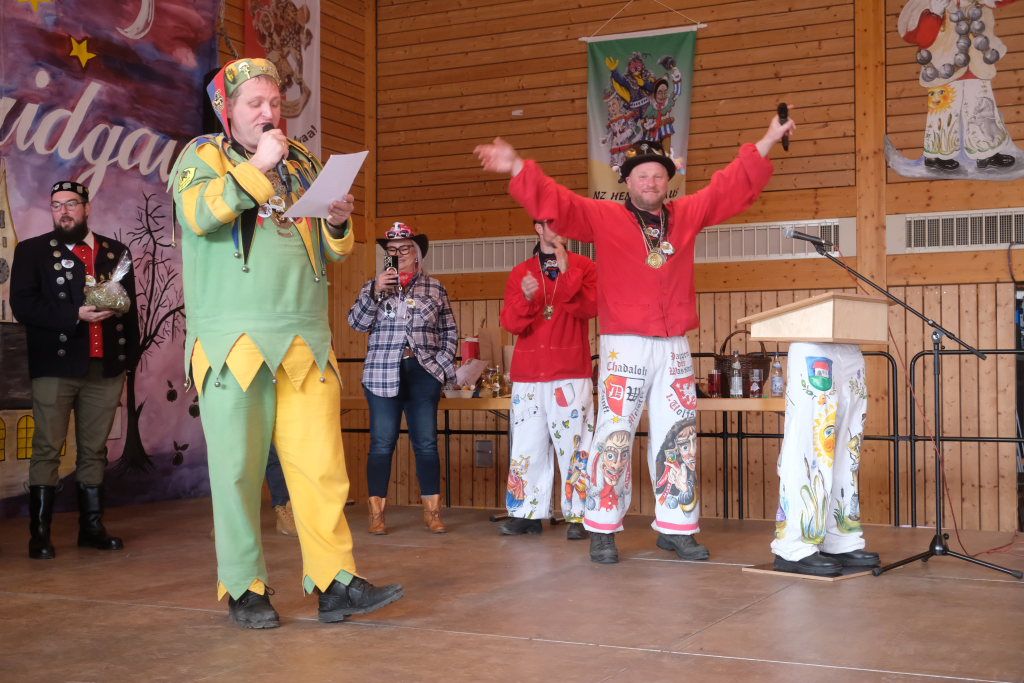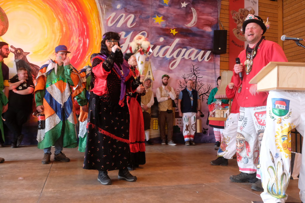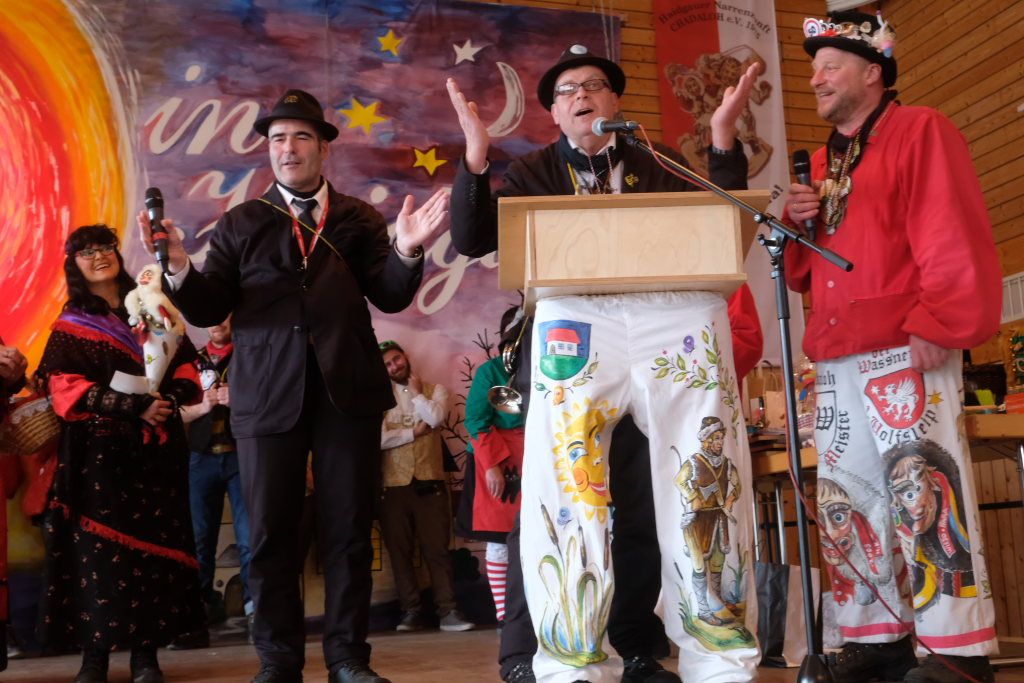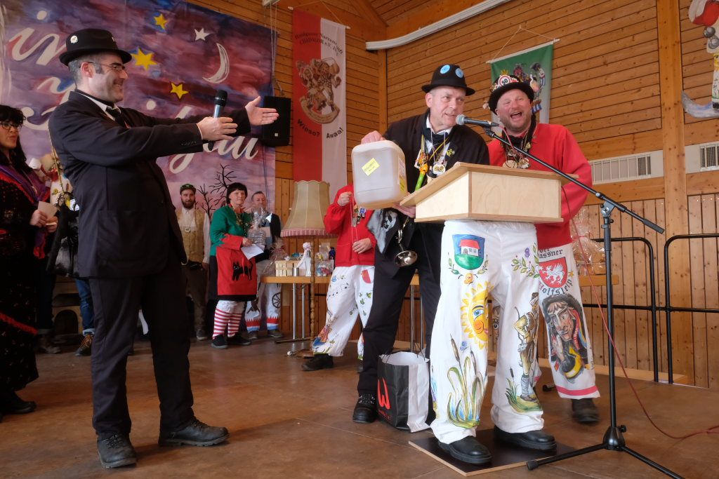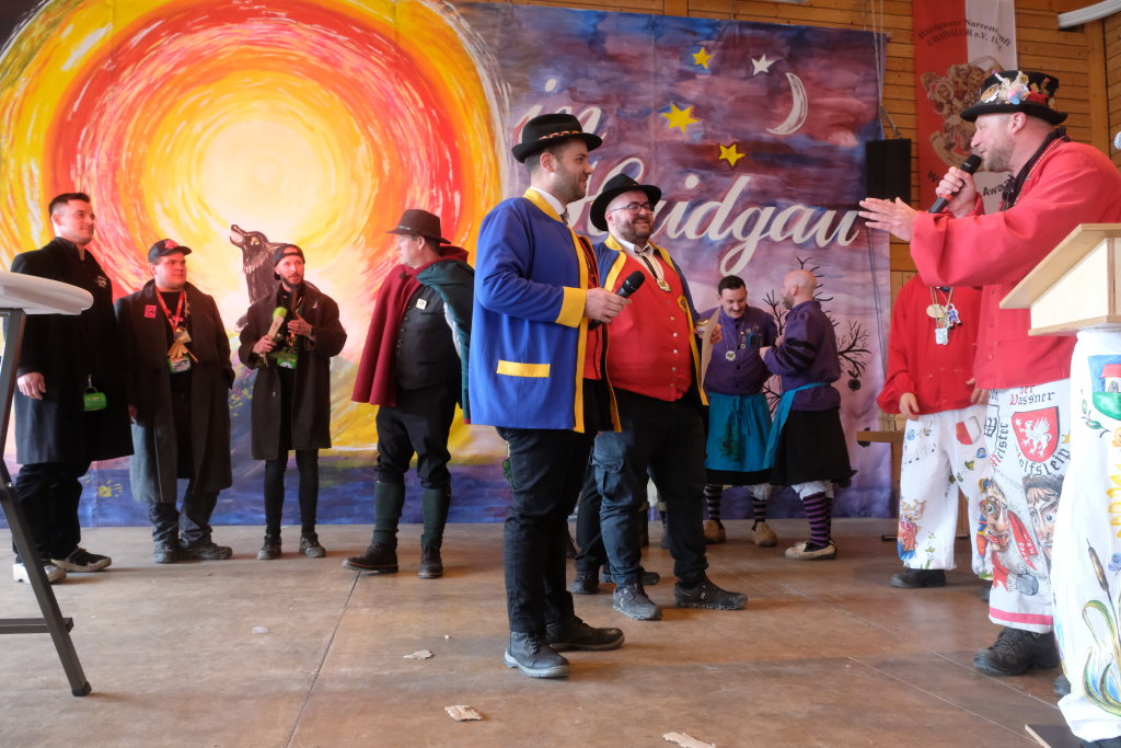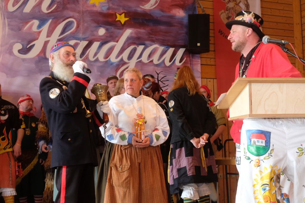 Ein Spiel, nämlich „Vögel füttern“, hatten die Damen des vogel-Wild(en) Kindergartens mitgebracht, der erstmals beim Umzug mitspringen durfte. Ein wenig ins Schwimmen kam der gastgebende Zunftmeister, als alle ANR-Zünfte aus der Region Donau-Oberschwaben von Alex Wild gleichzeitig auf die Bühne gerufen wurden, denn dies war natürlich nicht analog zu der Reihenfolge der Umzugsnummern. Dabei gab es neben einem Set wertvoller Weingläser auch noch eine Ode an die Hoigamer Fasnet von den Patenkindern aus Dornstadt.