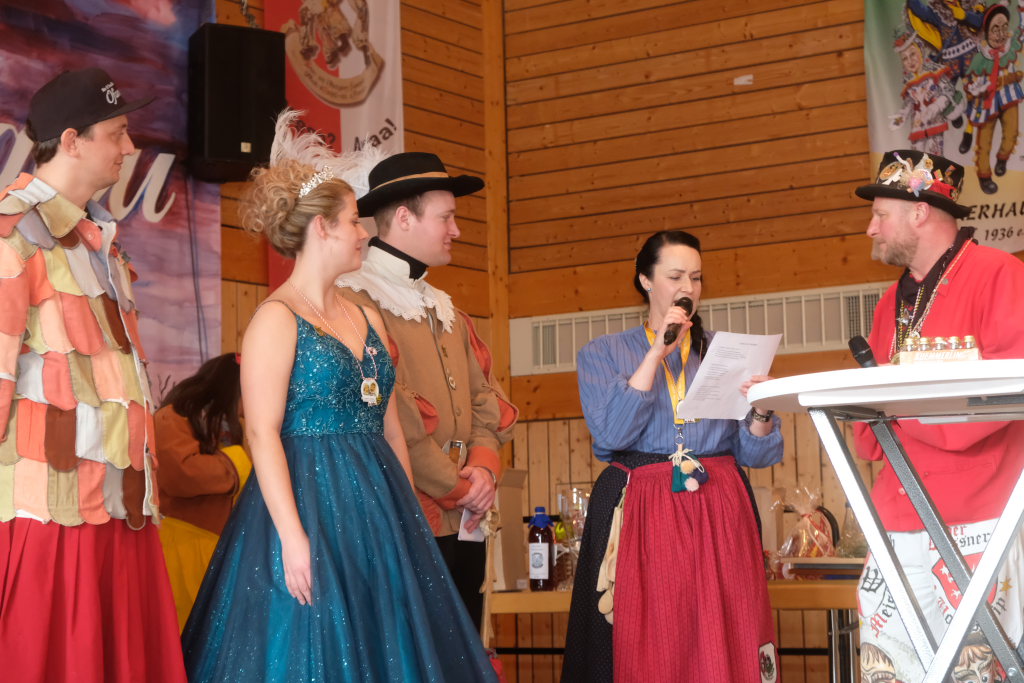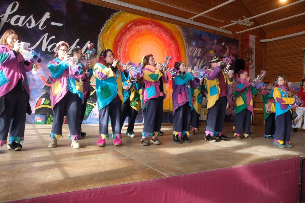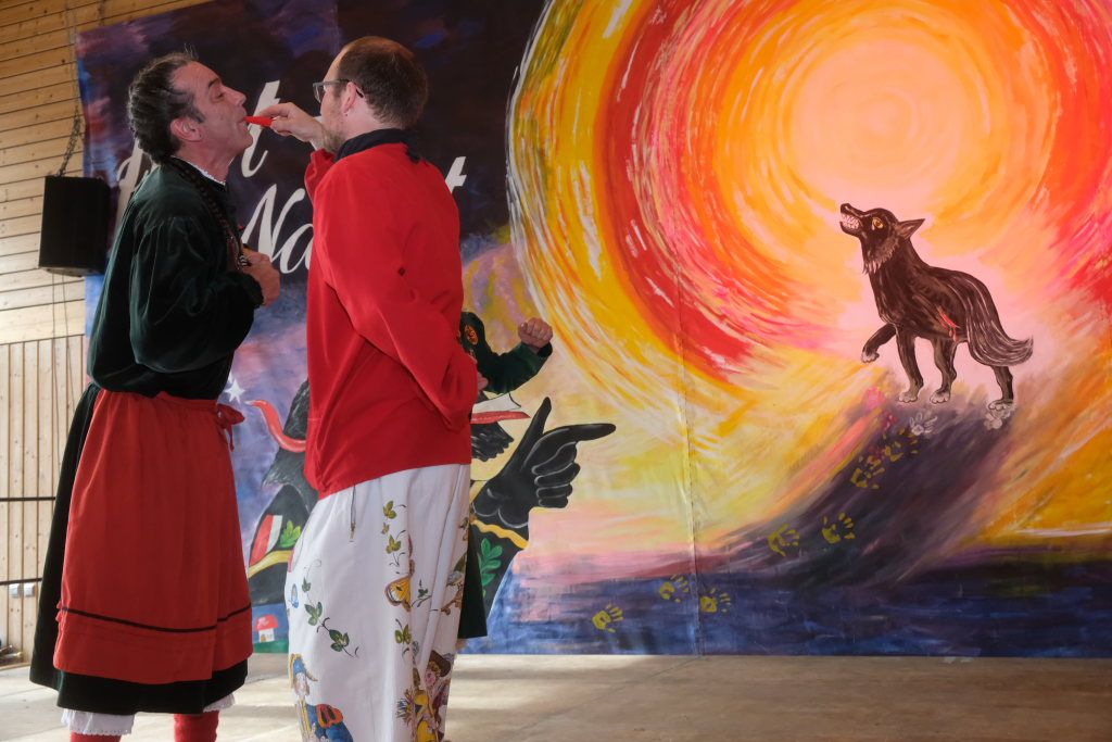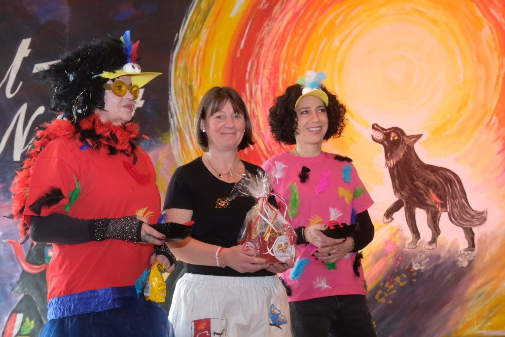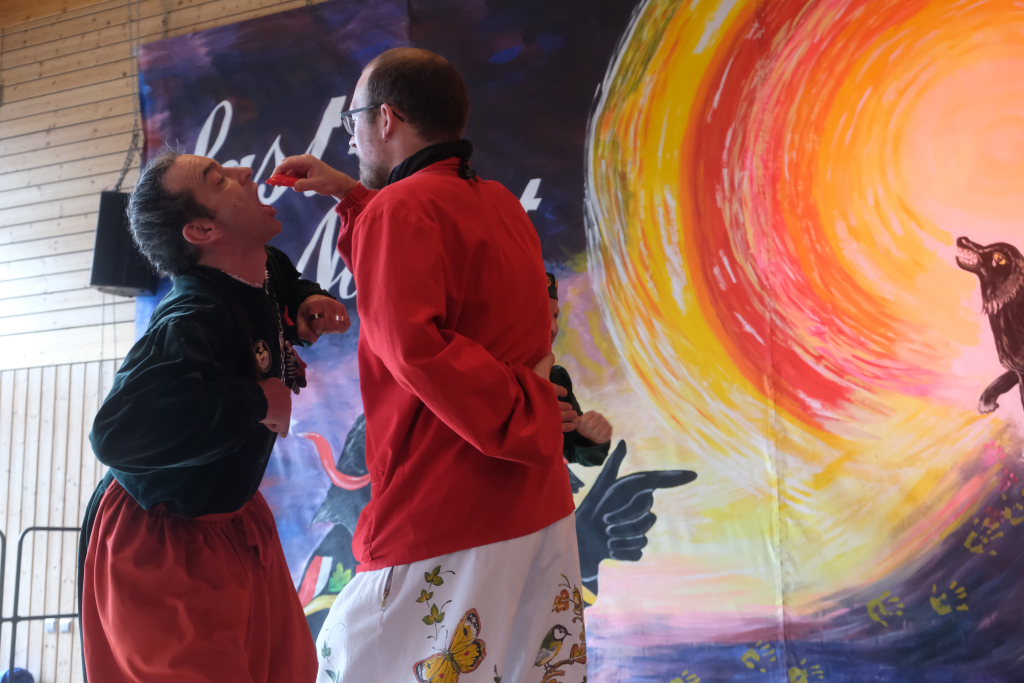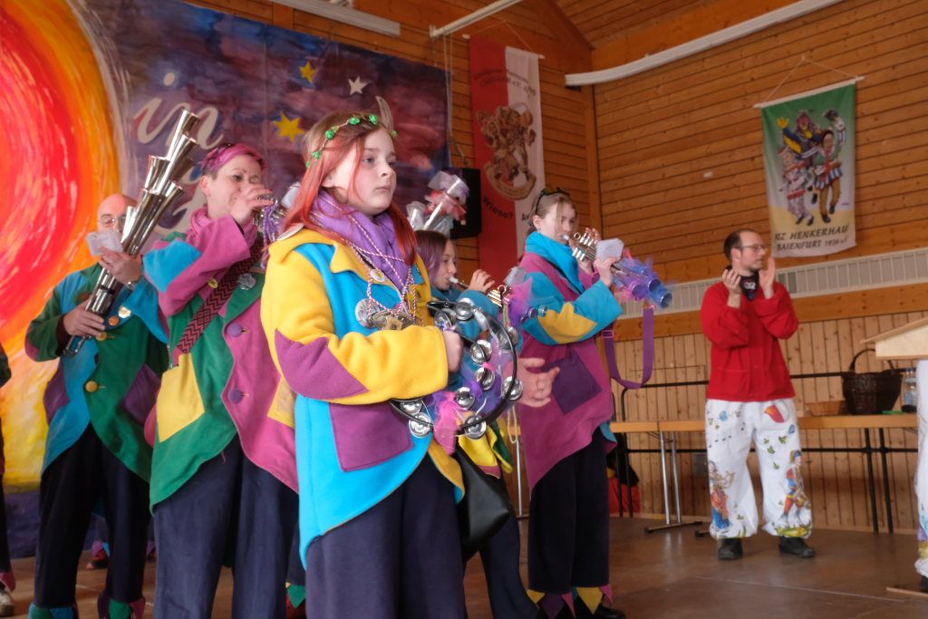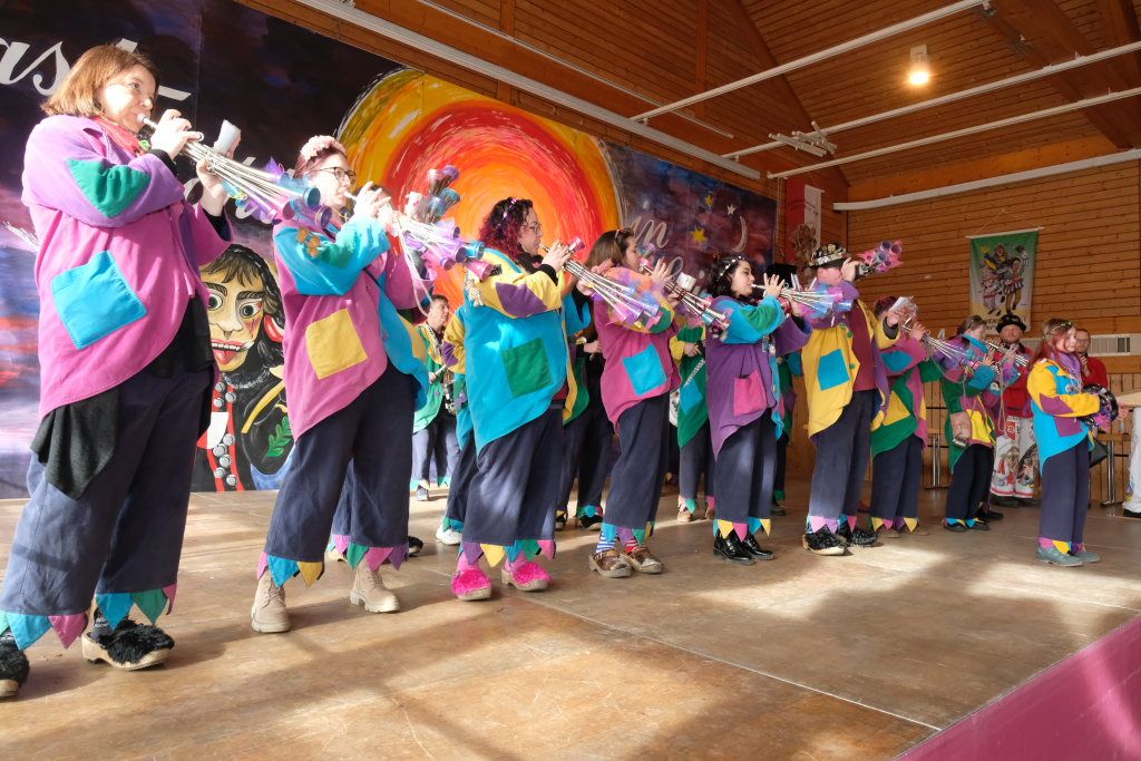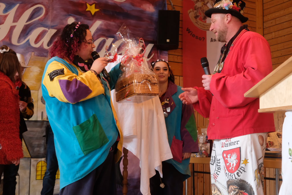 Ein Spiel, nämlich „Vögel füttern“, hatten die Damen des vogel-Wild(en) Kindergartens mitgebracht, der erstmals beim Umzug mitspringen durfte. Ein wenig ins Schwimmen kam der gastgebende Zunftmeister, als alle ANR-Zünfte aus der Region Donau-Oberschwaben von Alex Wild gleichzeitig auf die Bühne gerufen wurden, denn dies war natürlich nicht analog zu der Reihenfolge der Umzugsnummern. Dabei gab es neben einem Set wertvoller Weingläser auch noch eine Ode an die Hoigamer Fasnet von den Patenkindern aus Dornstadt.
