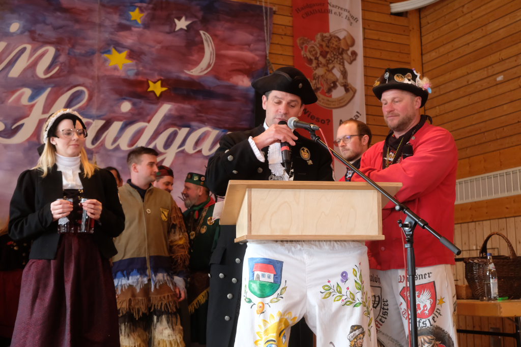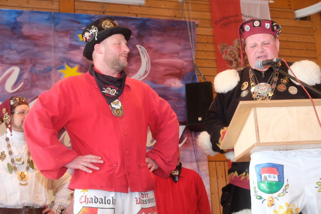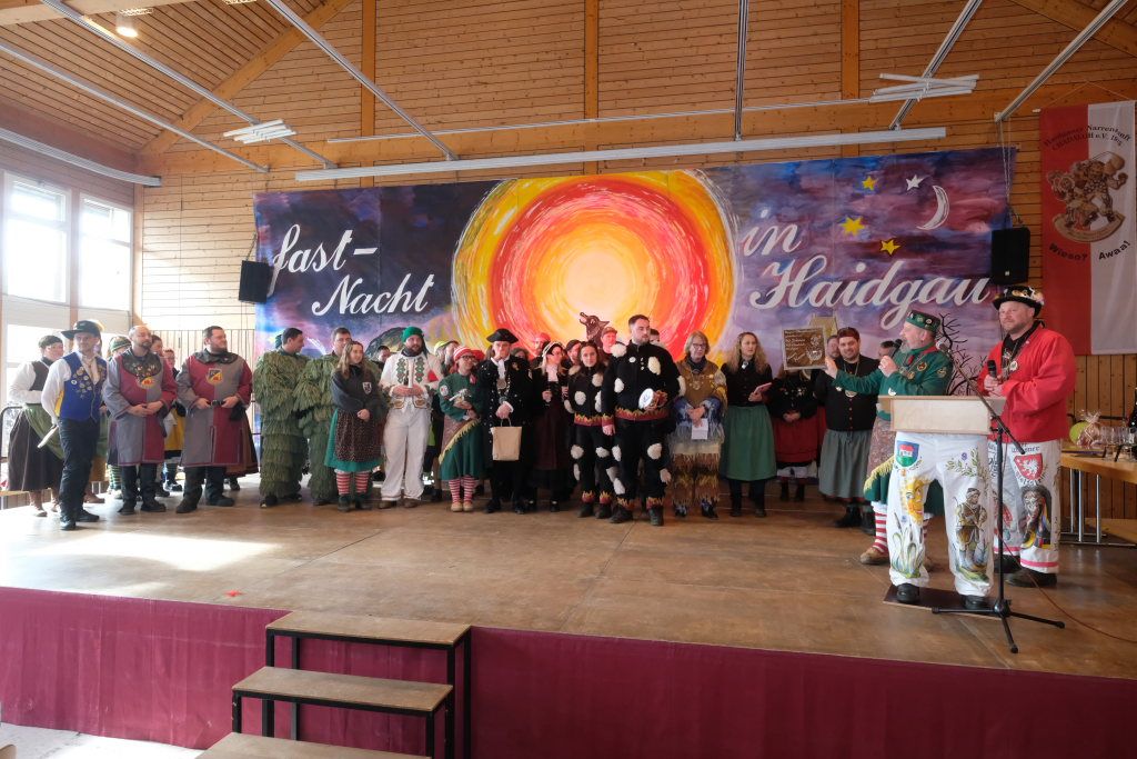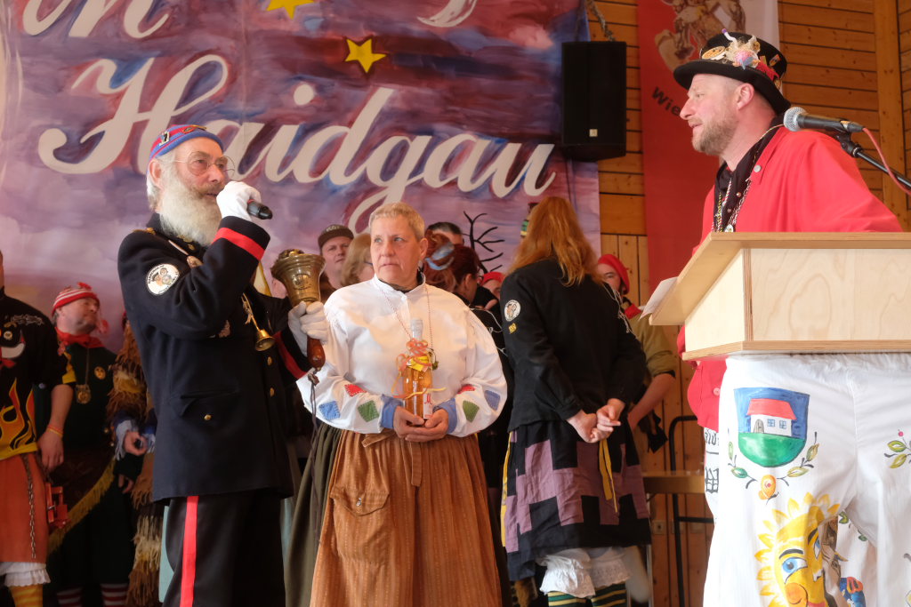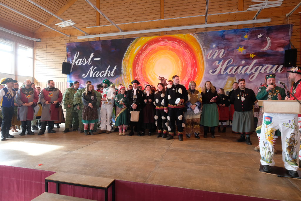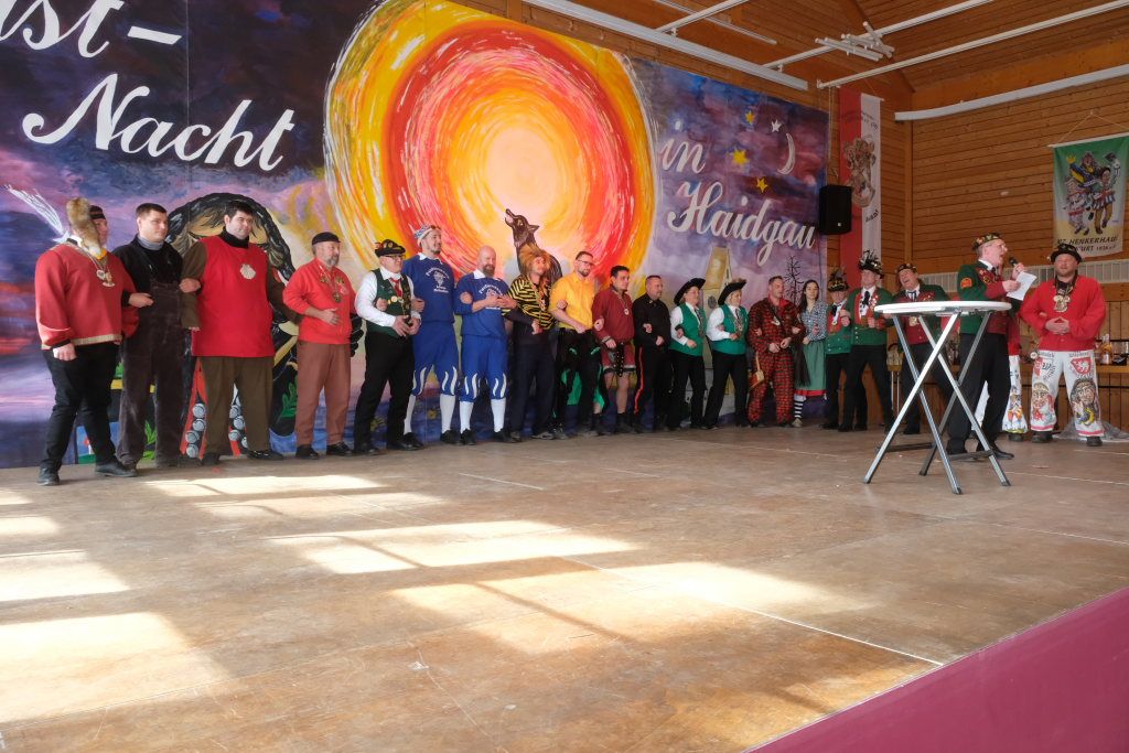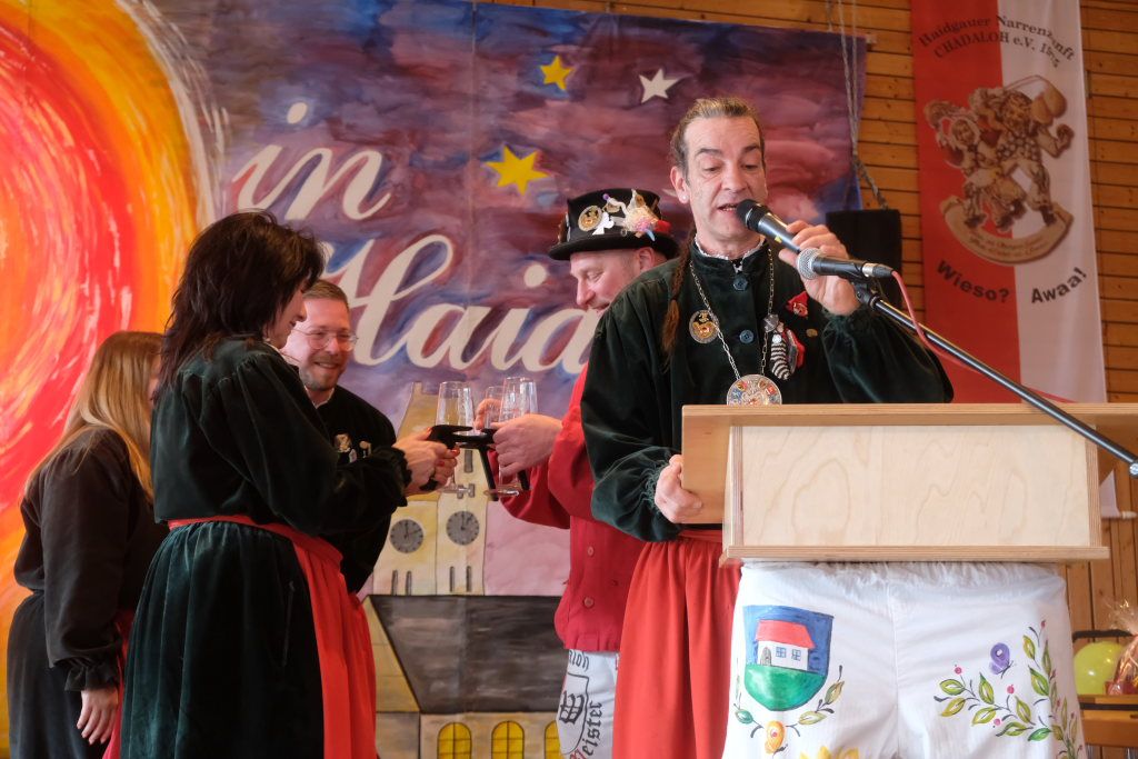 Haidgau – Die Haidgauer Narrenzunft der Chadaloh hatte zu ihrem 50. Geburtstag vom Präsidium des Alemannischen Narrenrings (ANR) die Ausrichtung des diesjährigen Freundschaftstreffens zugesprochen bekommen. Entsprechend groß war die Anzahl der Zünfte und Musikgruppen, die sich zum Zunftmeisterempfang vor dem Narrensprung in der Haidgauer Narrenhalle trafen.