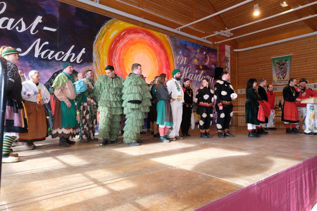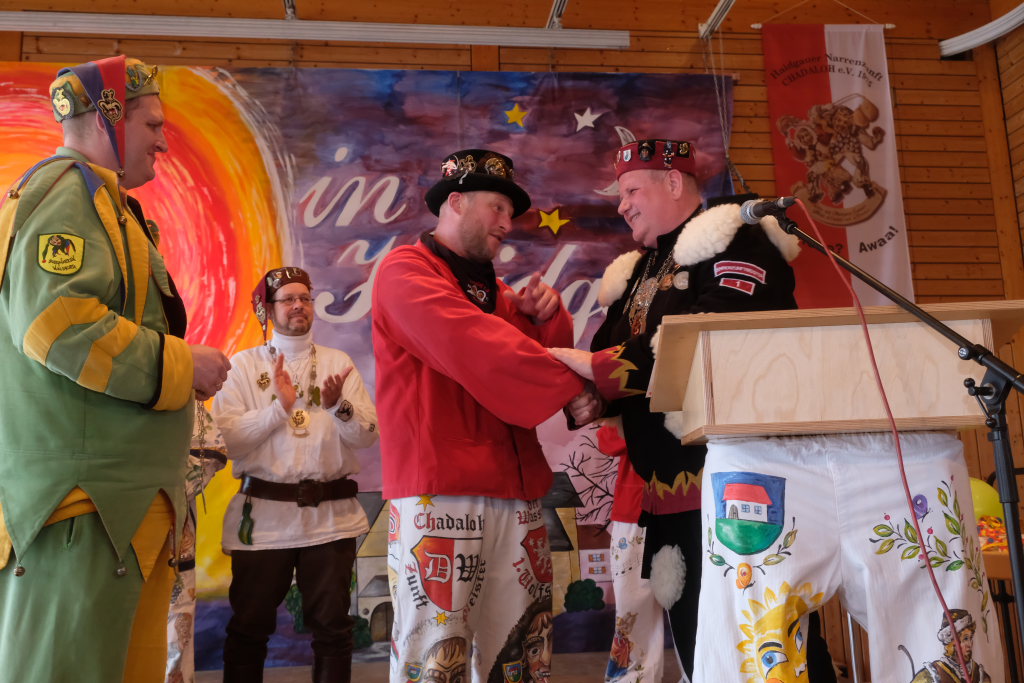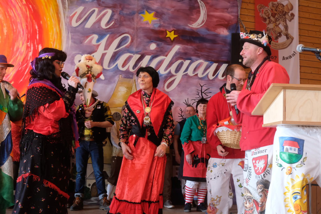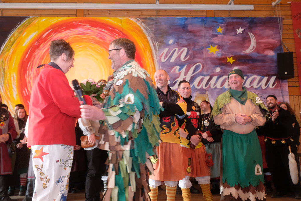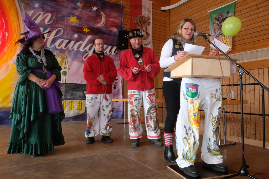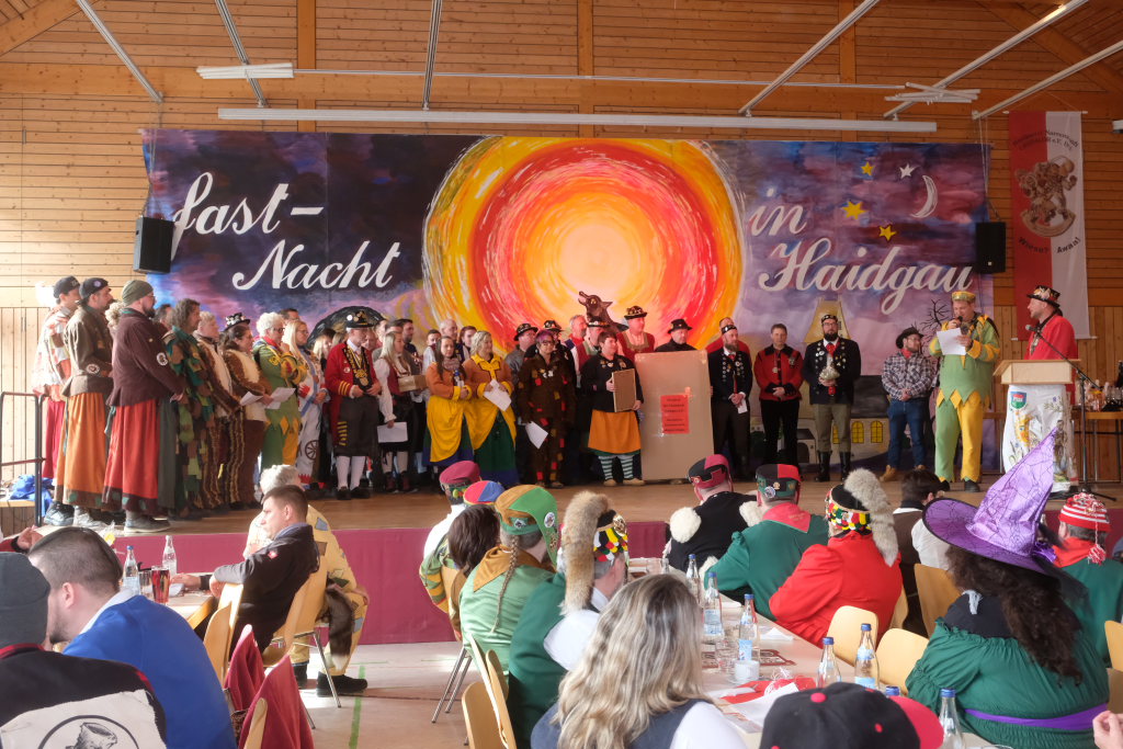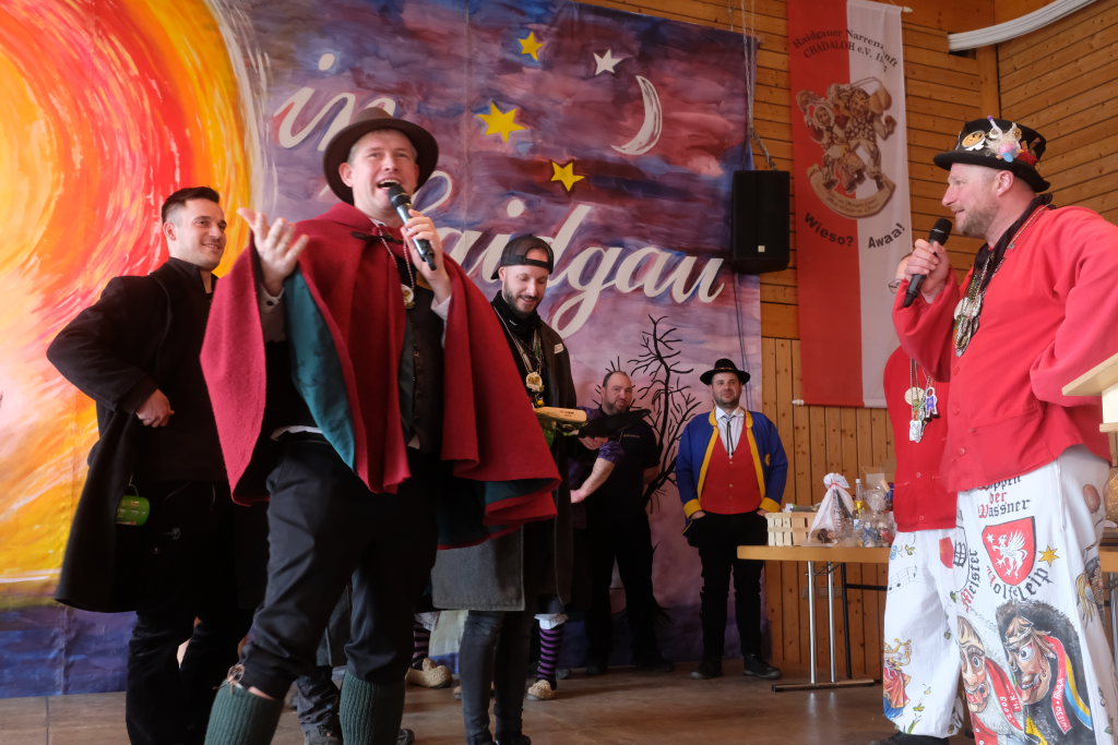 Haidgau – Die Haidgauer Narrenzunft der Chadaloh hatte zu ihrem 50. Geburtstag vom Präsidium des Alemannischen Narrenrings (ANR) die Ausrichtung des diesjährigen Freundschaftstreffens zugesprochen bekommen. Entsprechend groß war die Anzahl der Zünfte und Musikgruppen, die sich zum Zunftmeisterempfang vor dem Narrensprung in der Haidgauer Narrenhalle trafen.