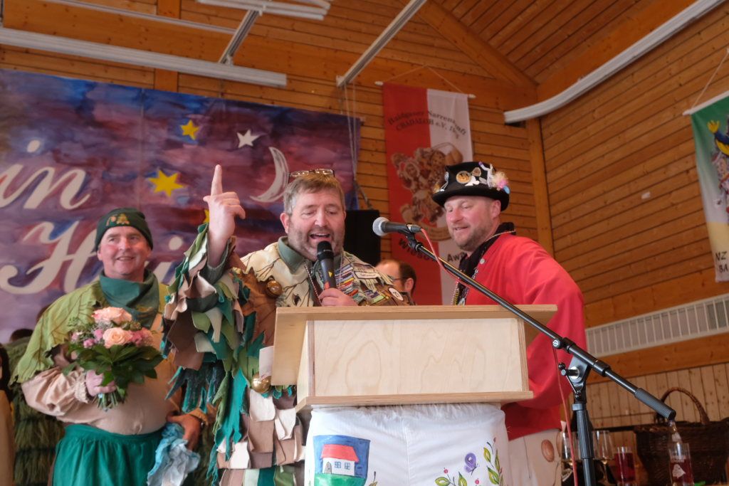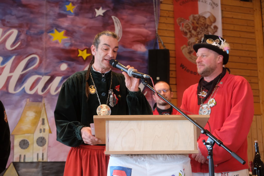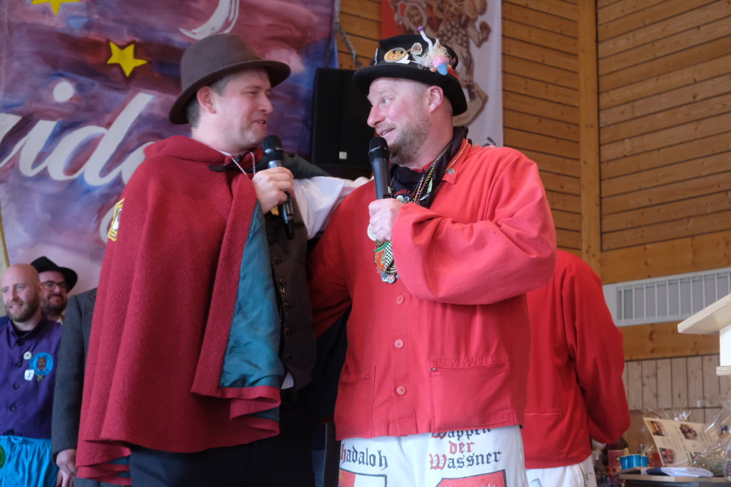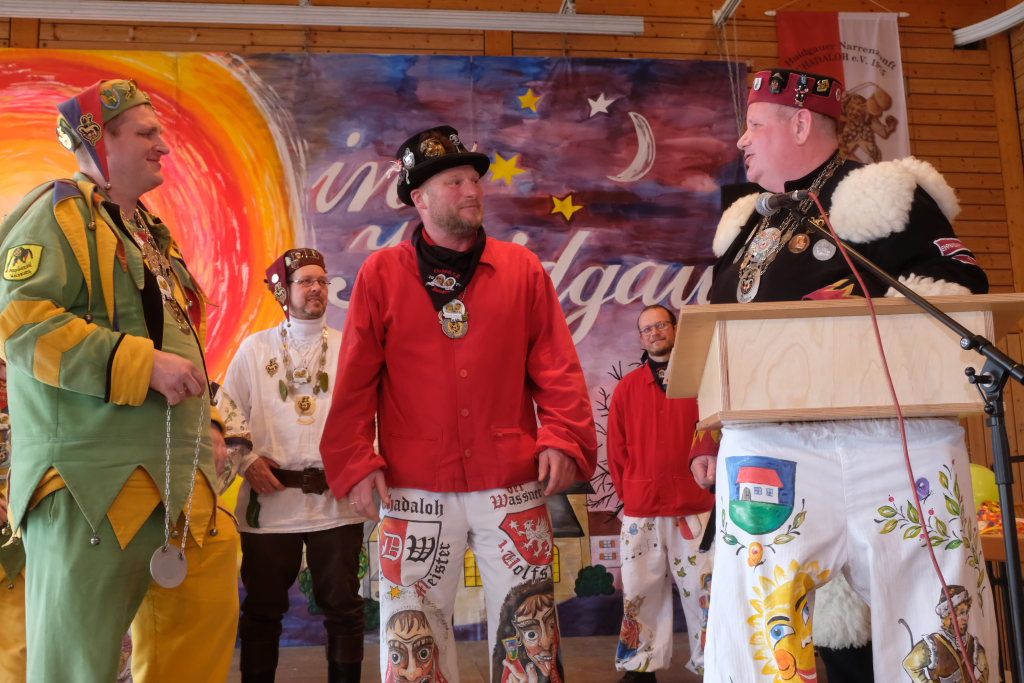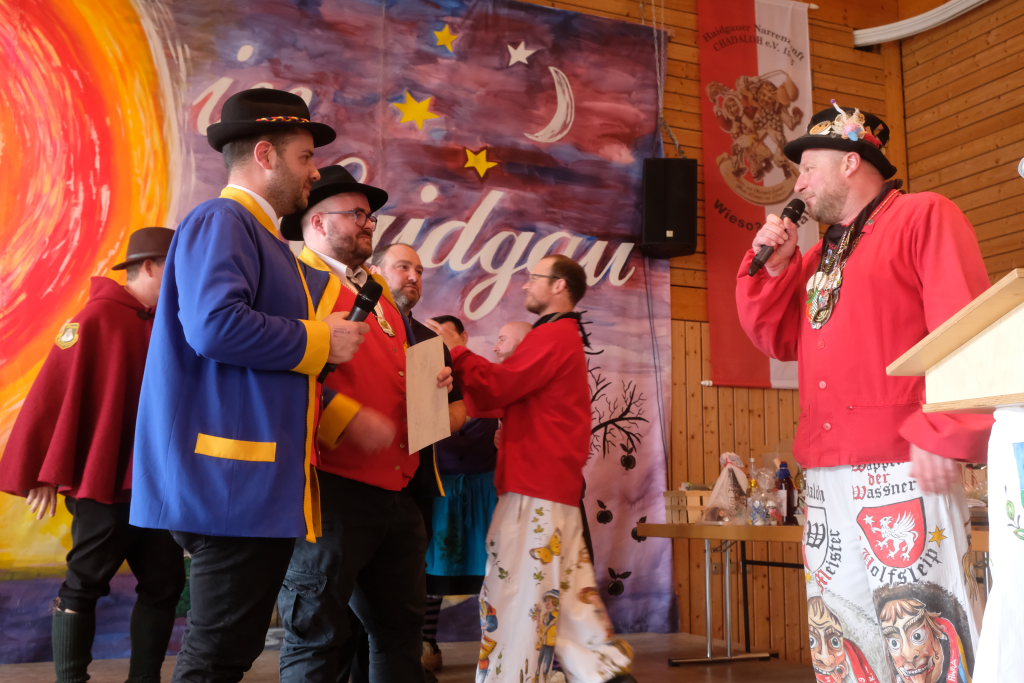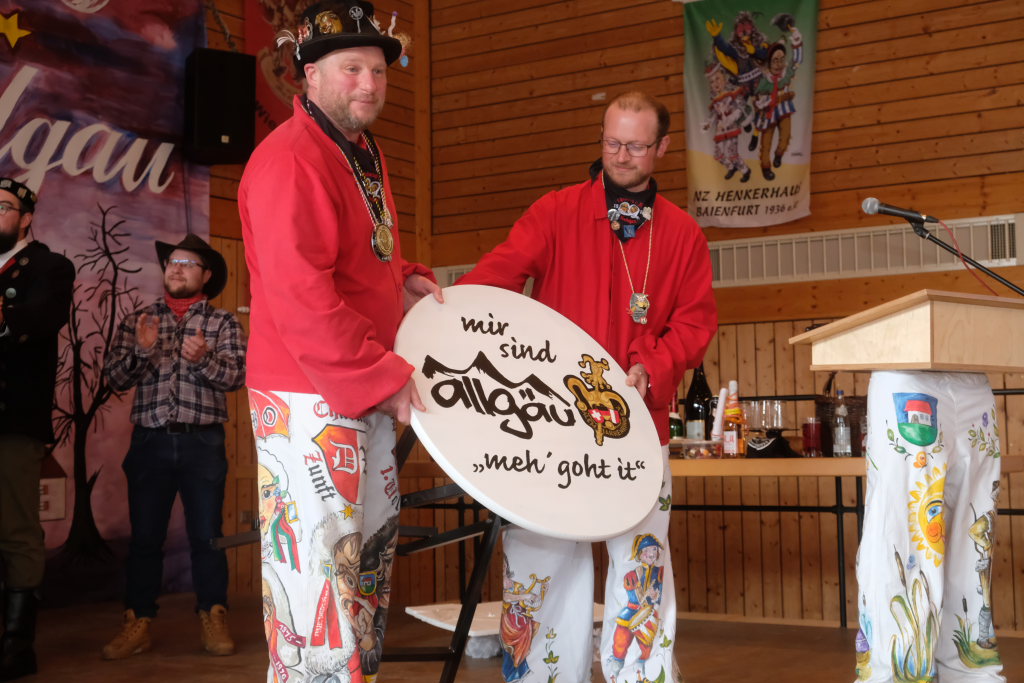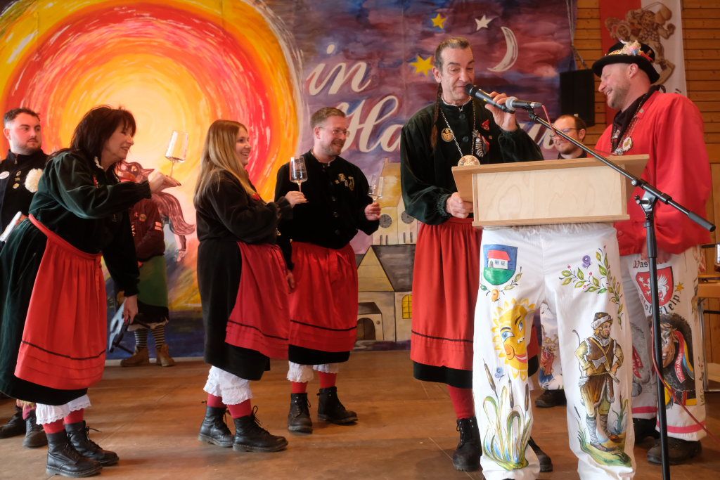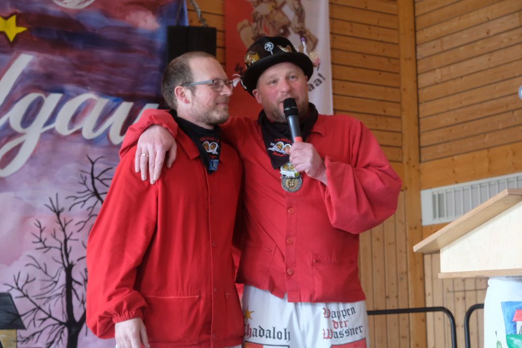 Jürgen Hanser, Oberzunftmeister der Region Allgäu, rekapitulierte vor der Verleihung des Wappenordens an Daniel Wassner dessen närrischen Werdegang. Diesen verleiht der ANR an Zunftmeister, die ein Freundschaftstreffen ausrichten. Daniel Wassner ist seit 1980 aktives Mitglied bei der Narrenzunft, wurde 1995 in den Zunftrat gewählt. Von 2002 bis 2004 war er Vizezunftmeister, ehe er 2005 zum Zunftmeister gewählt wurde. „Er führt den Verein mit Leichtigkeit, aber dennoch mit strengen Zügeln,“ sagte Hanser in seiner Laudatio. Auch wenn ihm die Außendarstellung der Zunft wichtig sei, sei er trotzdem für jeden Spaß zu haben. Neben seinem Einsatz für die Dorfgemeinschaft stelle er sein Organisationstalent seit 2021 auch als Vize-Oberzunftmeister der Region Allgäu zur Verfügung.