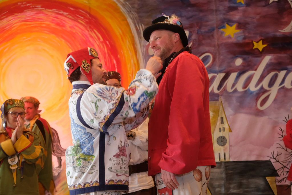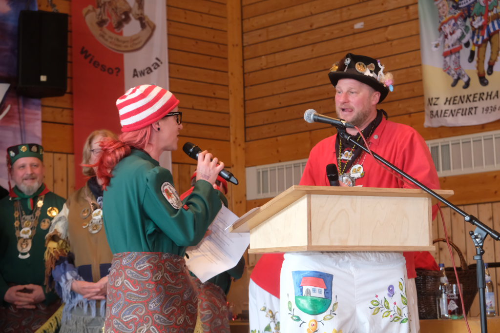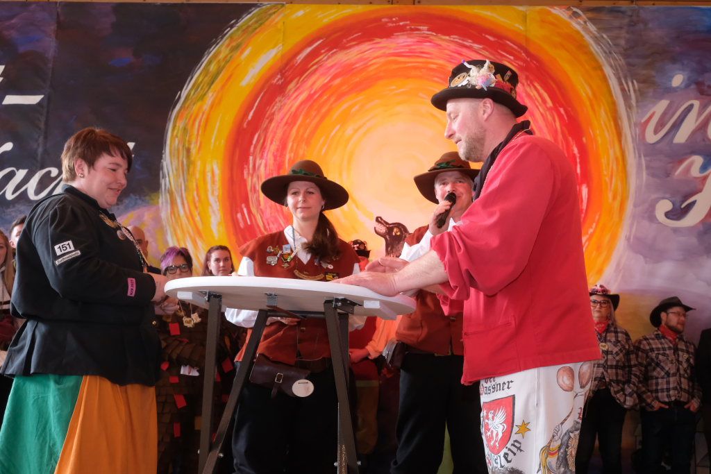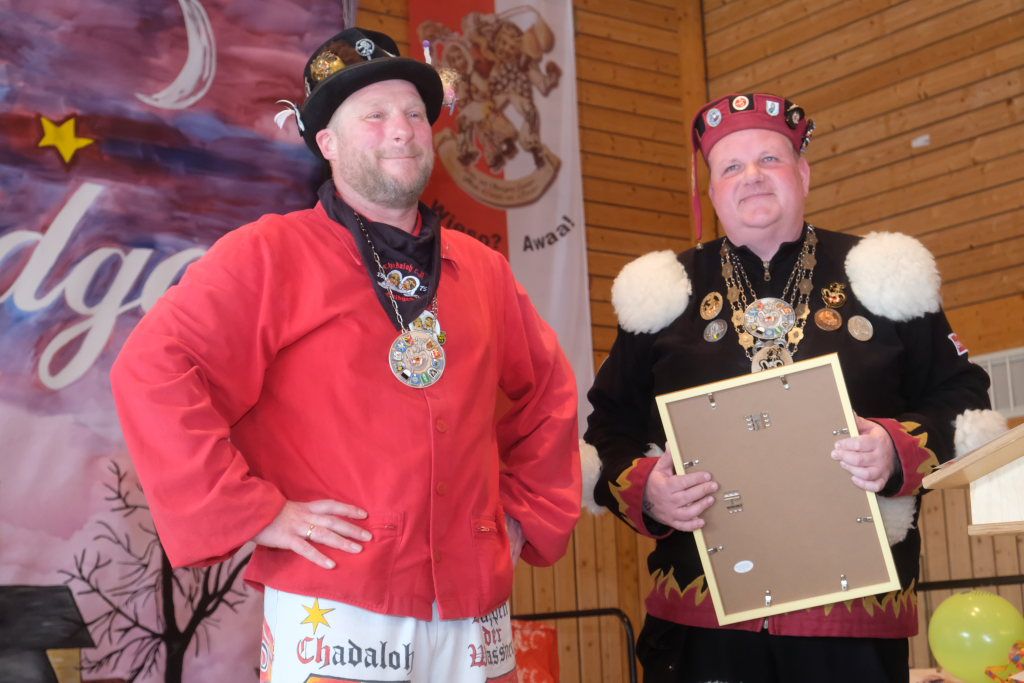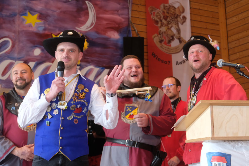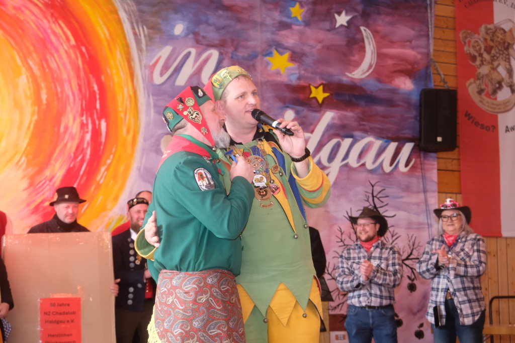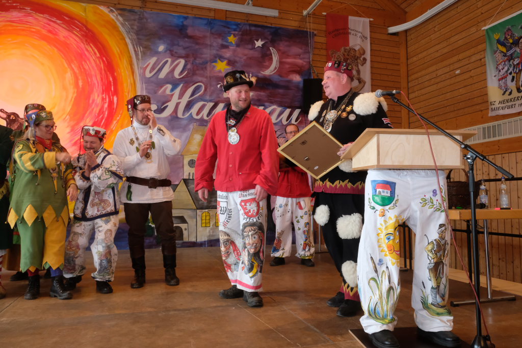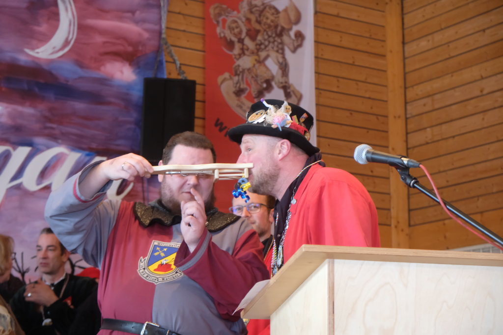 Jürgen Hanser, Oberzunftmeister der Region Allgäu, rekapitulierte vor der Verleihung des Wappenordens an Daniel Wassner dessen närrischen Werdegang. Diesen verleiht der ANR an Zunftmeister, die ein Freundschaftstreffen ausrichten. Daniel Wassner ist seit 1980 aktives Mitglied bei der Narrenzunft, wurde 1995 in den Zunftrat gewählt. Von 2002 bis 2004 war er Vizezunftmeister, ehe er 2005 zum Zunftmeister gewählt wurde. „Er führt den Verein mit Leichtigkeit, aber dennoch mit strengen Zügeln,“ sagte Hanser in seiner Laudatio. Auch wenn ihm die Außendarstellung der Zunft wichtig sei, sei er trotzdem für jeden Spaß zu haben. Neben seinem Einsatz für die Dorfgemeinschaft stelle er sein Organisationstalent seit 2021 auch als Vize-Oberzunftmeister der Region Allgäu zur Verfügung.