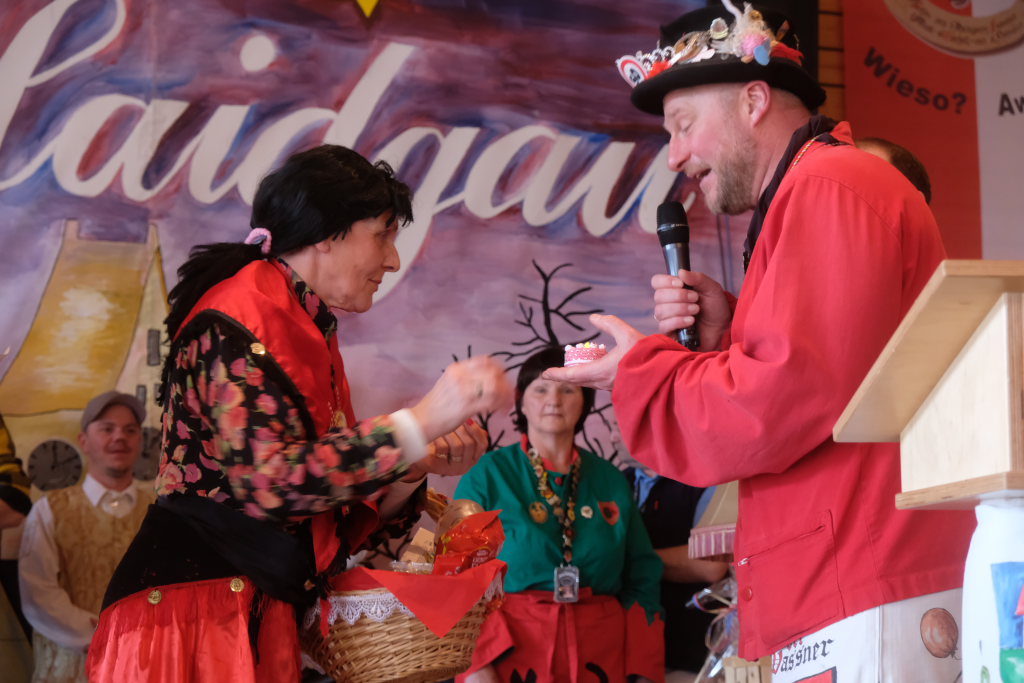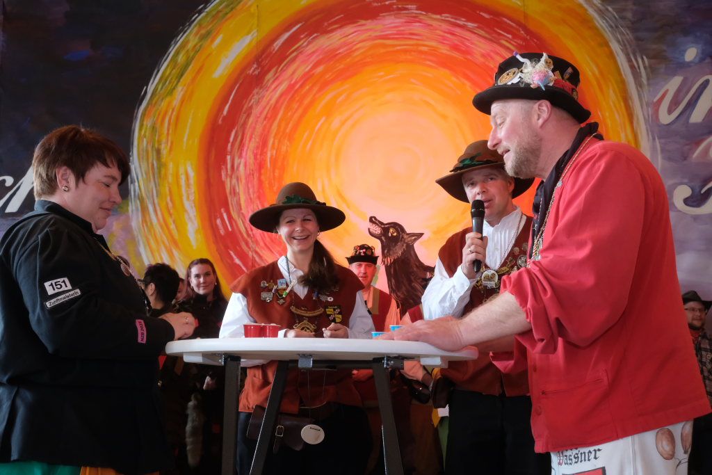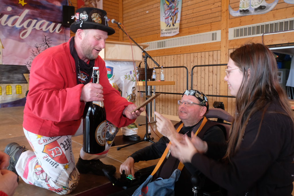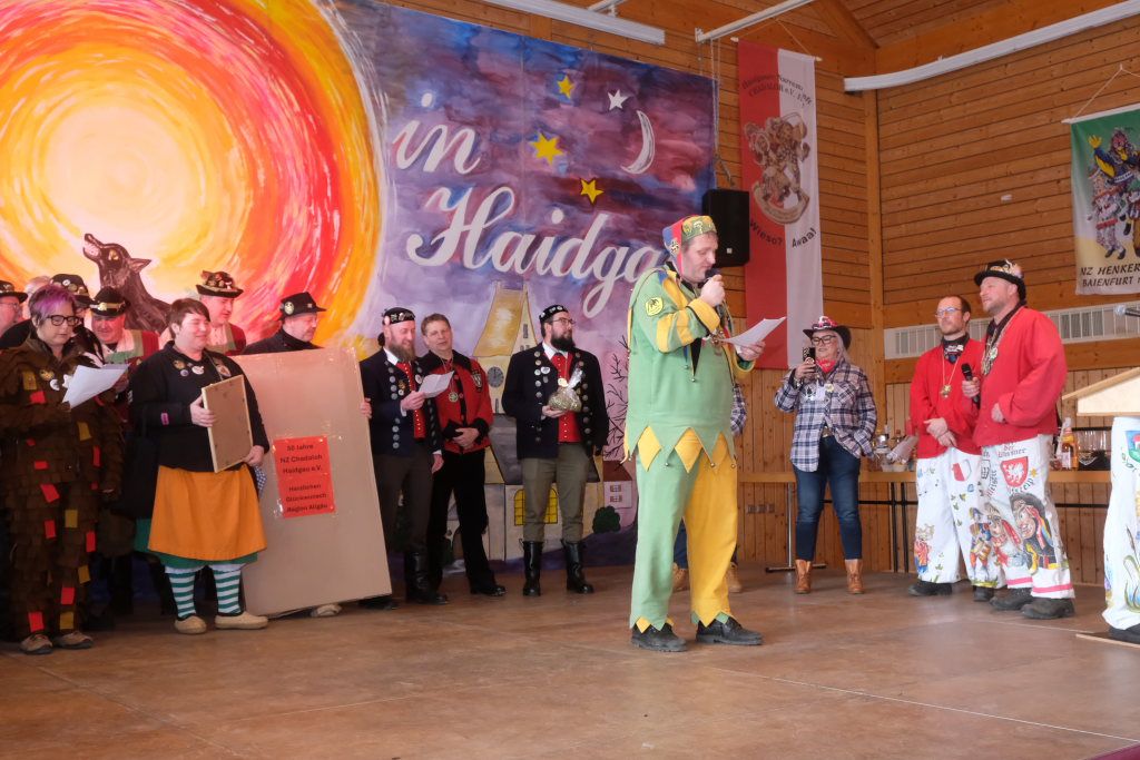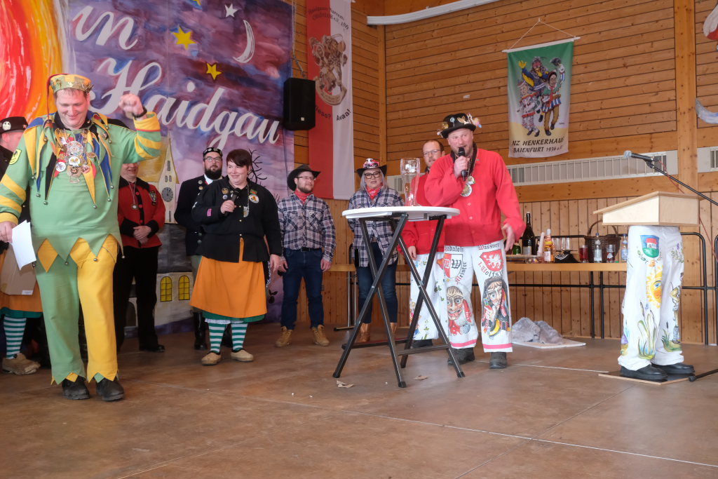 Als besondere Überraschung hatten die Pfluagraicher aus Uttenweiler ihre Schnupftabak -Einschuss-Maschine dabei: Daniel Wassner und sein Vize Peter Rösch durften sich damit auseinandersetzen. Aber sie konnten sich damit trösten, dass sowohl Bürgermeisterin Alexandra Scherer, als auch Ortsvorsteherin Ernestina Frick ebenfalls in diesen Genuss kamen. Zum Haare raufen wurde es für die Organisatoren, als Oberzunftmeister Jürgen Hanser dem Beispiel seines Kollegen folgte, und ebenfalls die ANR-Zünfte aus der Region Allgäu gemeinsam auf die Bühne bat. Diese hatten dem Geburtstagskind eine ganz besondere Geburtstagsgabe – einen Stehtisch mit der Aufschrift : „Mir send Allgäu – me´ goht it“ und dem Wappen des ANR samt dem dazu passenden Trinkgefäß. Doch dafür musste Daniel Wassner etwas tun. Die sangesfähigen Zunftvertreter und Zunftmeister sangen drei Lieder vor, jeweils mit Chadaloh-bezogenen Texten „ Tränen lügen nicht“, „Oh La Paloma“ und „Griechischer Wein“. Wasi musste erraten, welches Lied aus dem Gründungsjahr der Haidgauer Zunft stammt.