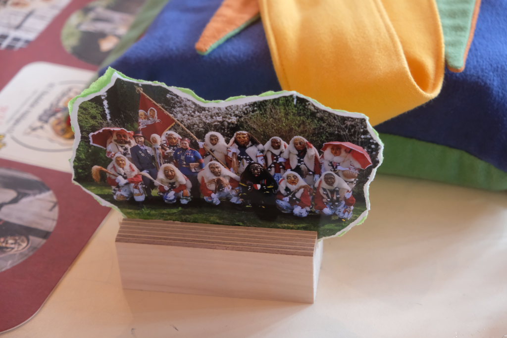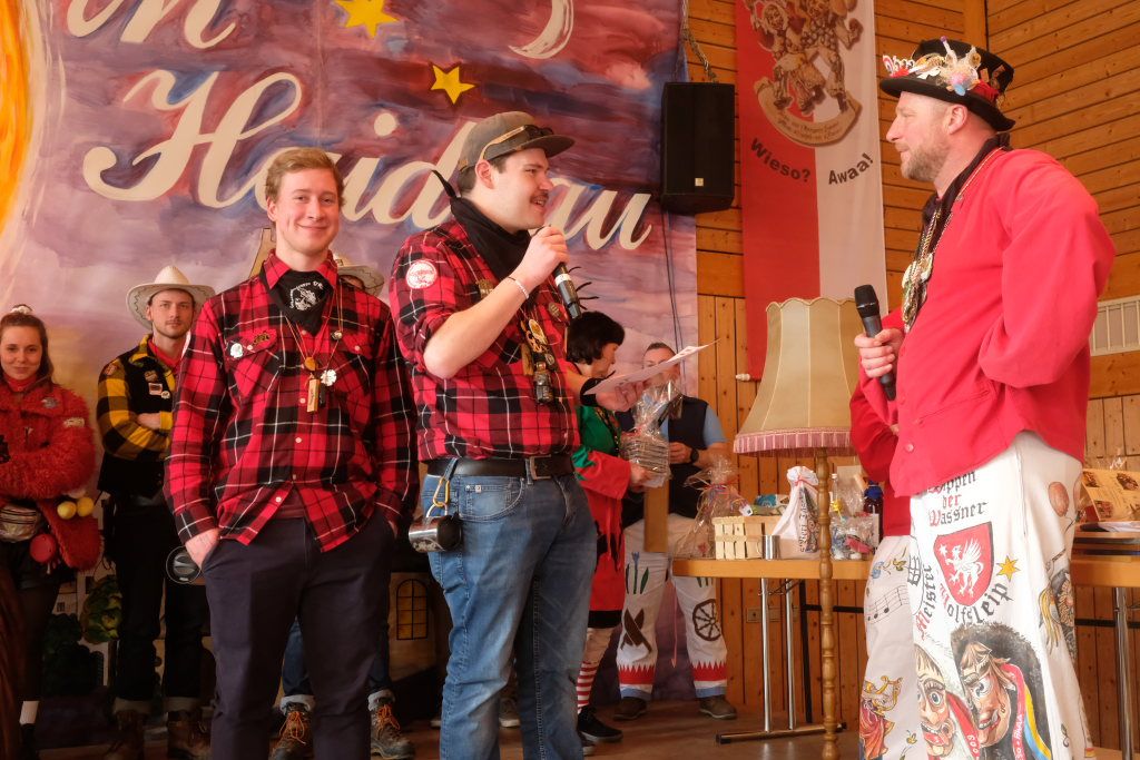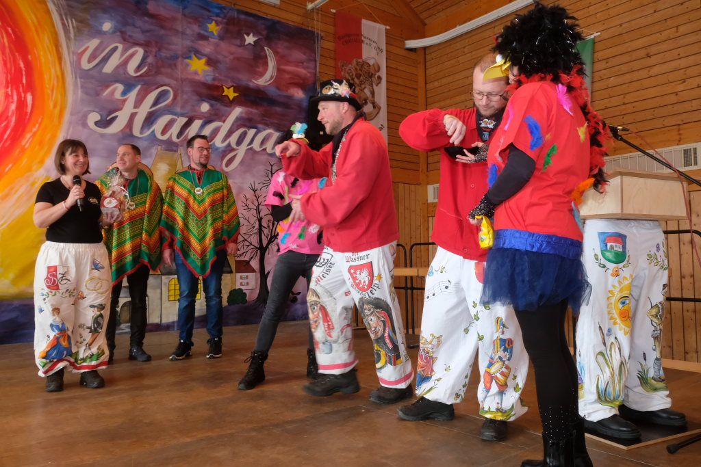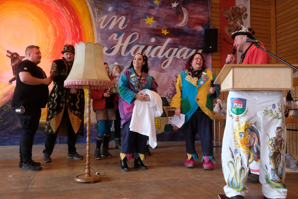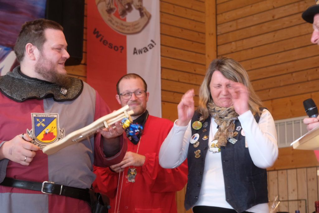 Als besondere Überraschung hatten die Pfluagraicher aus Uttenweiler ihre Schnupftabak -Einschuss-Maschine dabei: Daniel Wassner und sein Vize Peter Rösch durften sich damit auseinandersetzen. Aber sie konnten sich damit trösten, dass sowohl Bürgermeisterin Alexandra Scherer, als auch Ortsvorsteherin Ernestina Frick ebenfalls in diesen Genuss kamen. Zum Haare raufen wurde es für die Organisatoren, als Oberzunftmeister Jürgen Hanser dem Beispiel seines Kollegen folgte, und ebenfalls die ANR-Zünfte aus der Region Allgäu gemeinsam auf die Bühne bat. Diese hatten dem Geburtstagskind eine ganz besondere Geburtstagsgabe – einen Stehtisch mit der Aufschrift : „Mir send Allgäu – me´ goht it“ und dem Wappen des ANR samt dem dazu passenden Trinkgefäß. Doch dafür musste Daniel Wassner etwas tun. Die sangesfähigen Zunftvertreter und Zunftmeister sangen drei Lieder vor, jeweils mit Chadaloh-bezogenen Texten „ Tränen lügen nicht“, „Oh La Paloma“ und „Griechischer Wein“. Wasi musste erraten, welches Lied aus dem Gründungsjahr der Haidgauer Zunft stammt.
