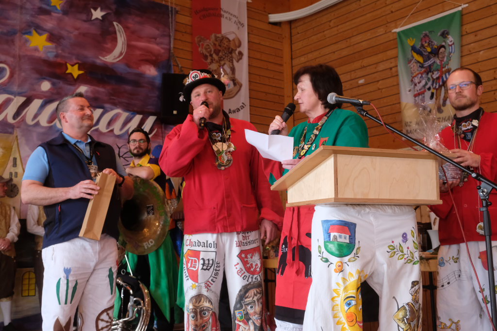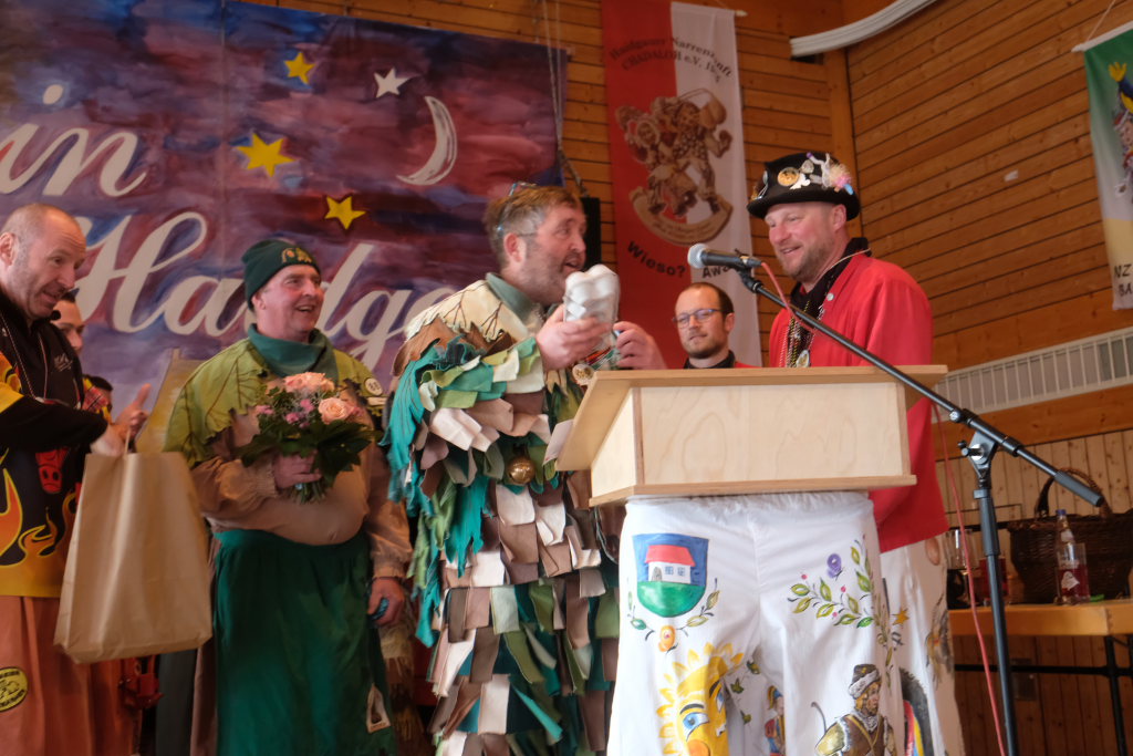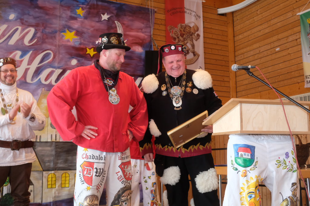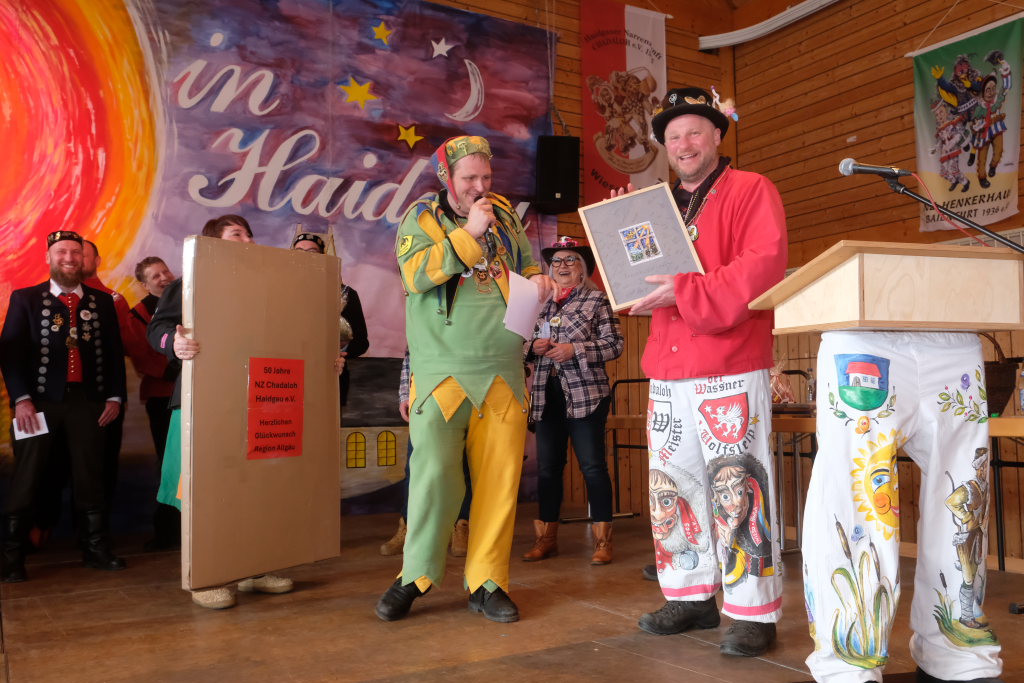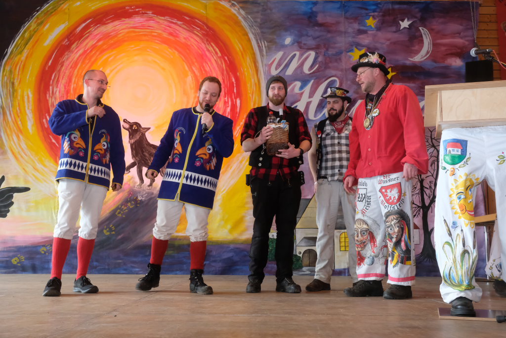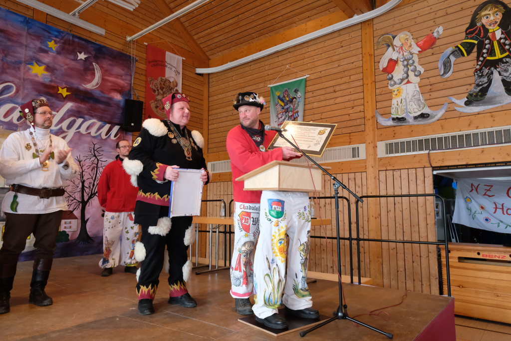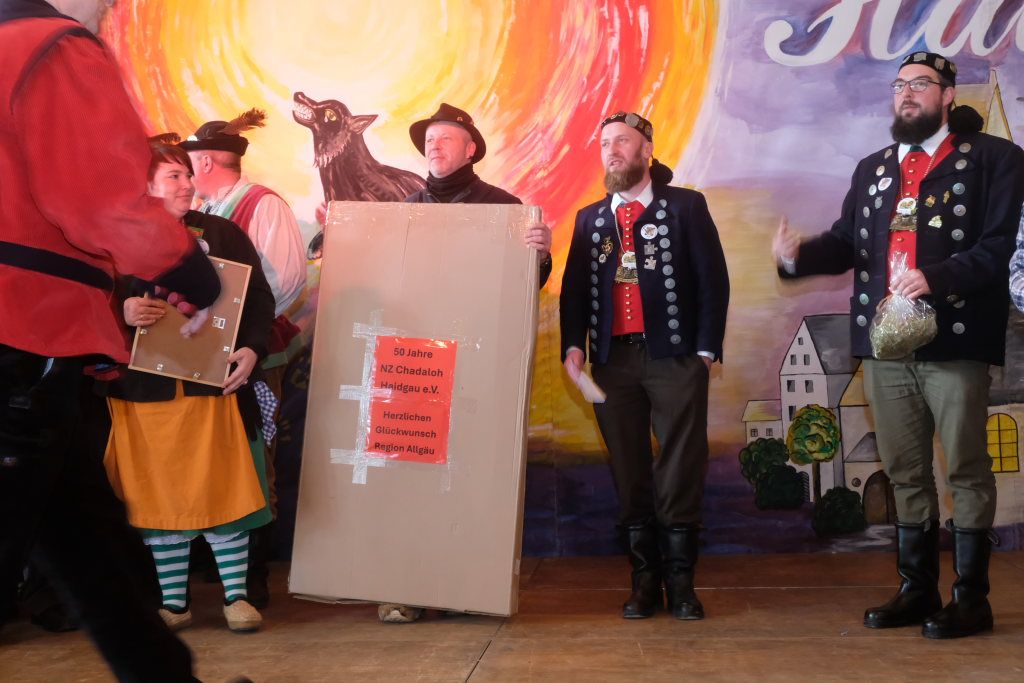 Die Bad Wurzacher Riedmeckeler mit Zunftmeister Dominic Neher wiesen auf ihre Spendenaktion statt Gastgeschenke hin, wollten jedoch nicht mit leeren Händen kommen. Franz-Josef Maier machte Werbung in eigener Sache mit dem Hinweis auf das 60-jährige Jubiläum des Fanfarenzugs Bad Wurzach im Sommer. Er brachte – Nachhaltigkeit musste sein – einen Kanister des guten Glühweins mit, der beim Weihnachtsmarkt übrig geblieben sei. Von Willi Butscher, dem Chef der Langjuppen aus Seibranz gab es ein praktisches Kehrschaufel-Set. Die Hoigamer Stroaßa Hup´r machten die Wohnungseinrichtung im Hause des Chadaloh-Chefs mit einer Stehlampe komplett. Von der einheimischen Konkurrenz, der Haidgauer Sippe, bekam Wassner eine liebevoll handgefertigte Chadaloh-Stabpuppe und Oliver Herz, der ehemalige Dirigent der MK Ziegelbach, überbrachte mit seiner Trompete und einem Bassisten der Allgäu Long Dongs einen musikalischen Geburtstagsgruß.