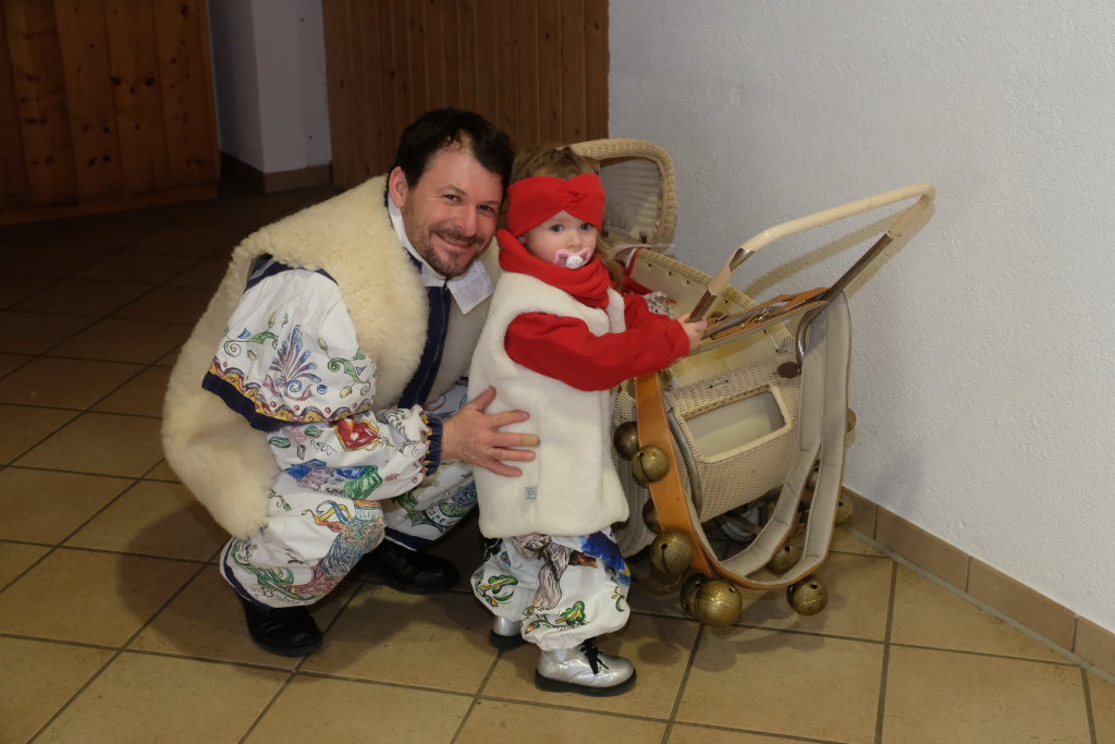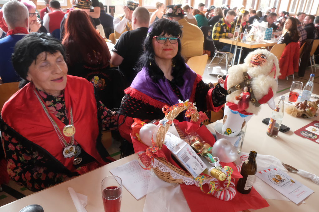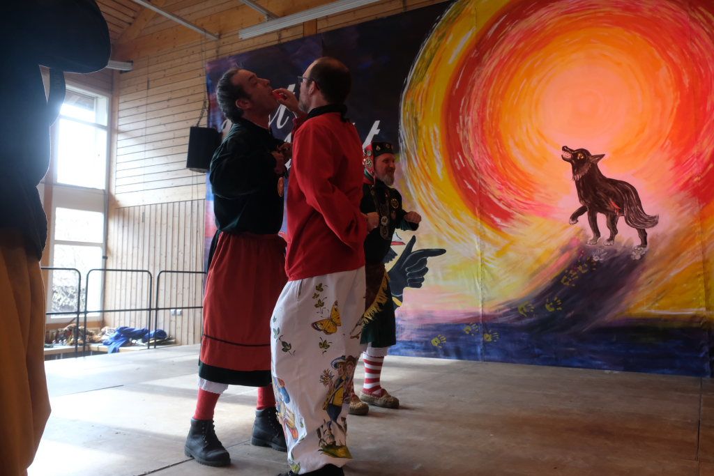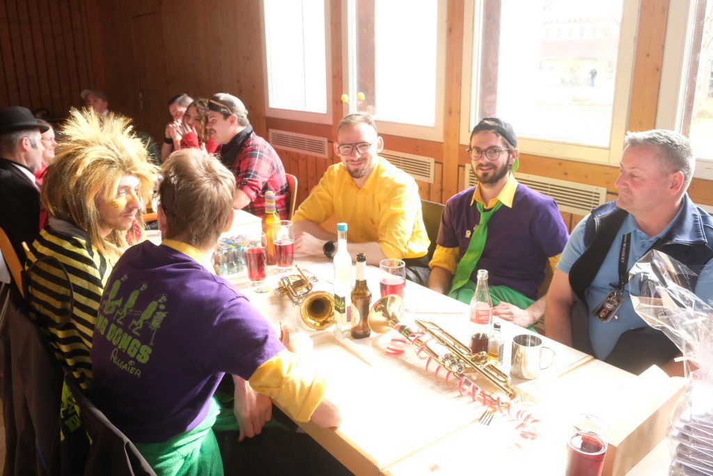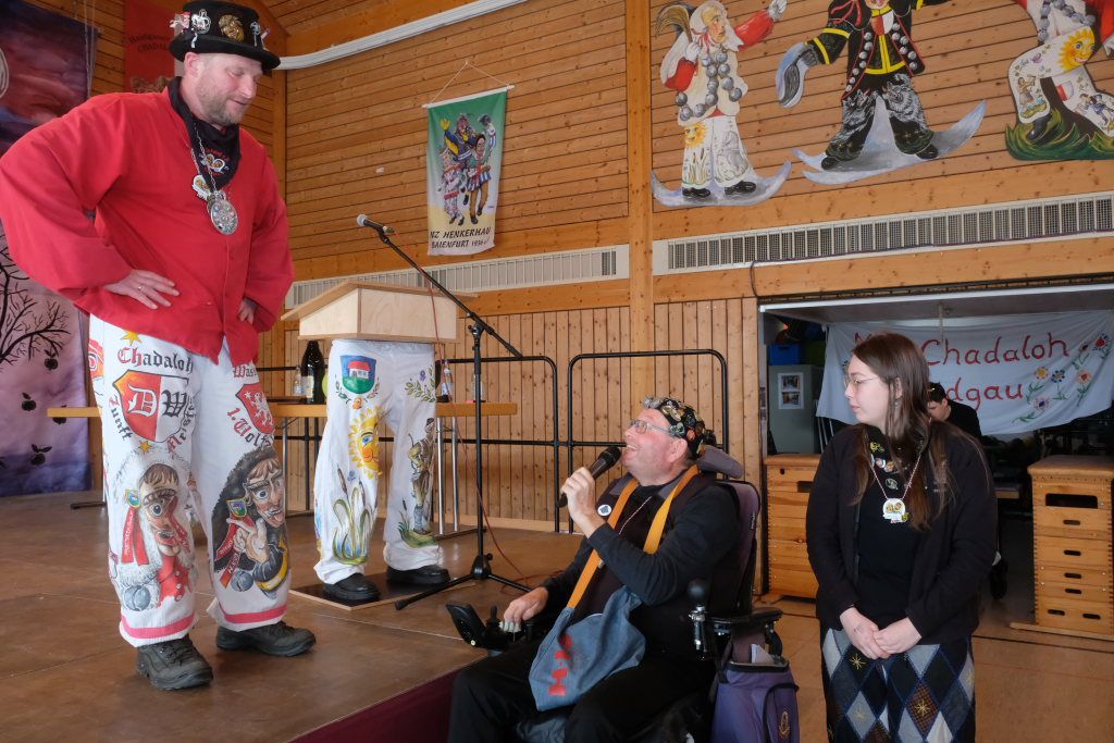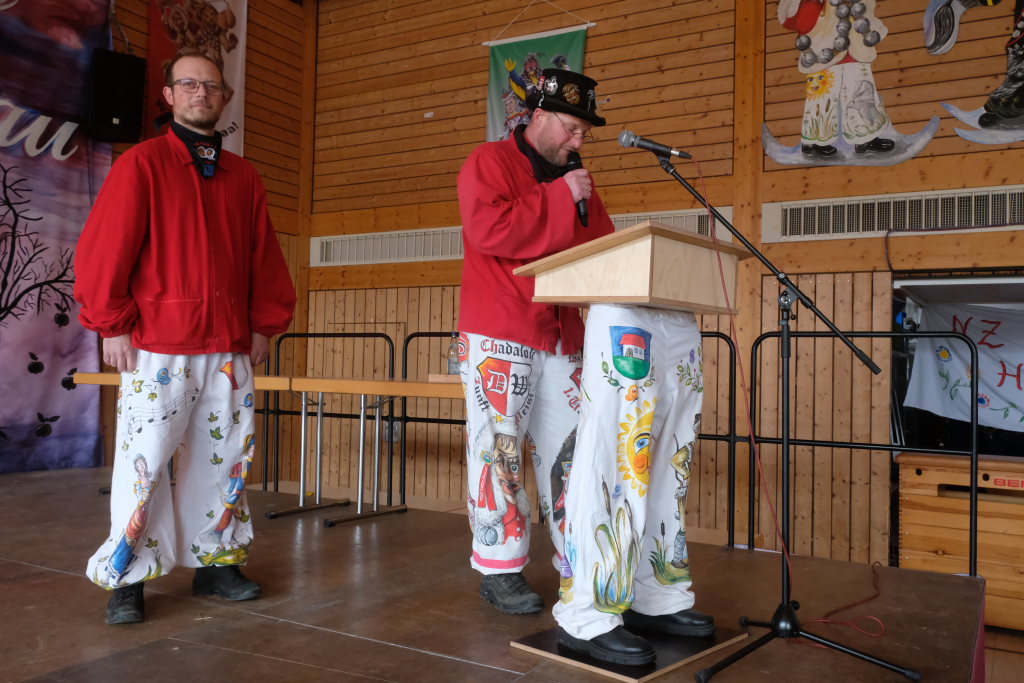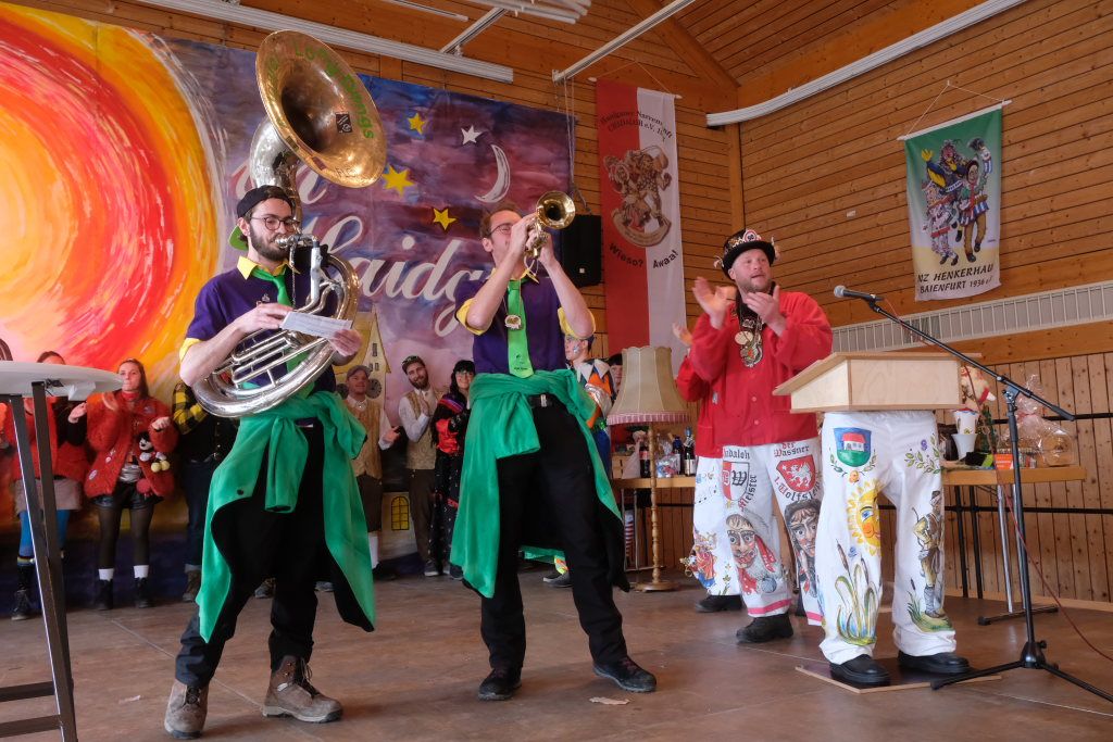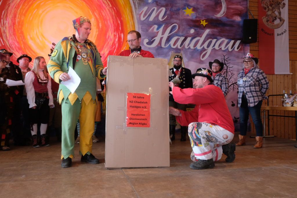 Die Bad Wurzacher Riedmeckeler mit Zunftmeister Dominic Neher wiesen auf ihre Spendenaktion statt Gastgeschenke hin, wollten jedoch nicht mit leeren Händen kommen. Franz-Josef Maier machte Werbung in eigener Sache mit dem Hinweis auf das 60-jährige Jubiläum des Fanfarenzugs Bad Wurzach im Sommer. Er brachte – Nachhaltigkeit musste sein – einen Kanister des guten Glühweins mit, der beim Weihnachtsmarkt übrig geblieben sei. Von Willi Butscher, dem Chef der Langjuppen aus Seibranz gab es ein praktisches Kehrschaufel-Set. Die Hoigamer Stroaßa Hup´r machten die Wohnungseinrichtung im Hause des Chadaloh-Chefs mit einer Stehlampe komplett. Von der einheimischen Konkurrenz, der Haidgauer Sippe, bekam Wassner eine liebevoll handgefertigte Chadaloh-Stabpuppe und Oliver Herz, der ehemalige Dirigent der MK Ziegelbach, überbrachte mit seiner Trompete und einem Bassisten der Allgäu Long Dongs einen musikalischen Geburtstagsgruß.