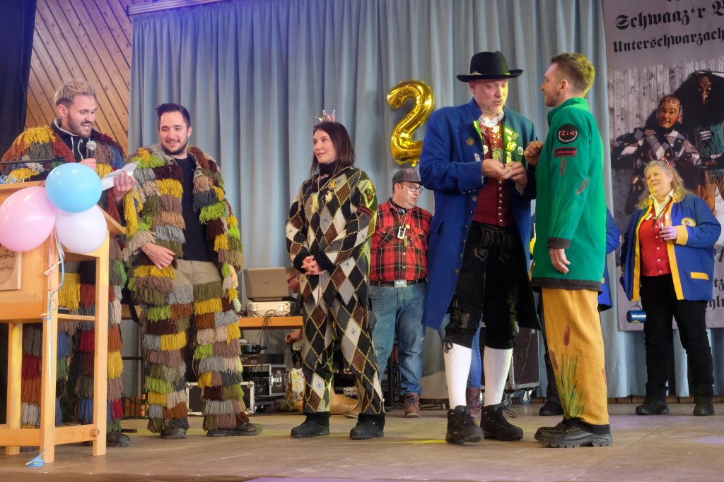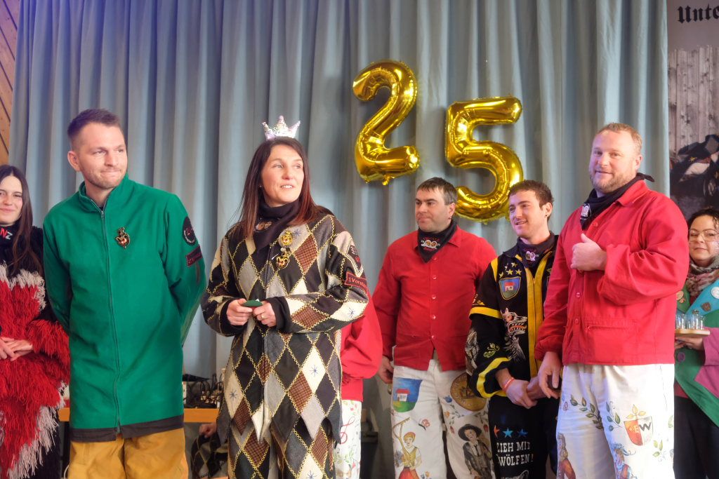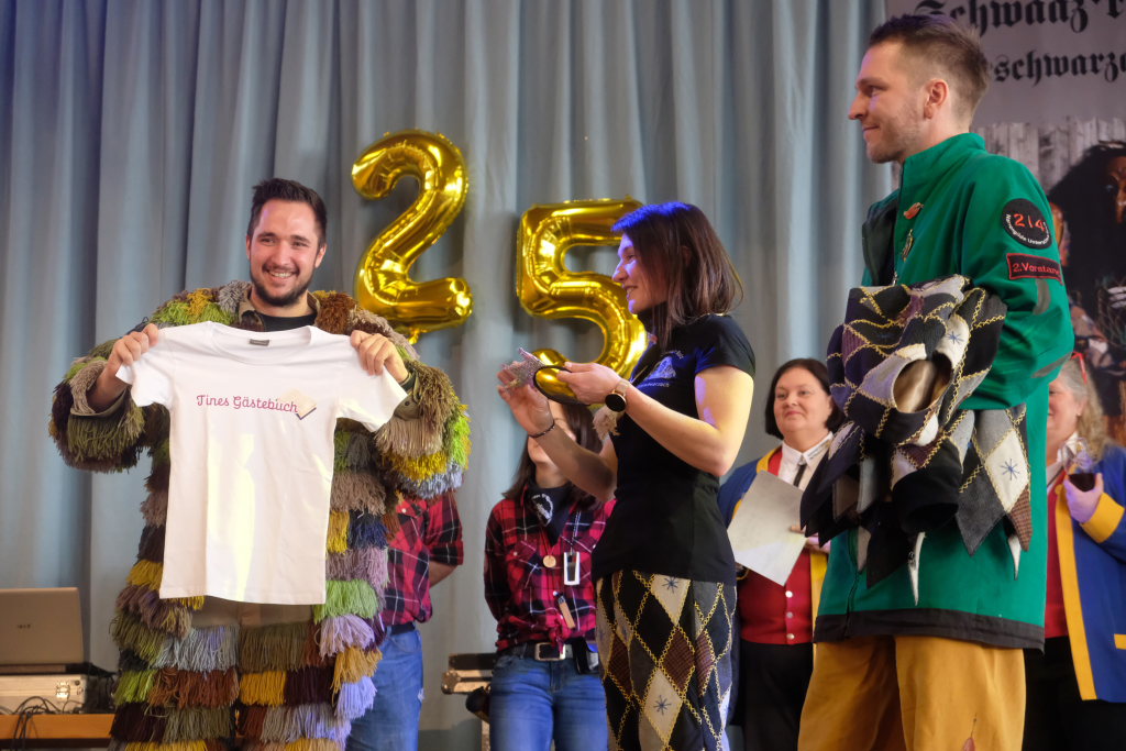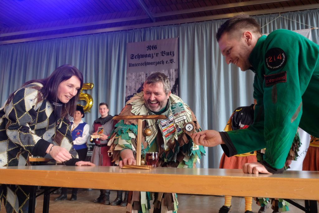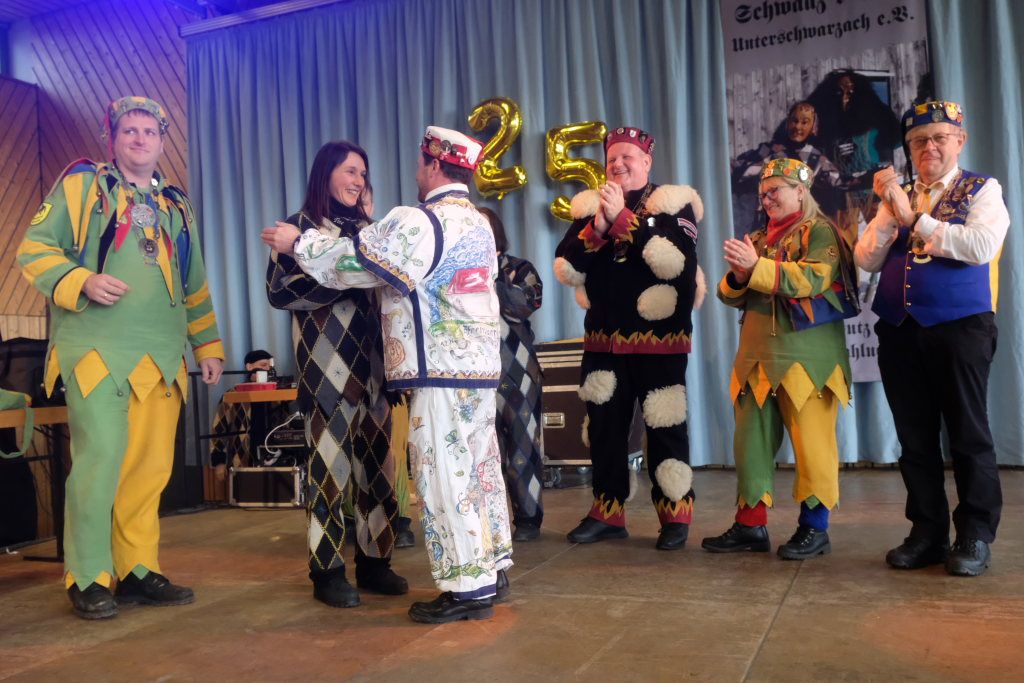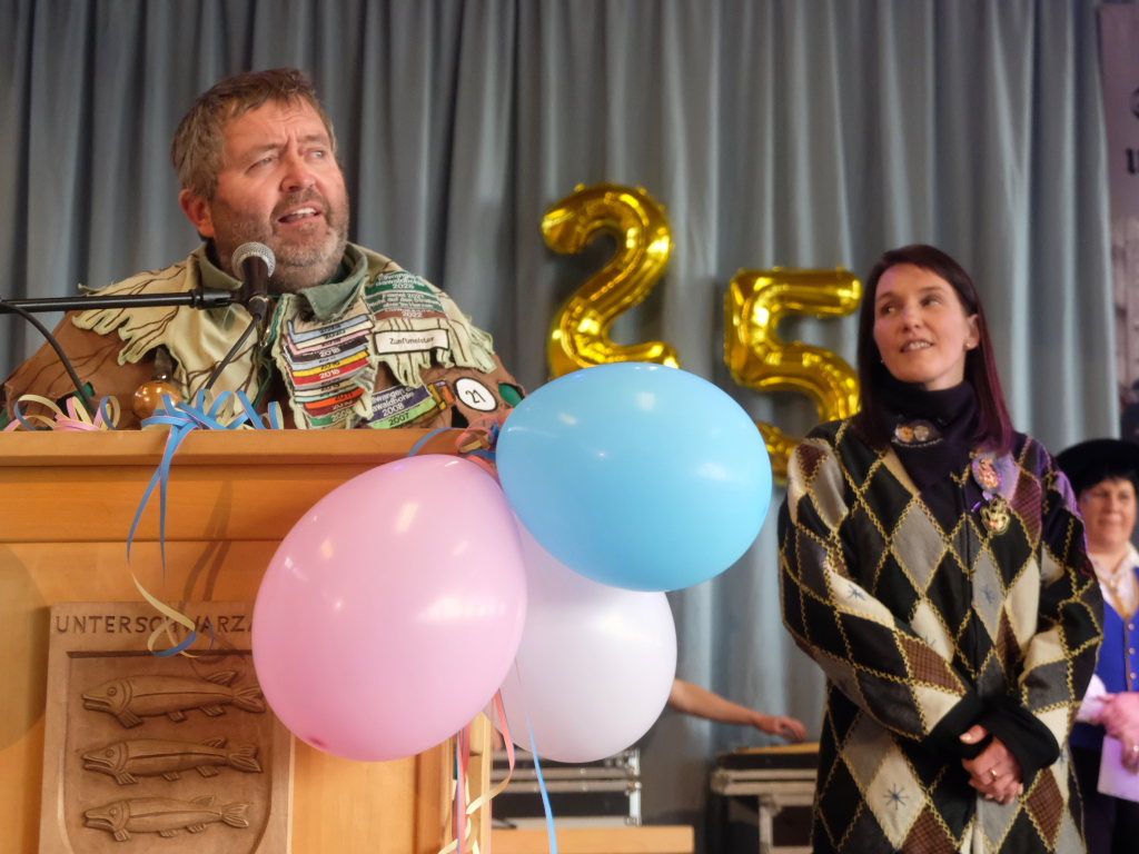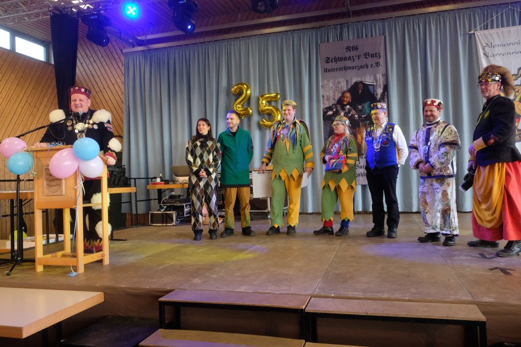 Die Narrengilde Unterschwarzach, die seit 2013 dem ANR angehört, feierte am vergangenen Samstag (25.1.) mit einem kleinen Narrensprung ihr 25-jähriges Jubiläum (siehe Extra-Bericht). Beim Zunftmeisterempfang am Vormittag wurden Vize Stefan Kiebler und Säckelmeisterin Claudia Vögele auf Antrag des Vereins mit dem Hästrägerorden des ANR (Alemannischer Narrenring) ausgezeichnet. Die Ehrung für Zunftmeisterin Bettina „Tine“ Zelzer mit dem Silberkranz-Orden des ANR erfolgte auf die Initiative des ANR und machte die sonst so eloquente Narrenmeisterin sprachlos.