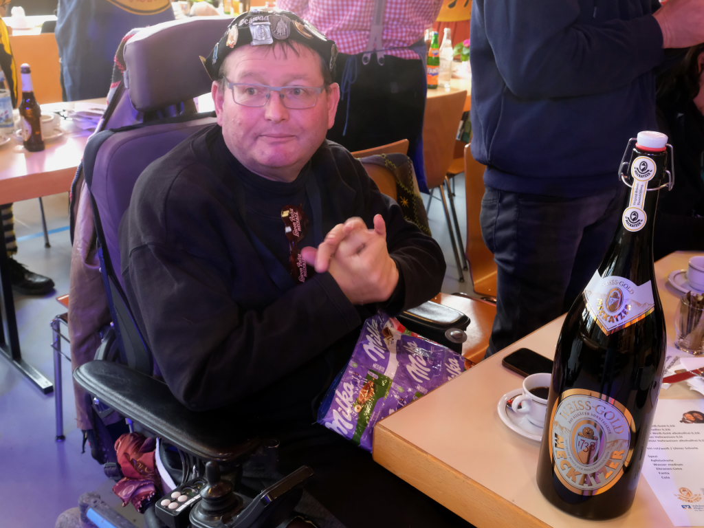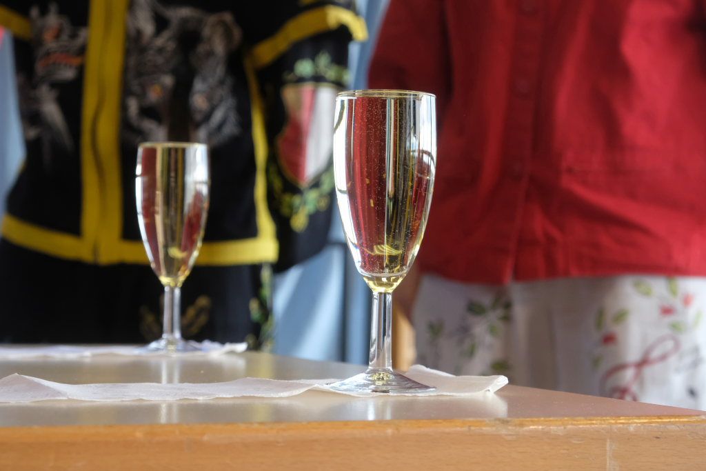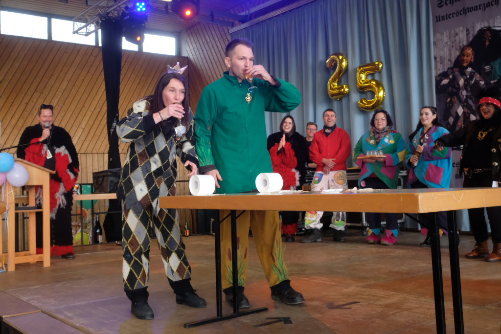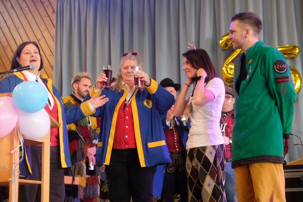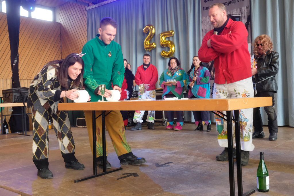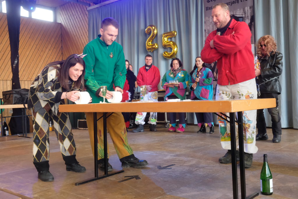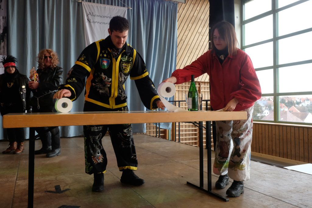 Die Patenzunft der Haidgauer Chadaloh ließ sie gemeinsam mit den Aichstettener Goischderhund im Wettstreit zwei randvolle Sektgläser auf Klopapier zu sich heranziehen.