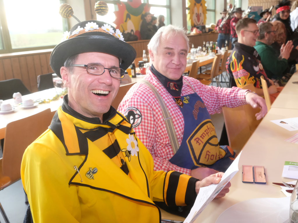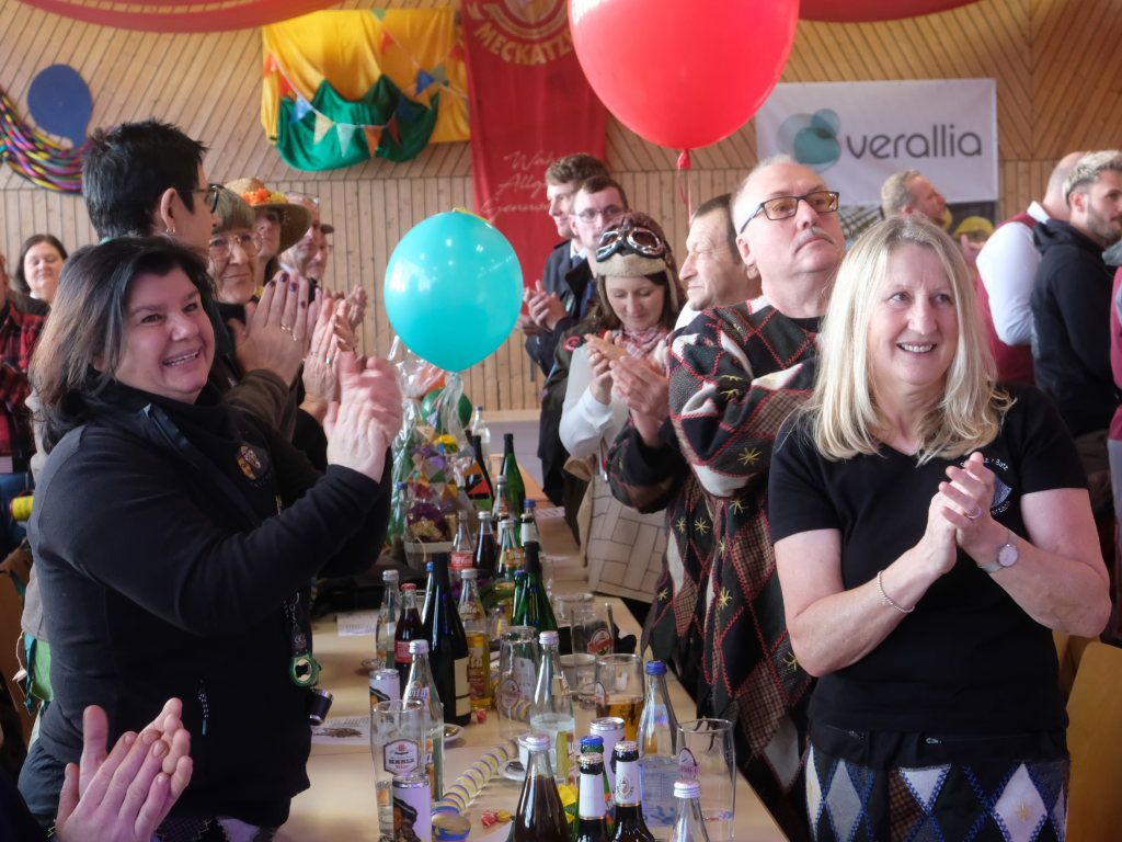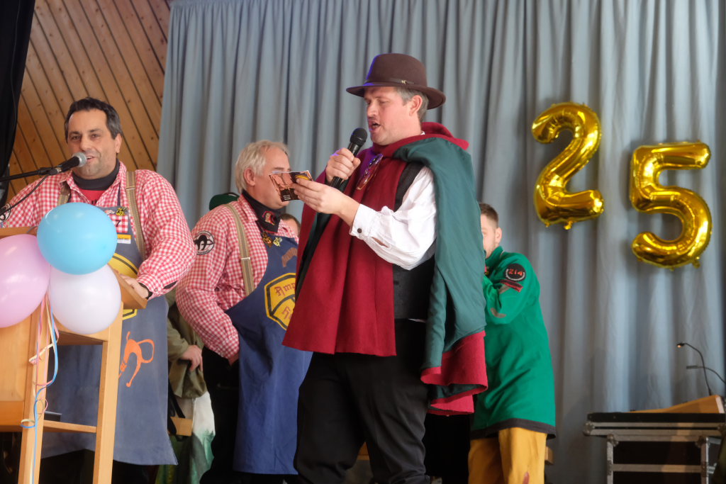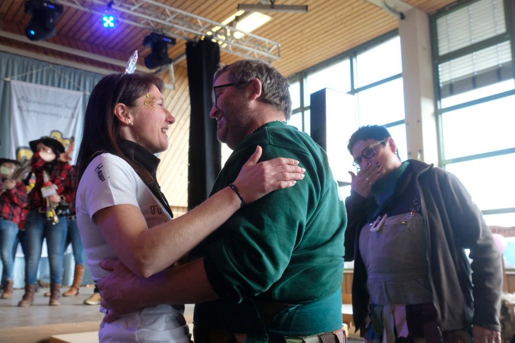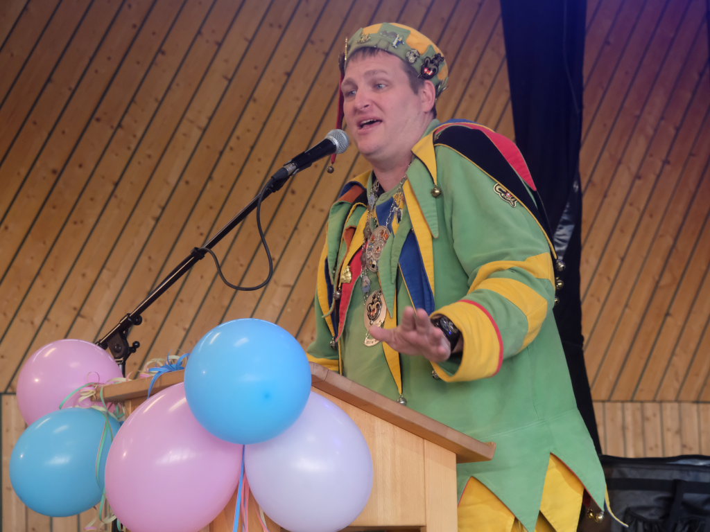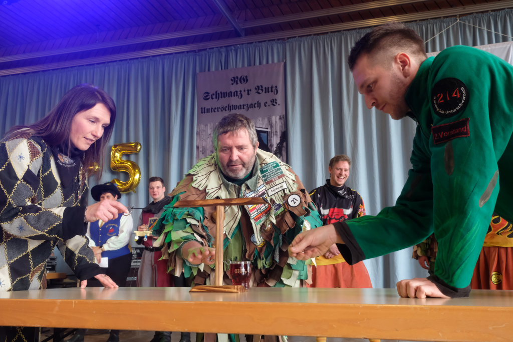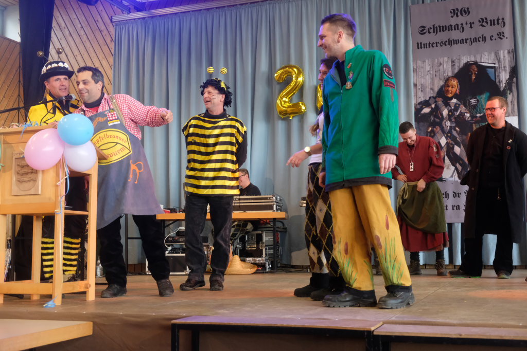 In das Lied vom Most stimmte auch Zunftmeister der Seibranzer Langjuppen, Willi „Willi-Bu“ Butscher mit ein, der zuvor an die Unterschwarzacher Zunftführung zwei bezaubernde Minihäser von Butz und Gumpa-Ma überreicht hatte. Kein Wunder ist Willi-Bu doch Sänger beim Männerchor „Frohsinn“. Eine Wette verlor Tine Zelzer übrigens gegen die Hummel-Gruppe, denn diese brachte mehr als 50 Mitglieder zum „Mit-Jucken“ nach Usa.