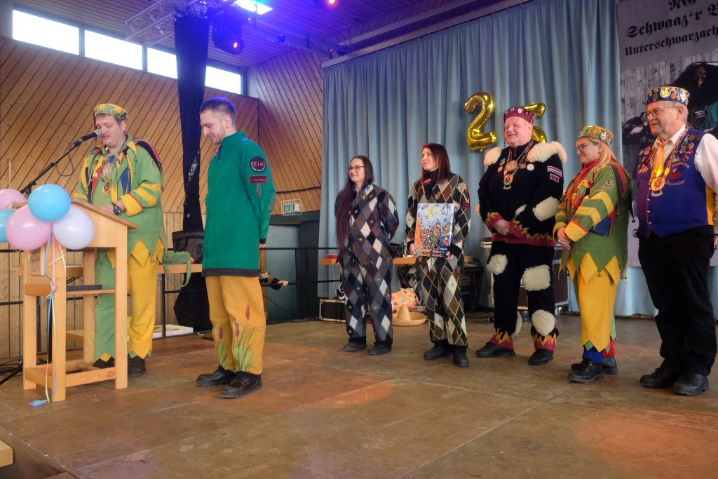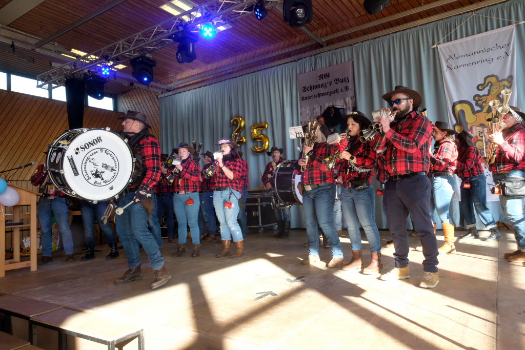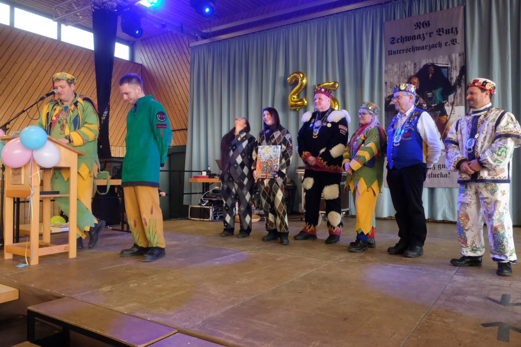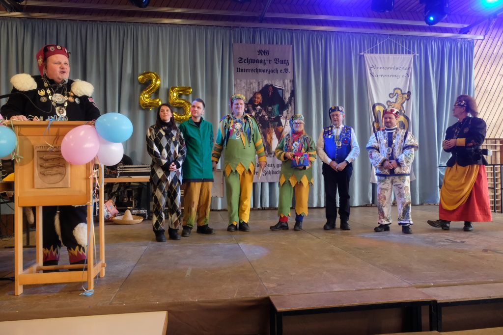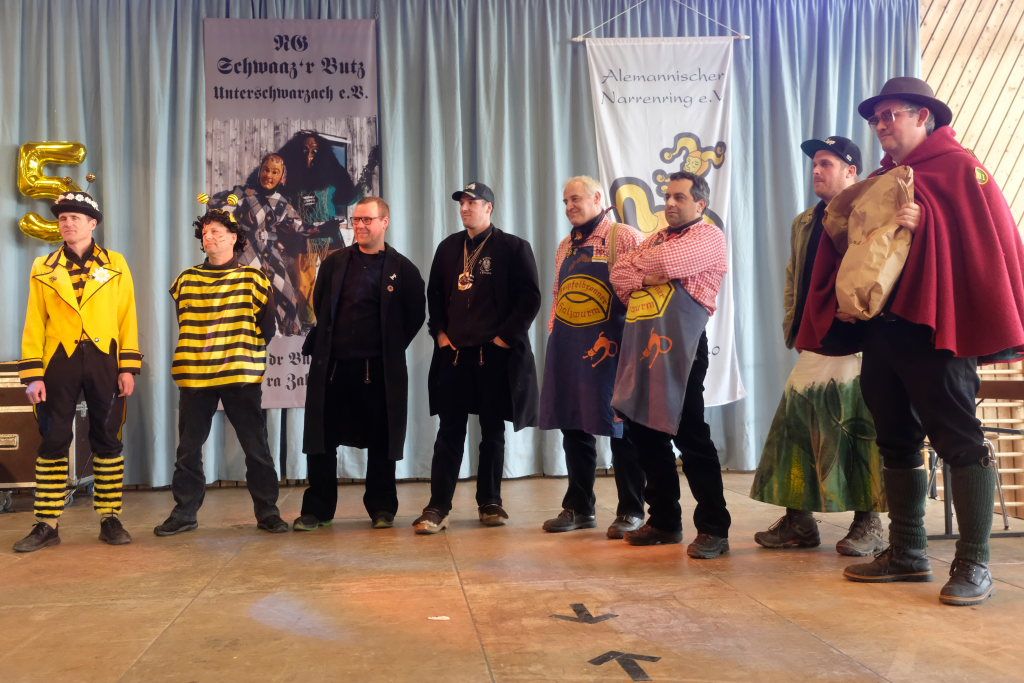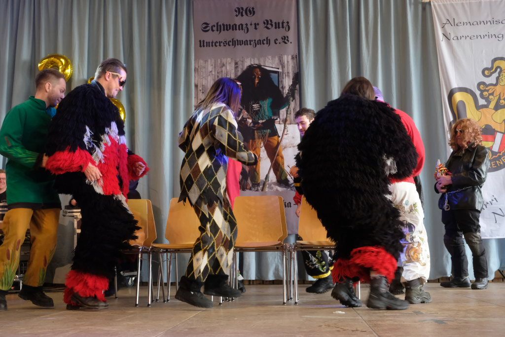 Mit dem Musikverein Harmonie, dem Kindergarten (Narrenruf: „Hurra, Hurra dr Kindi isch do“) und der Grundschule Unterschwarzach (Narrenruf „Bei uns wachst alles“) stellten sich mit Ausnahme der „Schwaaz´r Gang“ zunächst die ortseigenen Gruppen vor. Die dann gleich mit dem Lied vom Schwaaz´r Butz die Stimmbänder der Zunftmeister auf die Probe stellten.