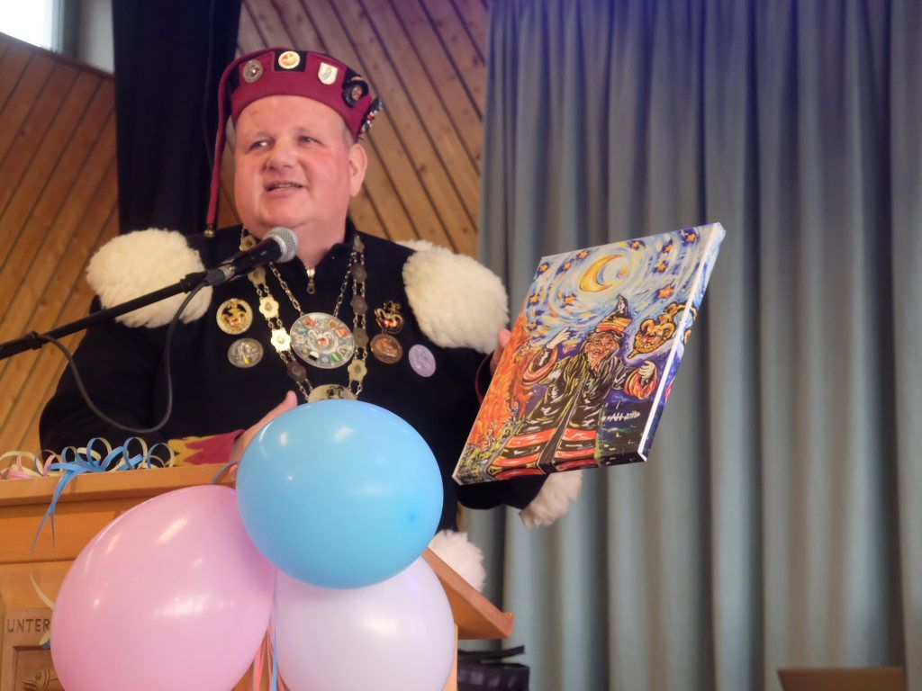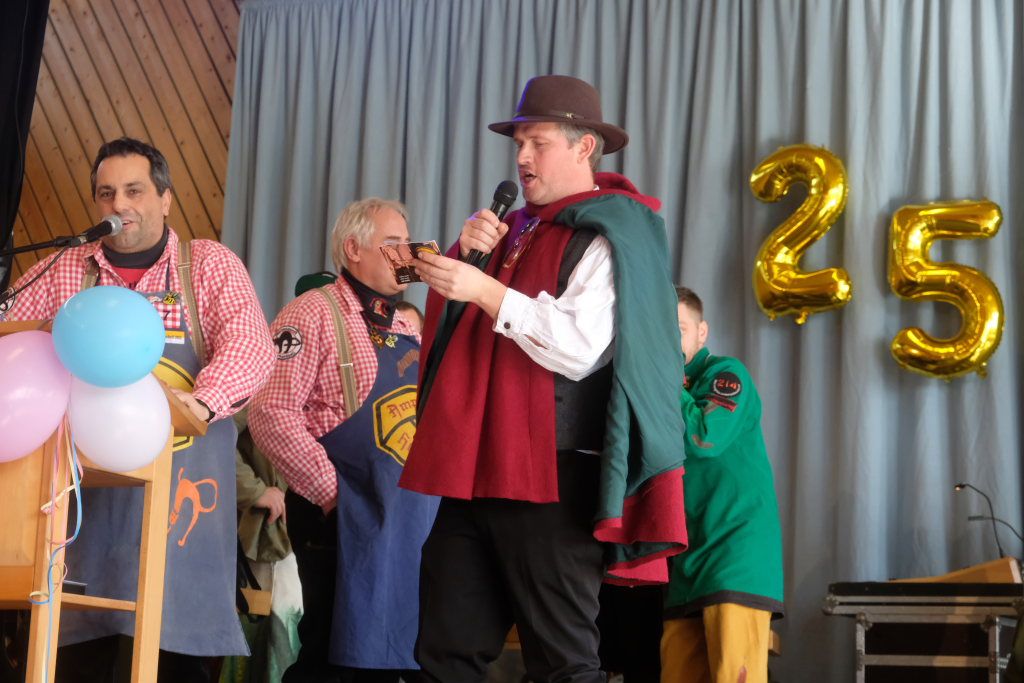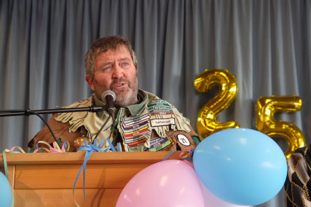 Dann trat der Präsident des ANR Markus Stark ans Rednerpult. Er war gemeinsam mit dem Oberzunftmeister der Region Allgäu Jürgen Hanser, der Protokollerin Anita Kauschinger, Schatzmeister Fridolin Aierstock und dem Brauchtumer Andreas Heine zum Jubiläum nach Unterschwarzach gekommen. Stark hatte als Gastgeschenk eine Abbildung des ANR-Hexenmeisters mitgebracht. Jürgen Hanser oblag es, die Ehrungen durchzuführen.