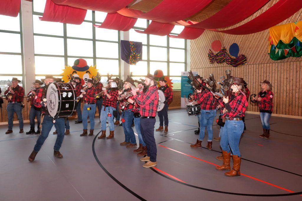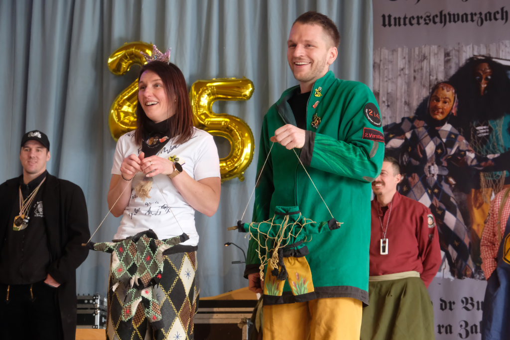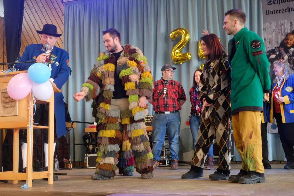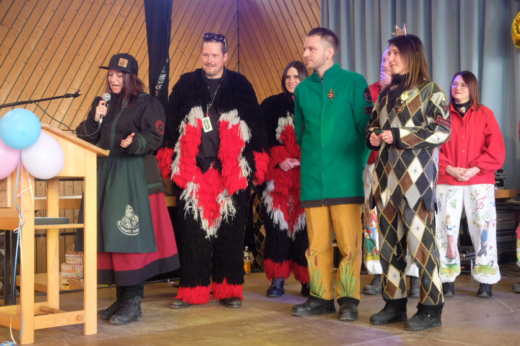 Erstmals in seiner bisher 25-jährigen Geschichte richtete die Narrengilde Schwaaz´r Butz Unterschwarzach einen Narrensprung aus. Davor fand der Zunftmeisterempfang in der Festhalle statt. Nach der musikalischen Eröffnung durch die Schalmeien „d´Riedspatzen“, die damit die Halle schon mal auf Betriebstemperatur brachte, trat die aktuelle Zunftmeisterin Bettina Zelzer gemeinsam mit ihrem Vize Stefan Kiebler ans Mikrophon, um Vorgänger/innen Petra Münsch und Michaela Moos sowie Paul Riss zu begrüßen.