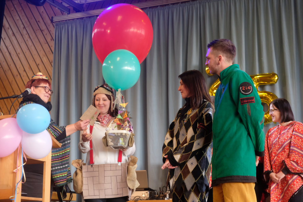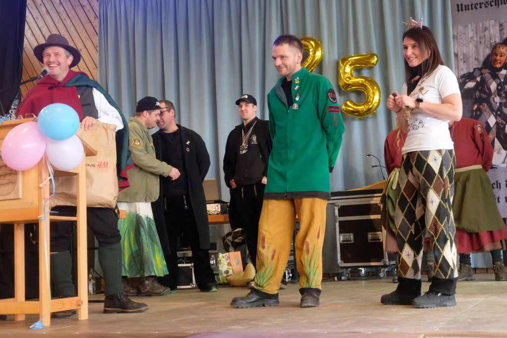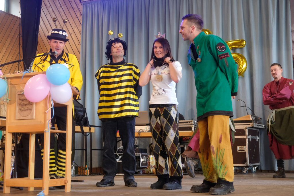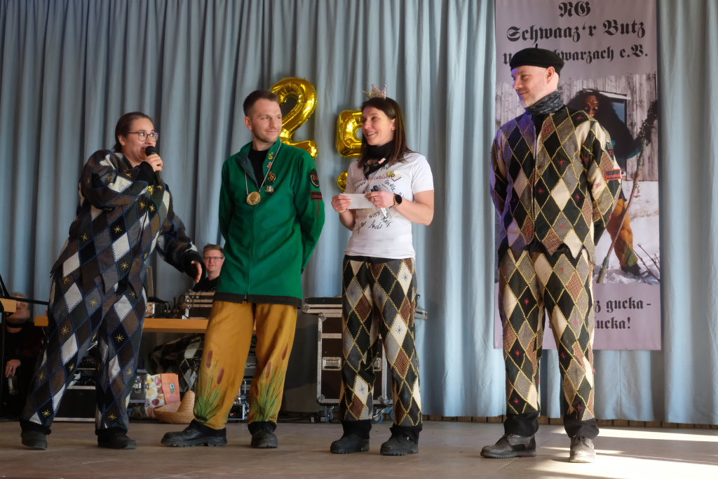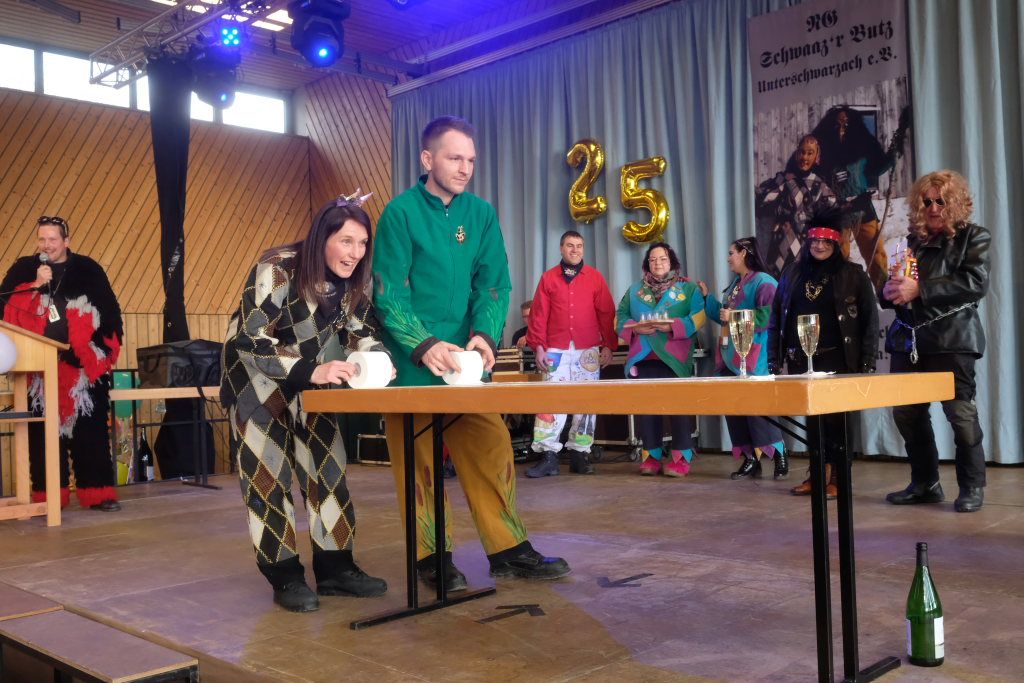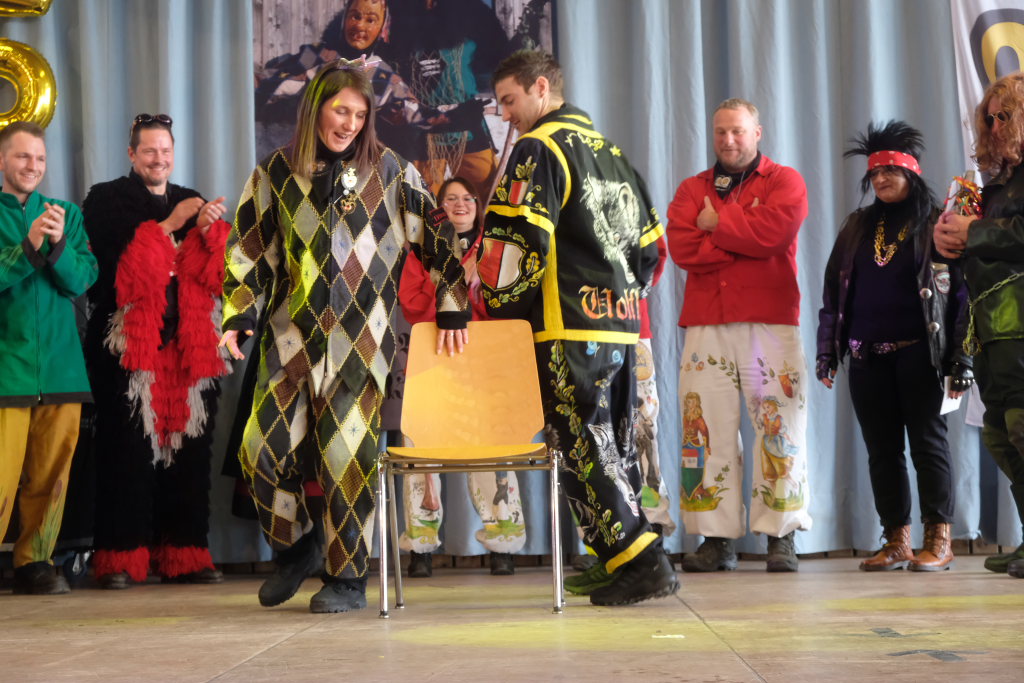 Ein nostalgisches Spiel hatten die Hoigamer Stroaßa Hup´r im Gepäck: Die „Reise nach Jerusalem“ endete für Daniel Wassner, Zunftmeister der Chadaloh, die in wenigen Wochen exakt doppelt so alt werden wie die Schwaaz´r Butz, nach einem Tête-à-Tête mit Tine Zelzer, der späteren Siegerin, mit einem eleganten Abroller auf dem Bühnenboden.