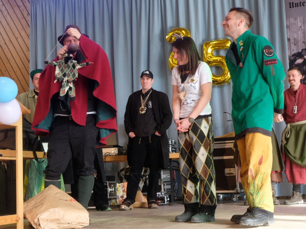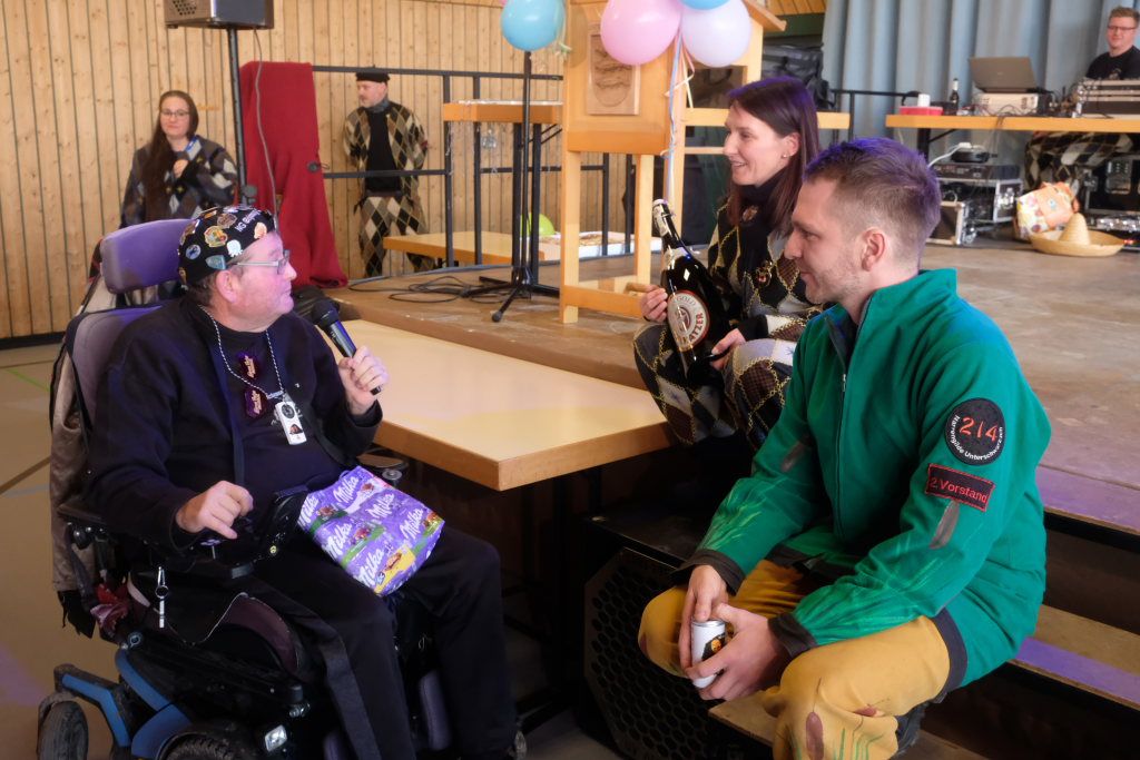 Natürlich kam Günther „Turbo“ Angele, legendärer Zunftmeister der Bahwaldbohle aus dem benachbarten Ellwangen und beim ersten Unterschwarzacher Narrensprung als Streckensprecher tätig, nicht mit leeren Händen, so dass Tine Zelzer und ihr Vize gleich einmal ihre erste Herausforderung meistern mussten. Einen besonderen Genuss verpassten den Beiden die Pflugraicher aus Uttenweiler mit ihr Schnupftabakmaschine.