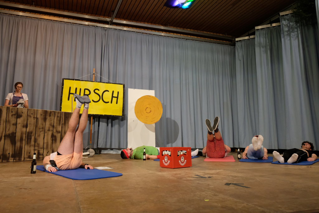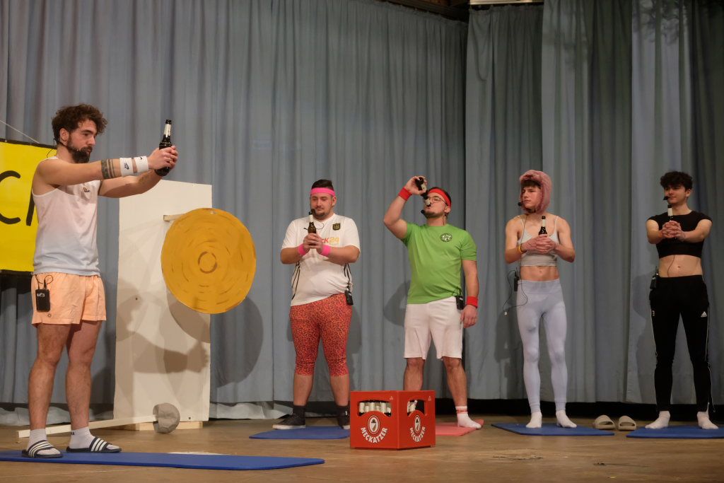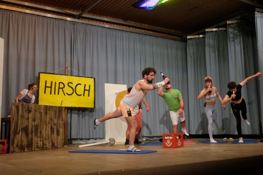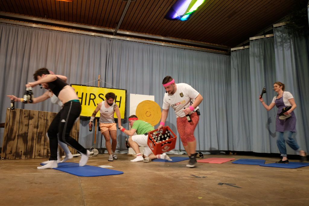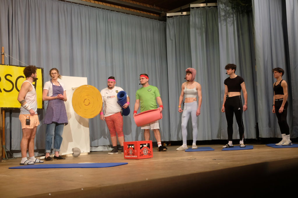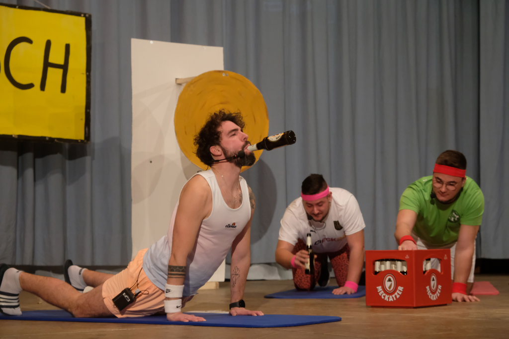 Mit den Gardemädchen der Landjugend boten zum Einstieg ins Live-Programm wie in jedem Jahr eine wunderschöne Tanzvorführung mit akrobatischen Elementen. Der gesellschaftliche Dreh- und Angelpunkt von Unterschwarzach, das Gasthaus zum Hirsch spielte auch in diesem Jahr wieder eine tragende Rolle. Beim Sketsch über die erste „Bier-Yoga“-Stunde wurde reichlich von dem Gerstensaft verkostet und in allen Lagen in sich hineingeschüttet. „Yogalehrer“ Christian Wiest und seine Yogakameraden Markus Firley, Mario Würzer, Leonas Neff und Timo Kolb trieben es dabei so bunt, bis Sabine Welte als erboste Wirtin Moni dem Treiben nach der ersten Lektion ein Ende setzte…