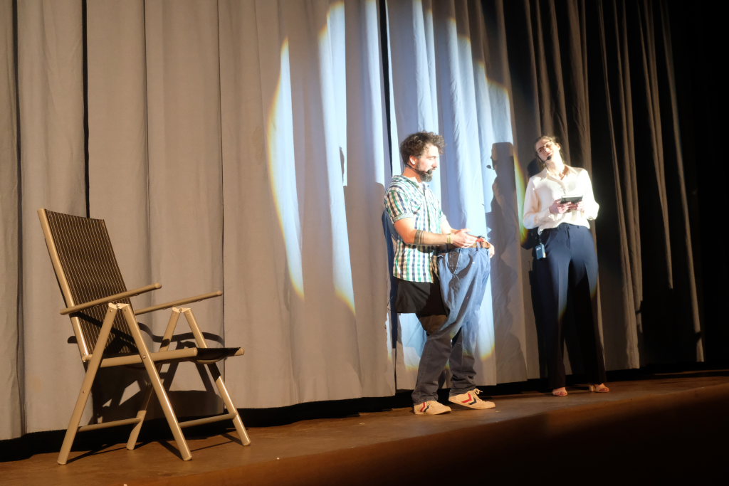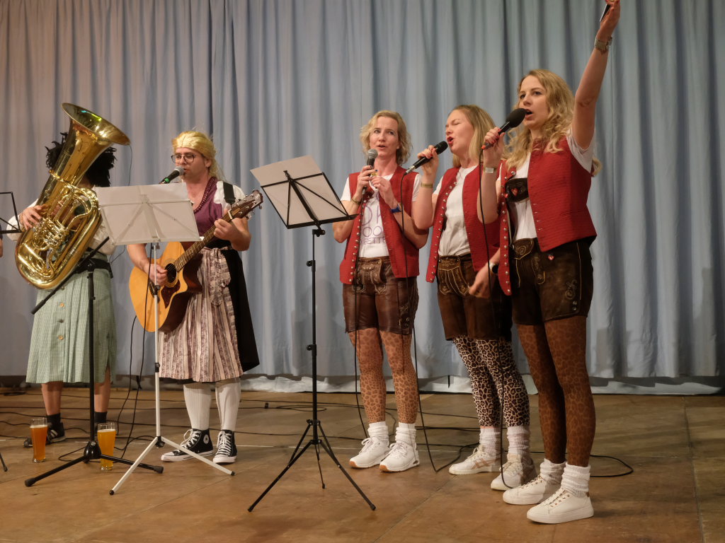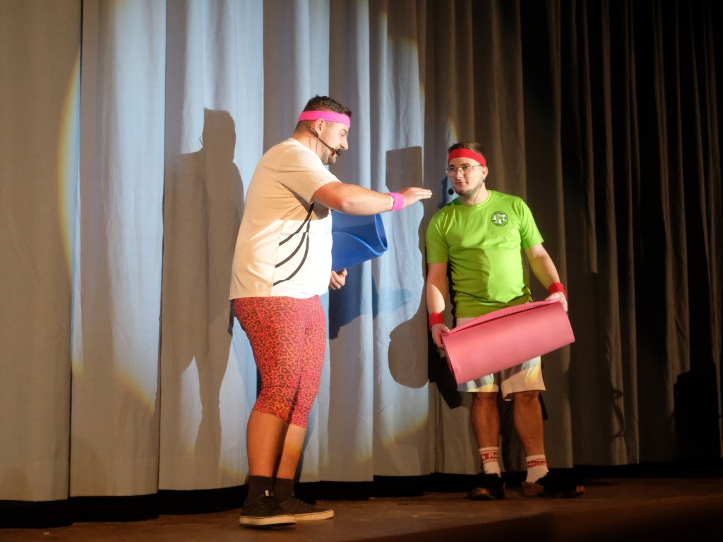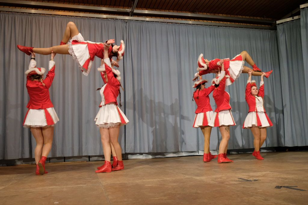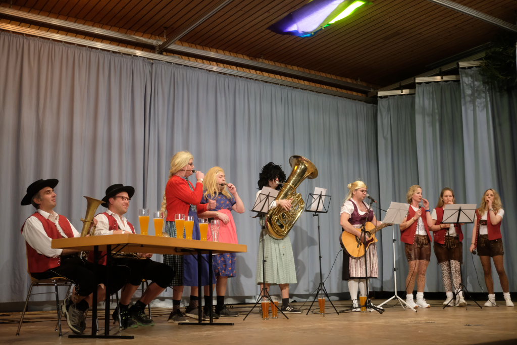 Mit den Gardemädchen der Landjugend boten zum Einstieg ins Live-Programm wie in jedem Jahr eine wunderschöne Tanzvorführung mit akrobatischen Elementen. Der gesellschaftliche Dreh- und Angelpunkt von Unterschwarzach, das Gasthaus zum Hirsch spielte auch in diesem Jahr wieder eine tragende Rolle. Beim Sketsch über die erste „Bier-Yoga“-Stunde wurde reichlich von dem Gerstensaft verkostet und in allen Lagen in sich hineingeschüttet. „Yogalehrer“ Christian Wiest und seine Yogakameraden Markus Firley, Mario Würzer, Leonas Neff und Timo Kolb trieben es dabei so bunt, bis Sabine Welte als erboste Wirtin Moni dem Treiben nach der ersten Lektion ein Ende setzte…