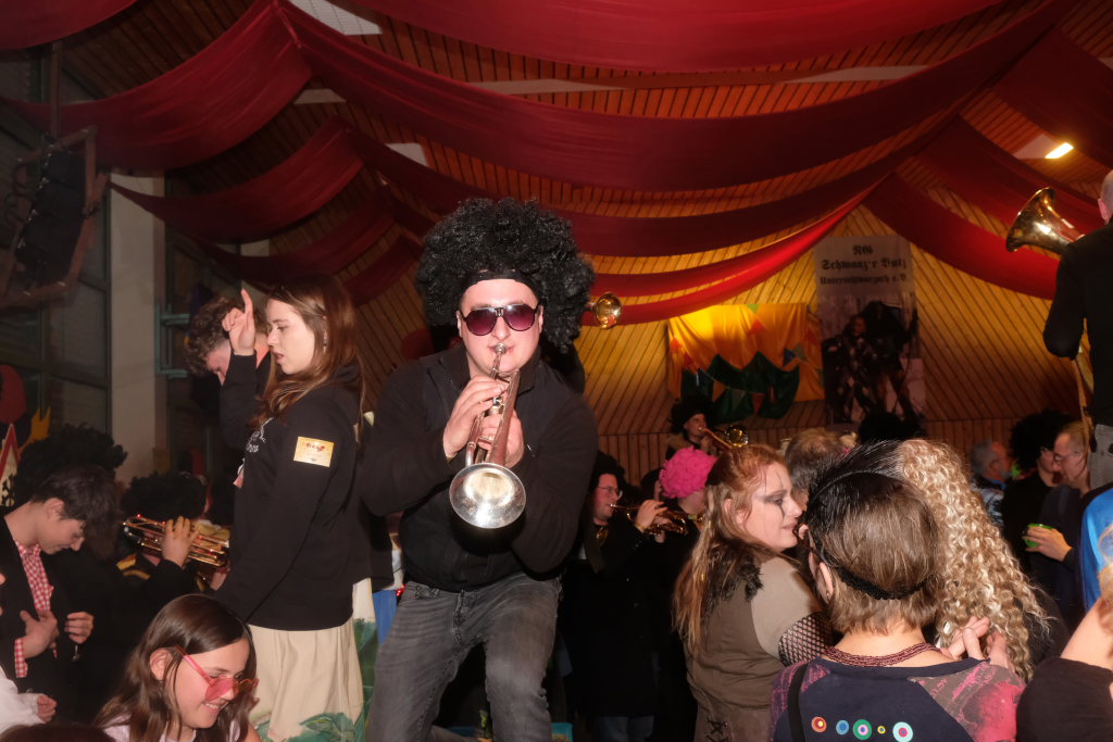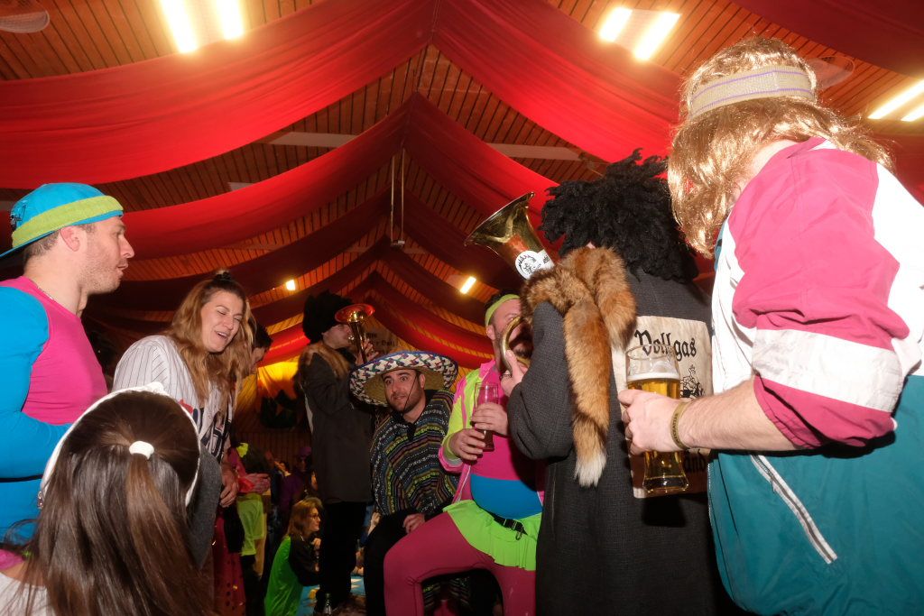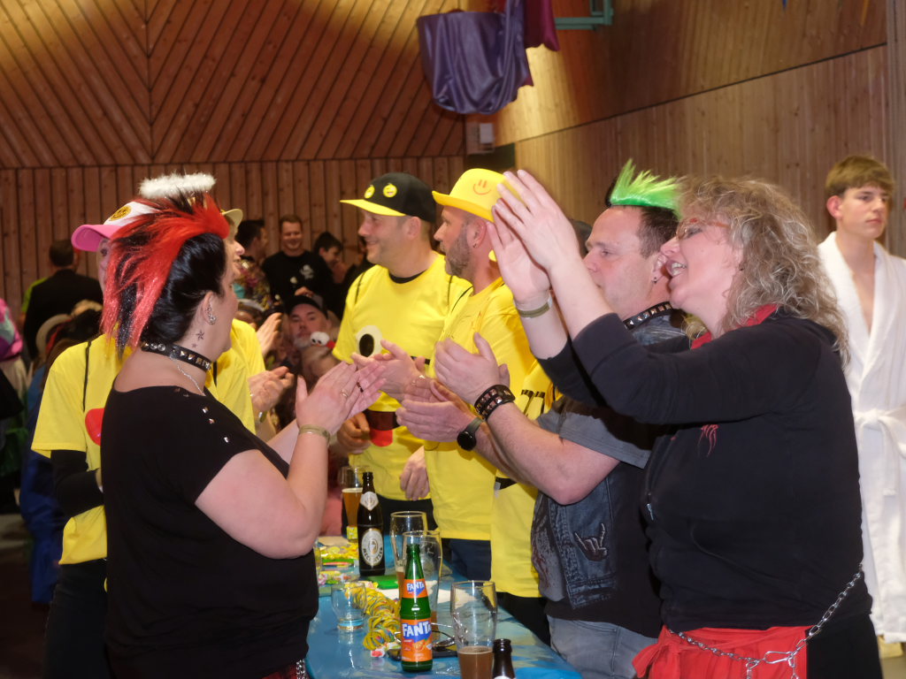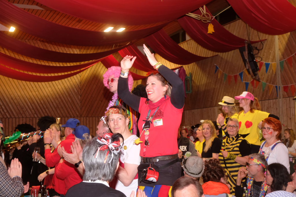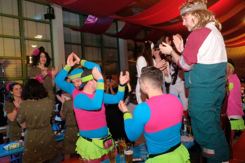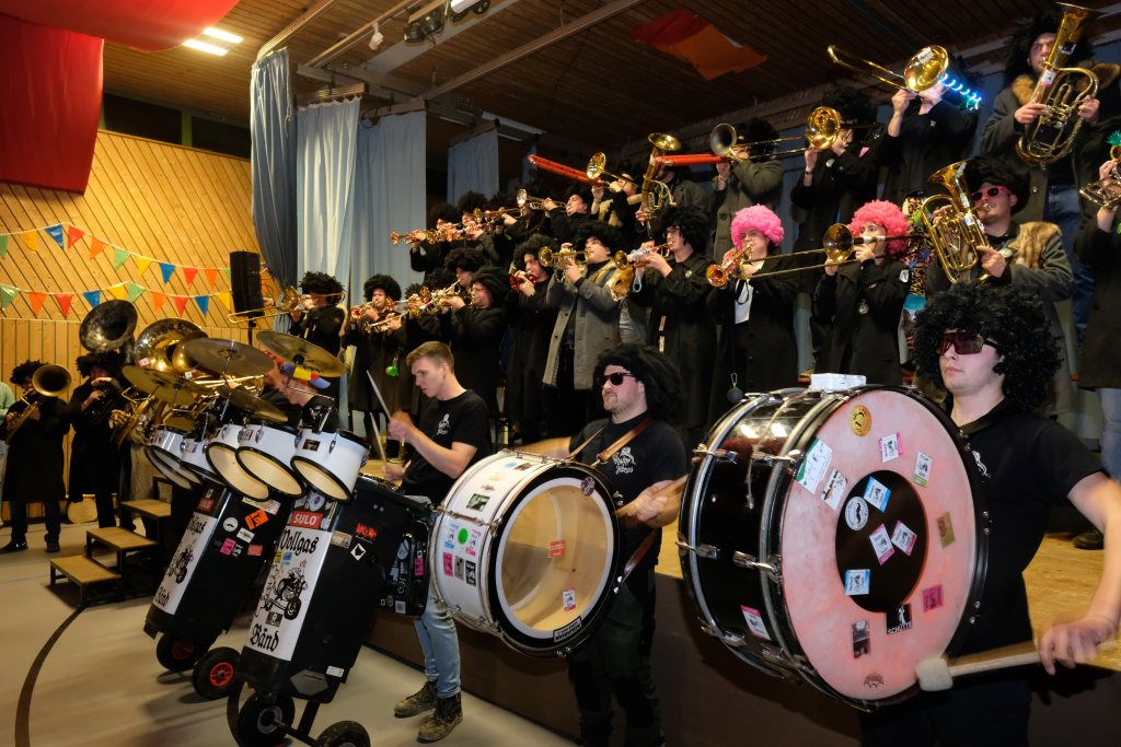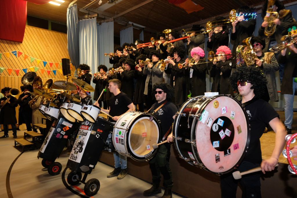 Doch damit war noch nicht ganz Schluss: Denn während viele fleißige Hände die Bühne abbauten und den neuen Bodenbelag der Festhalle zum „Dancefloor“ machten, sorgte im Saal die Vollgas-Bänd aus Seibranz, zum Teil auf den Tischen spielend, für beste Laune bei den „Mäschkerle“ im Saal. Bis dann die Partynacht bis zum Morgengrauen mit Juke-Box und dem Barbetrieb startete.