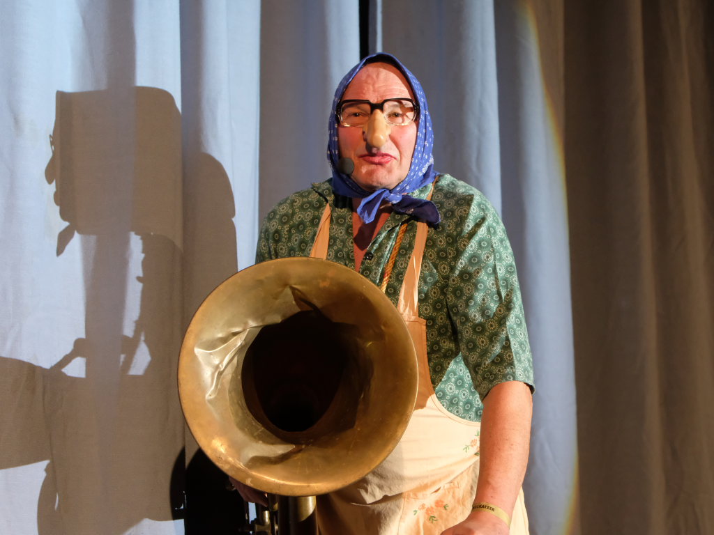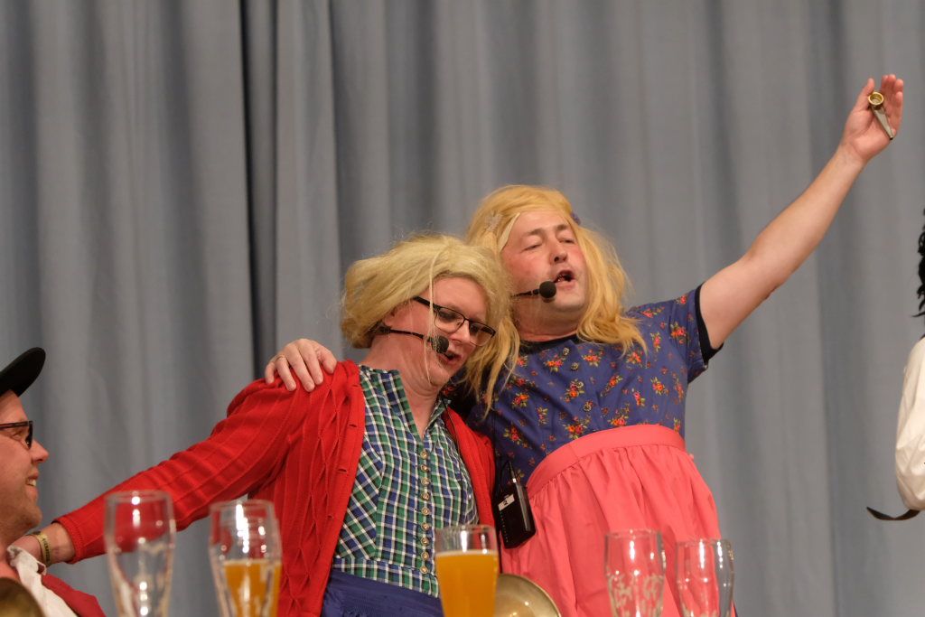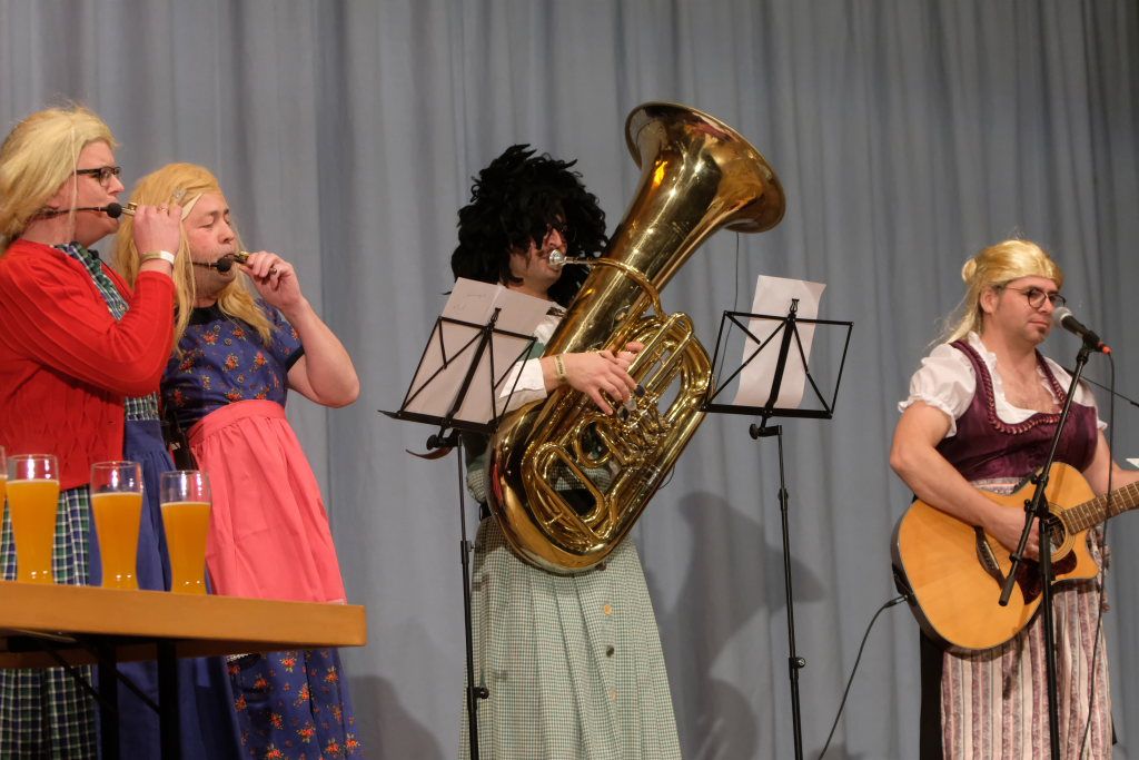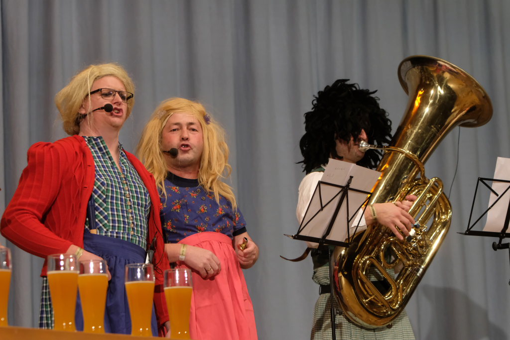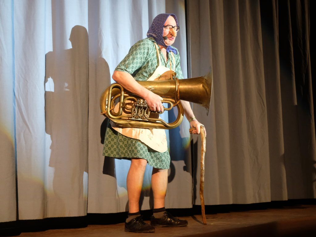 Alljährlich steigt Manfred Ruf in die Bütt. In diesem Jahr wollte er es als skurrile alte Dame, die „wegen des jungen und knackigen Tubisten“ mit Gehstock und Tuba erstmals zur Musikprobe gehen will und dabei ein wenig auch aus ihrem Eheleben plaudert. Auf die Frage, was wohl später auf ihrem Grabstein stehen solle, habe ihr Mann gesagt: „Kalt wie immer.“ Darauf sie über seinen: „Endlich steif.“ Nicht verstehen konnte Ruf, dass es an der Supermarkt-Kasse für Kondome, die ausdrücklich fürs Fremdgehen besorgt wurden, auch noch Treuepunkte geben soll.