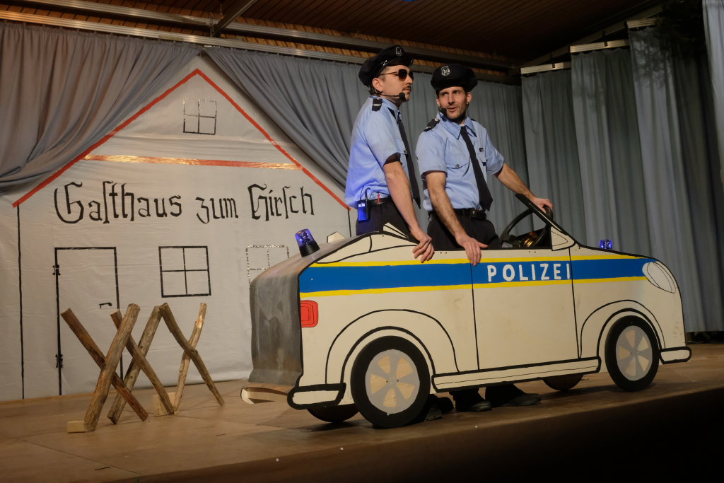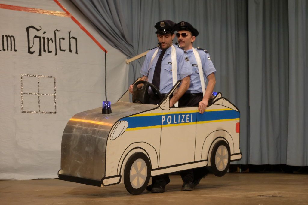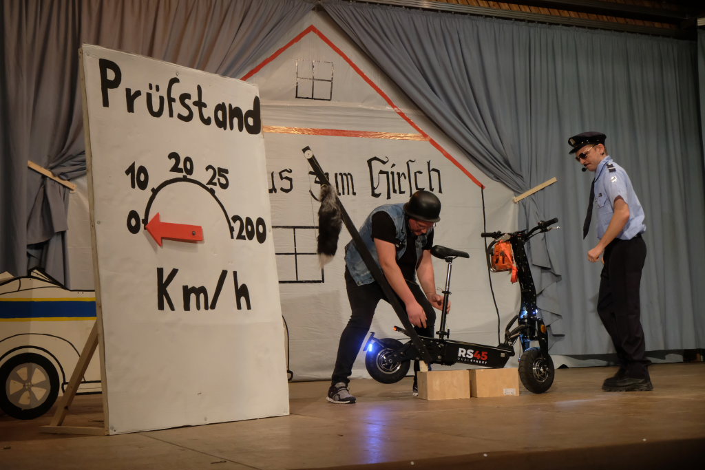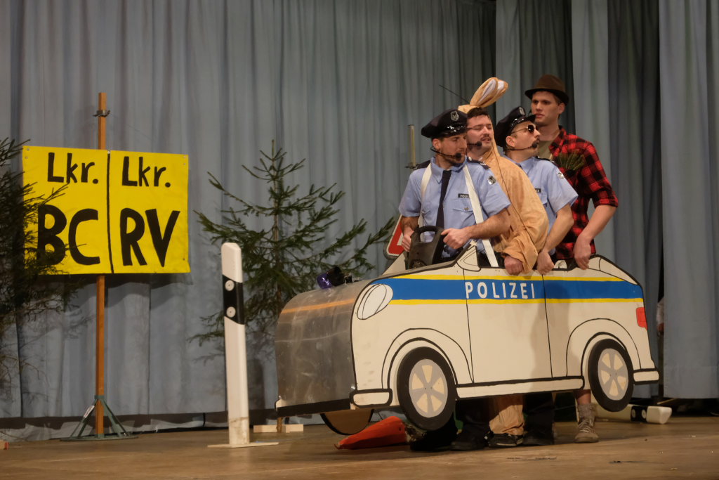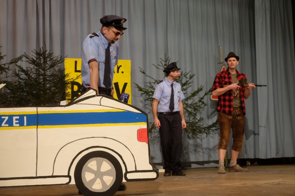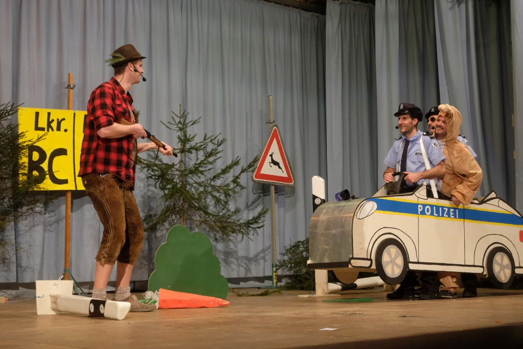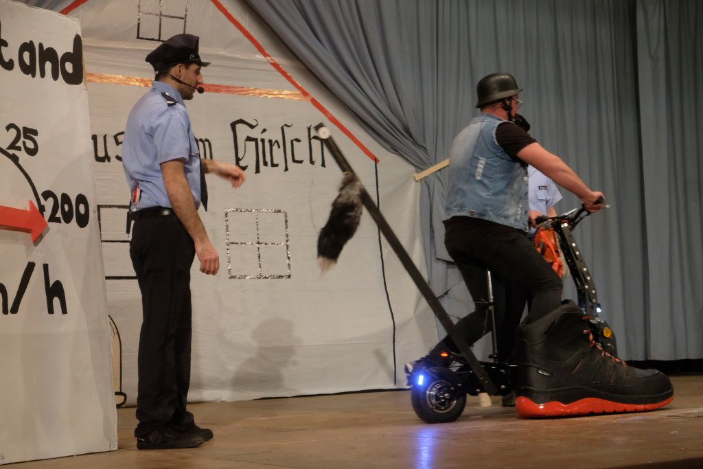 Verbale Spitzfindigkeit zum Thema „Halber Mann“ gab Christian Wiest, der sich bei der Psychologin (Sabine Welte) Trost erhoffte, von sich, ehe die LJG Mädels mit ihrem rasanten Tanz die Bühne enterten. Ehe das Finale nahte, schloss sich der Kreis: Berthold Menig und Stefan Kibler durften als gelangweilte Dorfpolizisten mit ihrem Luxus-Streifenwagen mit B(ein)-Antrieb durch die Gegend gondeln, bis ein Schuss die Idylle der Beiden beim Frühstück auf der Rastbank im Wald stört. Der Jäger (Stefan Niedermaier) verfehlte jedoch sein Ziel, den Hasen (Bernd Schuler), der vor ihm auf der Flucht sich in den nahen Landkreis Biberach rettet. Dort wird er an der Kreisgrenze dann doch noch vom Polizeiwagen „erlegt“, landet jedoch auf der Biberacher Seite, so dass die Polizisten die Kollegen um Amtshilfe bitten wollten. Inzwischen rappelte sich der Hase wieder auf und lief dann den Usa-Sheriffs in die Arme, die dann, weil auch noch der Jäger ein Taxi benötigte, mit gefangenem und Jäger zur „Dienststelle“ Gasthaus Hirsch zurückkehrten. Wie immer bot der große Sketsch jede Menge Action, etwa wenn der Mofafahrer Helmut Wirth mal wieder den Jägerzaun beim Hirsch ummäht und den großen Hemmschuh verpasst bekommt, weil sein scharfes Gerät laut Prüfstandstest 200 Km/h schnell sein soll. Oder wenn der Hase auf der Flucht vor dem Jäger samt „Baum“ auf die Bühne stürzt.