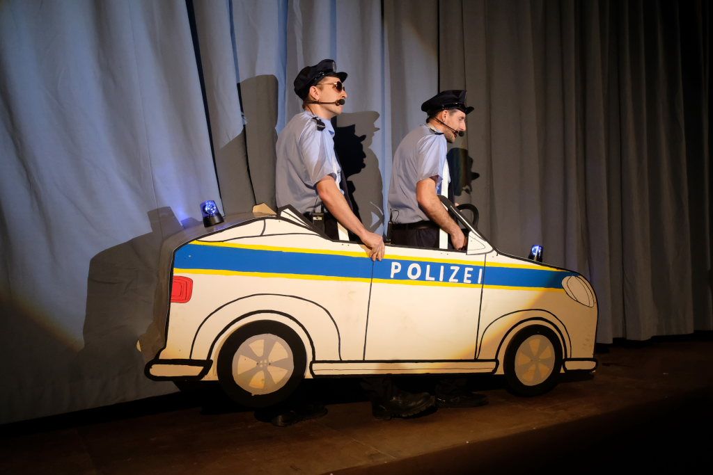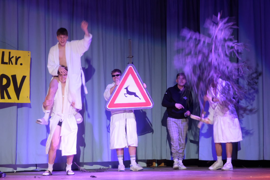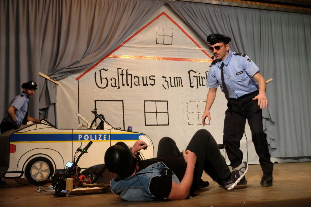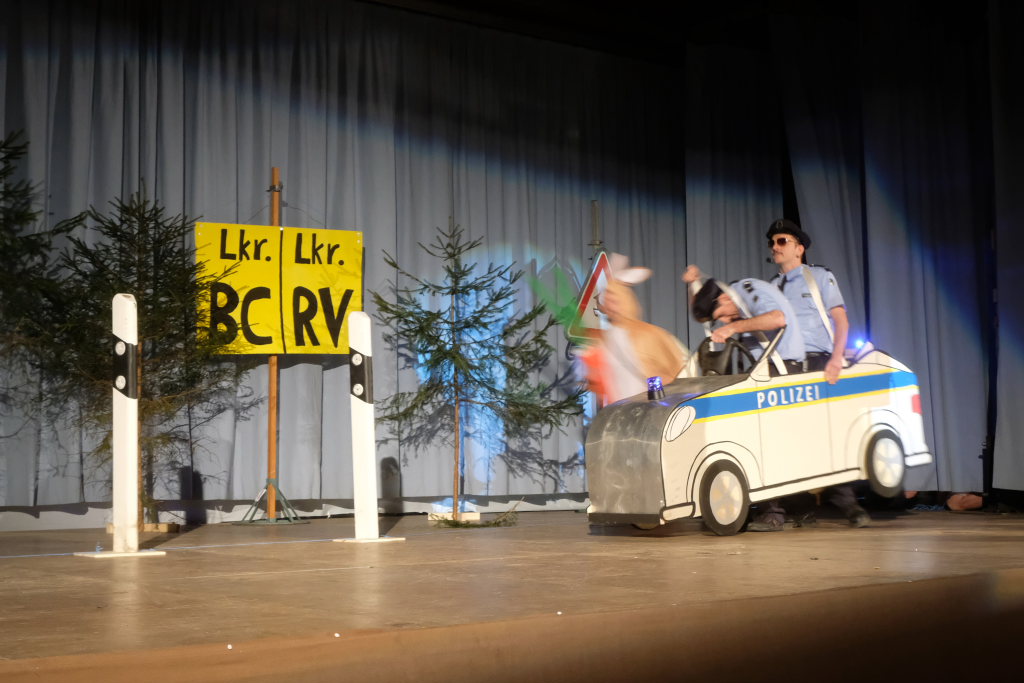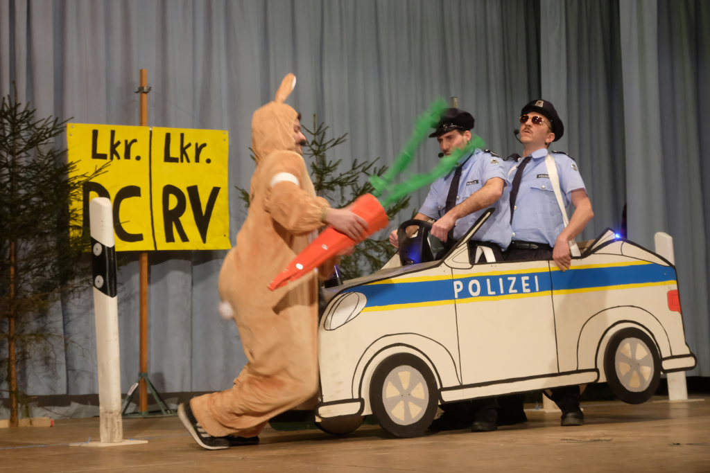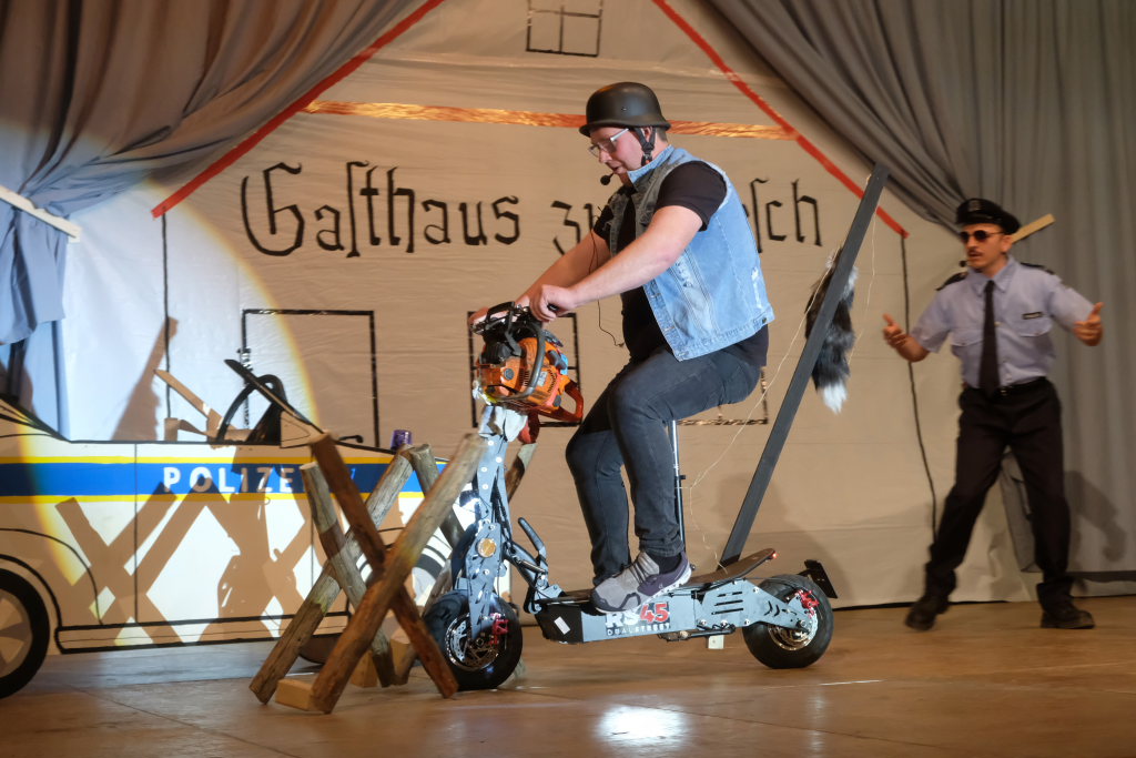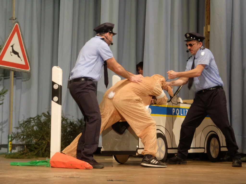 Verbale Spitzfindigkeit zum Thema „Halber Mann“ gab Christian Wiest, der sich bei der Psychologin (Sabine Welte) Trost erhoffte, von sich, ehe die LJG Mädels mit ihrem rasanten Tanz die Bühne enterten. Ehe das Finale nahte, schloss sich der Kreis: Berthold Menig und Stefan Kibler durften als gelangweilte Dorfpolizisten mit ihrem Luxus-Streifenwagen mit B(ein)-Antrieb durch die Gegend gondeln, bis ein Schuss die Idylle der Beiden beim Frühstück auf der Rastbank im Wald stört. Der Jäger (Stefan Niedermaier) verfehlte jedoch sein Ziel, den Hasen (Bernd Schuler), der vor ihm auf der Flucht sich in den nahen Landkreis Biberach rettet. Dort wird er an der Kreisgrenze dann doch noch vom Polizeiwagen „erlegt“, landet jedoch auf der Biberacher Seite, so dass die Polizisten die Kollegen um Amtshilfe bitten wollten. Inzwischen rappelte sich der Hase wieder auf und lief dann den Usa-Sheriffs in die Arme, die dann, weil auch noch der Jäger ein Taxi benötigte, mit gefangenem und Jäger zur „Dienststelle“ Gasthaus Hirsch zurückkehrten. Wie immer bot der große Sketsch jede Menge Action, etwa wenn der Mofafahrer Helmut Wirth mal wieder den Jägerzaun beim Hirsch ummäht und den großen Hemmschuh verpasst bekommt, weil sein scharfes Gerät laut Prüfstandstest 200 Km/h schnell sein soll. Oder wenn der Hase auf der Flucht vor dem Jäger samt „Baum“ auf die Bühne stürzt.