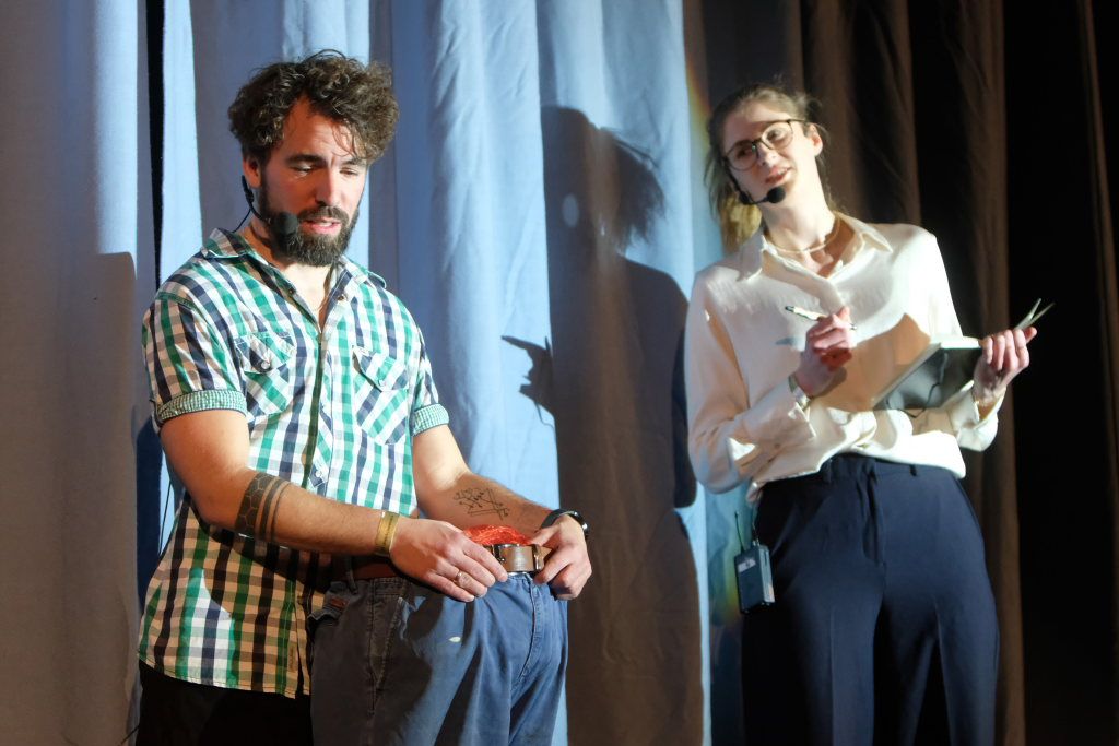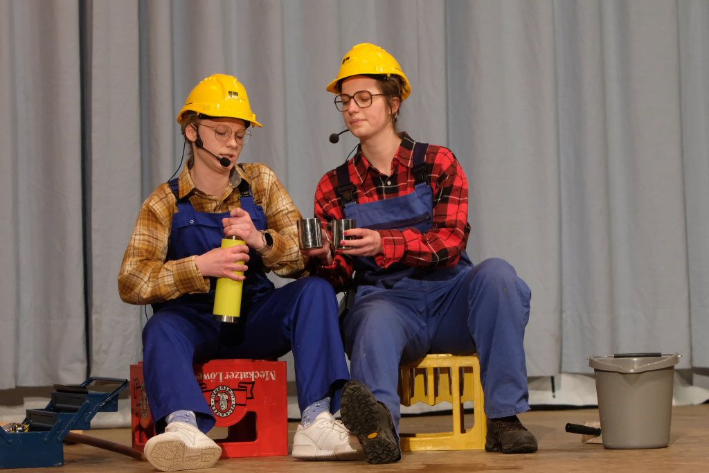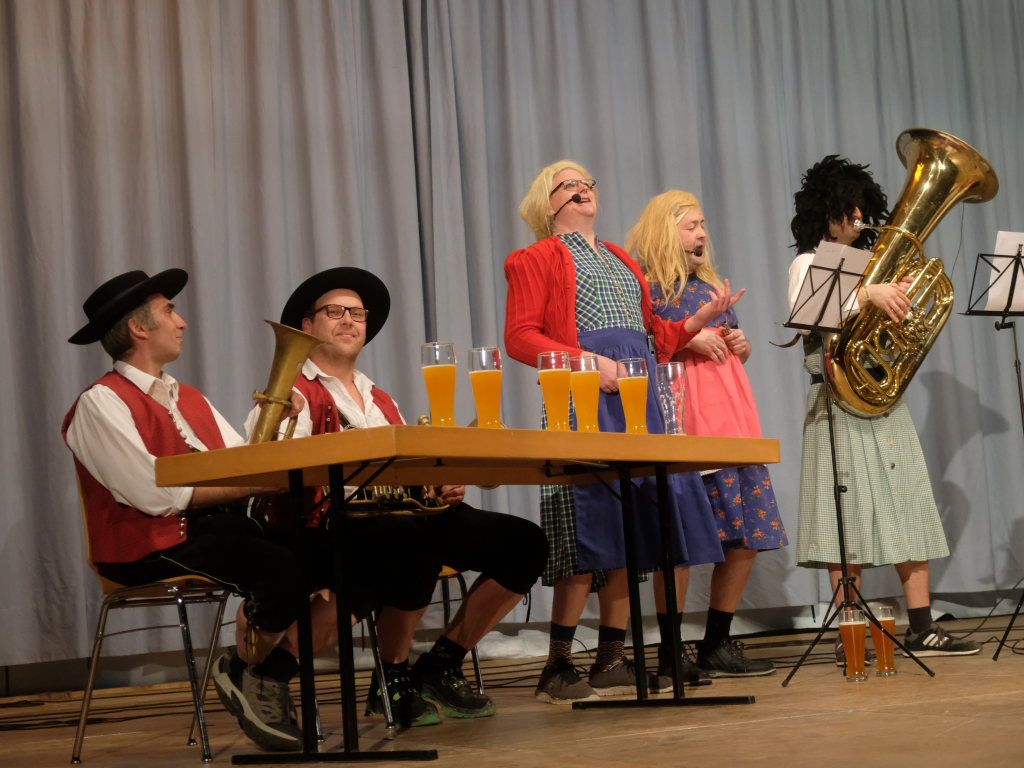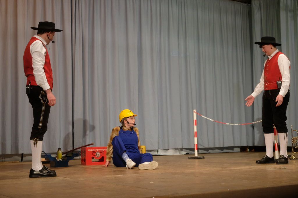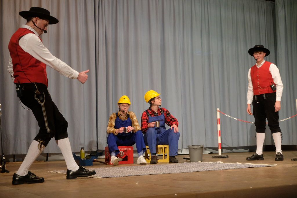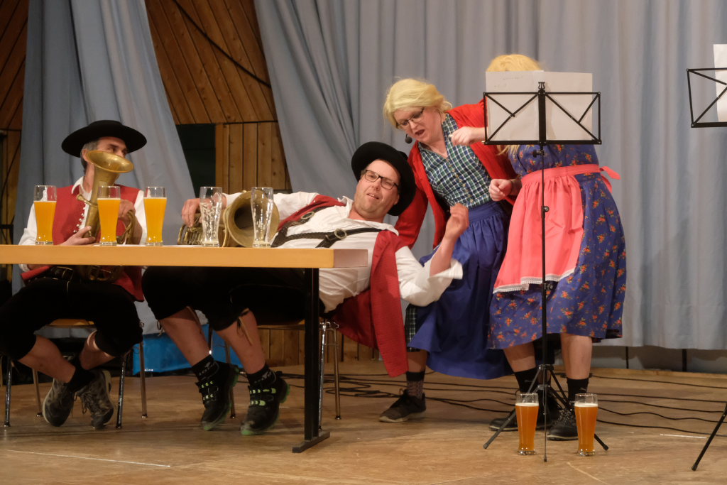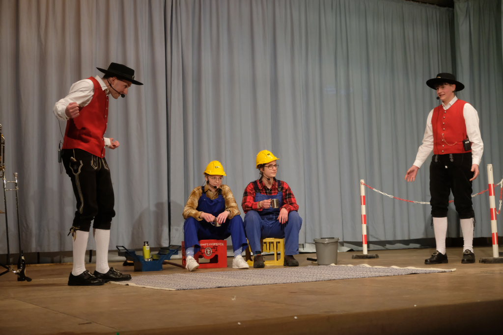 Eine echt vorgefallene Geschichte nahm die Musikkapelle Eggmannsried mit ihrem Sketsch über die Verlegung des neuen Hallenbodens aufs Korn. Denn die geplante Verlegung des neuen Hallenbodens verzögerte sich und die Musiker hatten nicht umsonst vorsorglich ihr Jahreskonzert nach Dietmanns verlegt. Doch war dies an den beiden Musikanten Felix Wild und Magnus Gütler ungehört vorübergegangen, als das im Ausschuss besprochen worden war. Und so versuchten die beiden am Tag des Konzertes alles, um die beiden Handwerker Anna und Franziska Gütler, die ja nicht unbedingt vor Arbeitswut strotzten, flott zu machen und den Abend zu retten. Erst als die anderen Musiker aus Dietmanns anriefen und fragten wo sie den blieben, ging den beiden Uniformträgern eine überdimensionale Straßenlaterne auf.