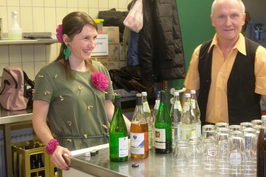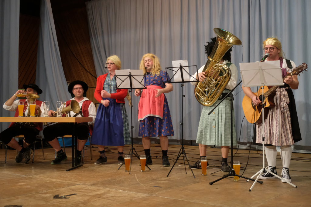 Während die Musikkapelle Harmonie Unterschwarzach bei ihrem Beitrag auf Gesang umgestiegen war, wie immer mit Dirigent Manfred Bachmoor als Rhythmus- und Taktgeber und Andreas Humm, Winfried und Bernd Schuler als männliche Sänger und Stefanie Schneider, Silvia Lieb und Diana Heine als ihre weiblichen Pendants, taten sich Vorstand Felix Maucher und Tenorhornist Norbert „Nobbe“ Wirth an den natürlich zu Beginn noch vollen Weißbiergläsern gütlich.