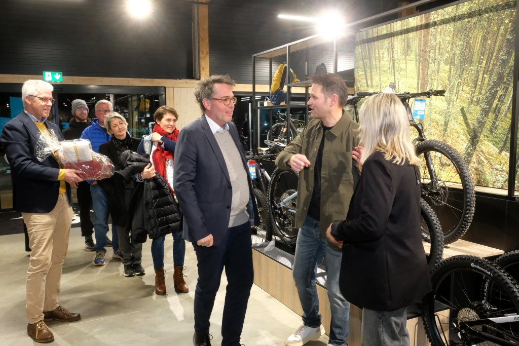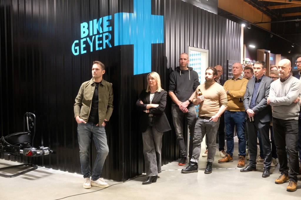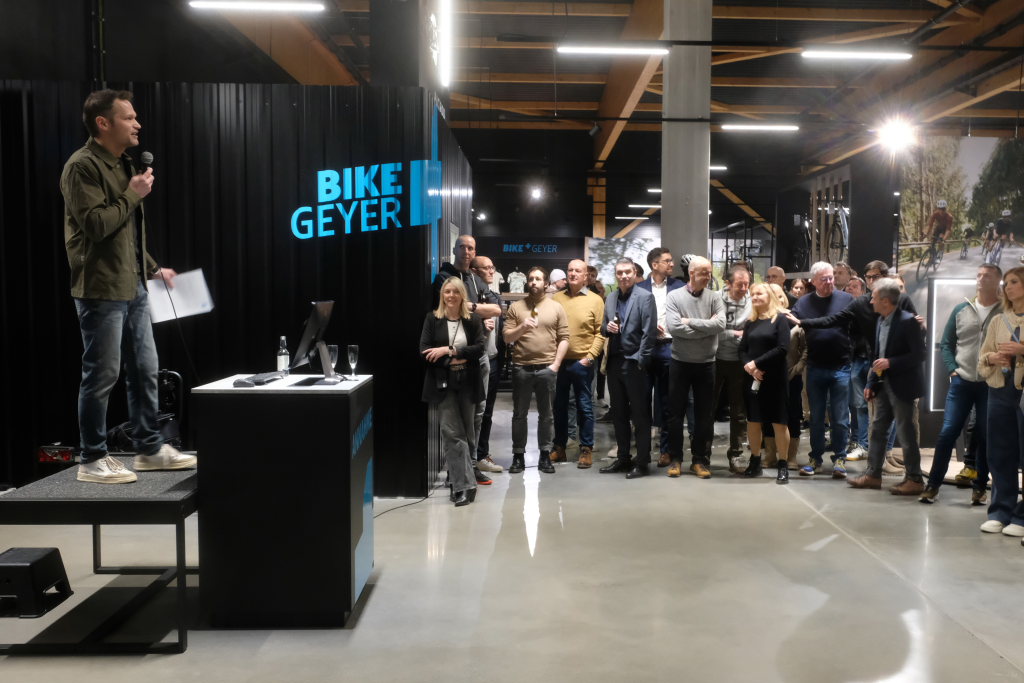 „Das Leben ist wie Fahrradfahren, um in der Balance zu bleiben, muss man in Bewegung bleiben.“ Mit diesem Sprichwort nahm Stefan Geyer die Gäste mit auf eine Reise durch die Firmengeschichte, verbunden mit einem großen Dank an seine Eltern Klara und Josef, die das Geschäft aufgebaut hatten. 1982 hatten diese das Fahrradgeschäft von Theo Baur (das heutige Casa Rossa) übernommen. 1986 dann der Umzug in die Gartenstraße, wo dann 1992 eine neue Werkstatt und Verkaufsfläche angebaut wurden. Diese wurde 2006 mit der Hinzunahme des leerstehenden Norma-Ladens verdoppelt. Seit 2019 wurde eine Vergrößerung ins Auge gefasst und eine Lösung gesucht. Und nachdem 2023 die Stadt mit der Erschließung dieses Teiles der Ziegelwiese begonnen hatte, konnte im Januar mit dem Bau des neuen Gebäudes begonnen werden. Das jetzt dank Erdwärme und PV-Anlage dem KfW-Standard entspricht und in Sachen Heizung und Kühlung weitestgehend autark und damit sehr nachhaltig ist.