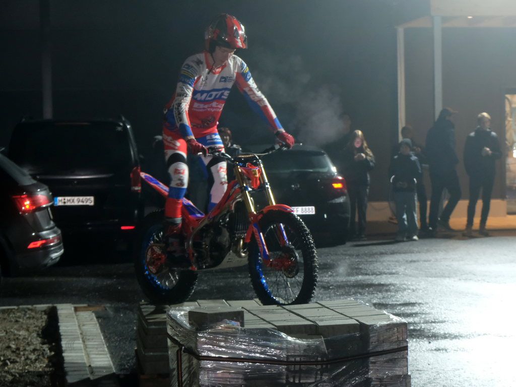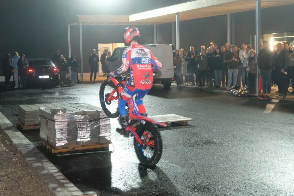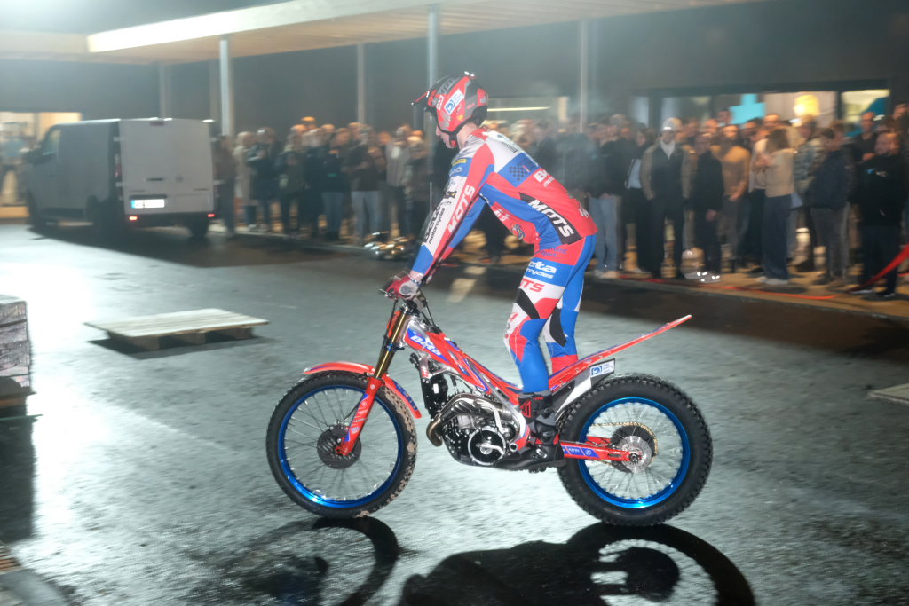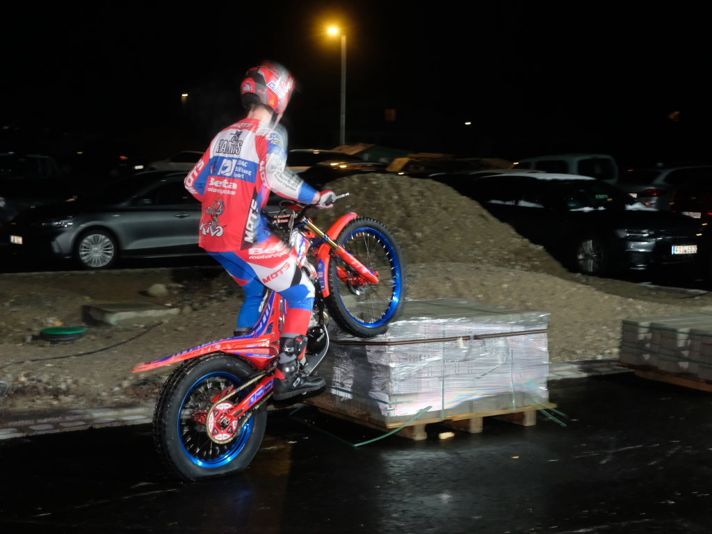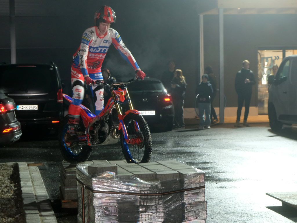 Natürlich gehören zu einer Feier Essen und Trinken und ein Rahmenprogramm. Für ersteres sorgte die Schönegger Käsealm, für die Musik DJ Vasco Blattner und draußen auf dem Parkplatz konnte sich für einige Zeit der 17-jährige Johannes Heidel, Vize-Europameister 2023 auf seiner Trial-Maschine, austoben. Die aufgestellten Biertischgarnituren und in der ganzen Halle verteilten Stehtische luden zum Schwätzen und Plauschen ein.