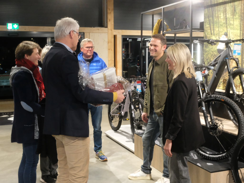 Bei seinem Lob für seine Mitarbeiter, die ihm während der Bauzeit den Rücken freigehalten hatten und immer sehr gute Arbeit machten, verglich er sie mit den Zahnrädern und einer gut geölten Fahrradkette. Neben dem Rückhalt durch die Politik in Person von MdL Raimund Haser ging sein Dank auch an die beteiligten Handwerker, die bei den Meilensteinen des Baues Rohbau, Tiefenbohrungen, Holzbau und Ladenbau ebenso wie Zahräder ineinandergriffen, so dass der Bauherr, der von sich selbst an diesem Abend sagte, dass er nicht immer leicht zu händeln war, sagte: „Das hat perfekt funktioniert, wie man sieht.“