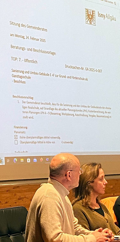 Michael Dirner, Fachbereichsleiter Stadtbauamt, am Montagabend (24.2.2025) im Gemeinderat Isny. An die Wand projiziert der Tagesordnungspunkt Umbau der Alten Realschule zur Grund- und Förderschule als Ganztagesschule. Foto: Julian Aicher