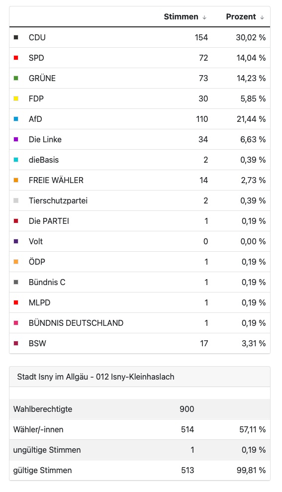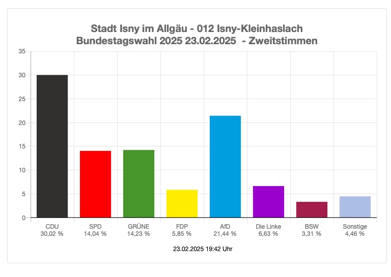 Das Isnyer Gesamtergebnis haben wir bereits am Sonntagabend vermeldet. Es lautet wie folgt: CDU vor AfD und SPD. Im Einzelnen: Die CDU holte in Isny 33,7 Prozent der für die Sitzverteilung im Bundestag entscheidenden Zweitstimmen. Auf die AfD entfielen 17,7 Prozent, auf die SPD entfielen 13,9 Prozent, auf die Grünen 12,6 Prozent. Auf den weiteren Plätzen folgen: Die Linke mit 6,6 Prozent, FDP mit 5,1 Prozent, BSW mit 4,8 Prozent und Sonstige mit 5,7 Prozent. Entnommen der Homepage der Stadt am 23. Februar um 21.17 Uhr.