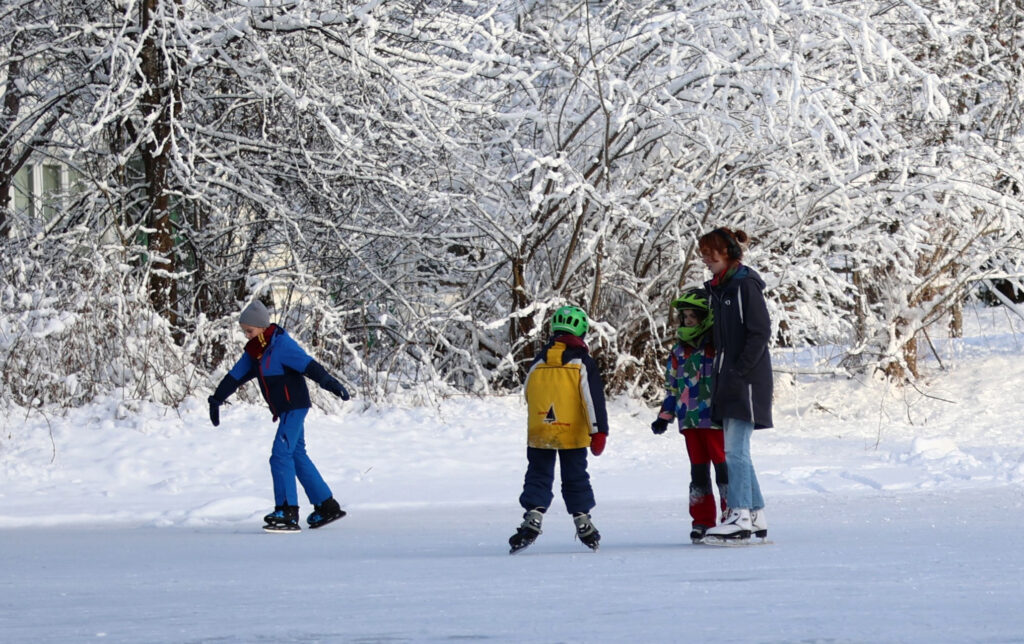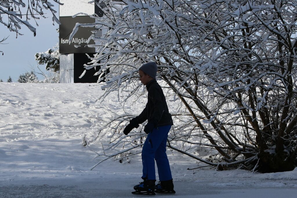 Gleich am Feuerwehrhaus hat Hans Wagner den Stadtbach auf eine tiefe gelegene Weise geleitet und der Frost hatte daraus Anfang Januar eine Eislauffläche gemacht. Es ist Platz genug für einfache Laufschritte oder sogar elegante Pirouetten. Im nahegelegenen REWE-Markt lockt das Café Steinhauser mit allen allerlei Versuchungen für eine Aufwärmpause: vom Leberkäswecken bis zu Nusshörnle und feinen Torten.