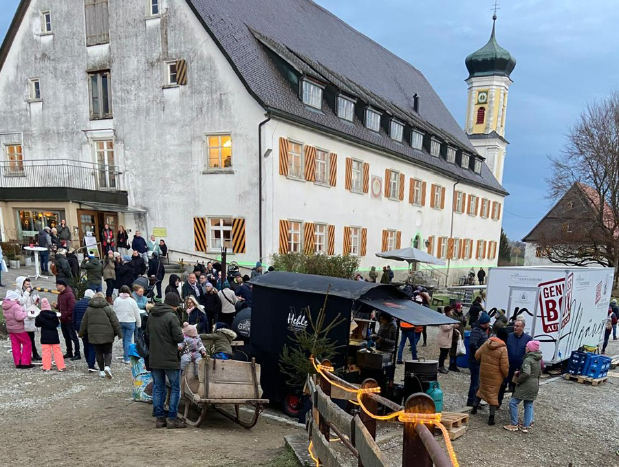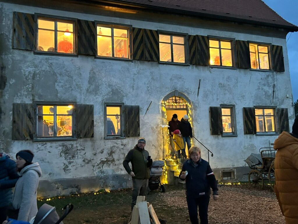 Mal draußen am Kässpätzles-Stand, mal drinnen in unterschiedlichen Gast(stätten)räumen. Allein schon für Speis und Trank war in Bärenweiler beim „Winterzauber“ mehr als gesorgt. Zusätzlich immer wieder beeindruckend: das Anwesen selbst. Drinnen in den voll besetzten Fluren mit Marktständen warf einen Besucherin den Blick in eine der früheren Altersruhe-Kammern und erinnerte sich: „Das war das Zimmer von meinen Eltern.“