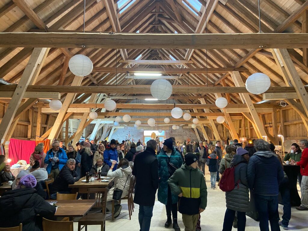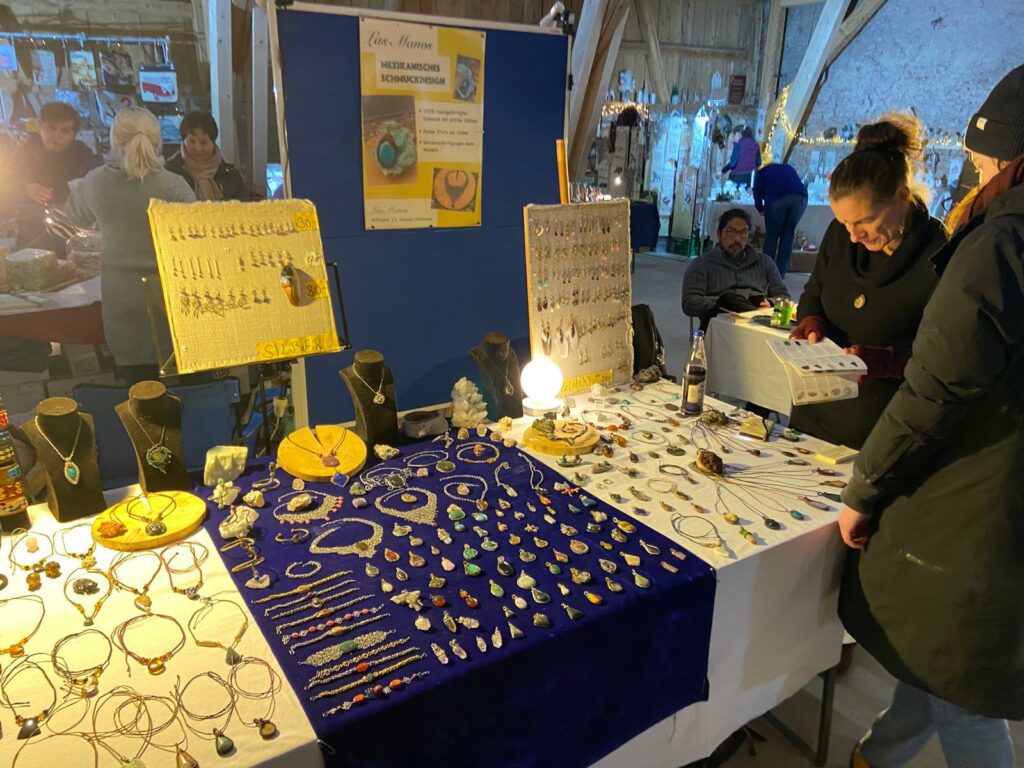 Im beachtlich holz-renovierten Scheunen-Saal freute sich die Anbieterin von allerhand indisch und mexikanisch wirkendem Schmuck: „Wir haben einen schönen Platz hier. Wir haben’s warm und kriegen Luft.“ Diese wirkte draußen erfreulicherweise noch wenig winterlich kalt. Und drinnen erwärmt durch die schier endlos wirkenden Besuchs-Massen. Sie waren teils per PKW, teils mit einem Extra-Shuttle-Bus von Kißlegg hergefahren. Vor-winterlich verzaubert.