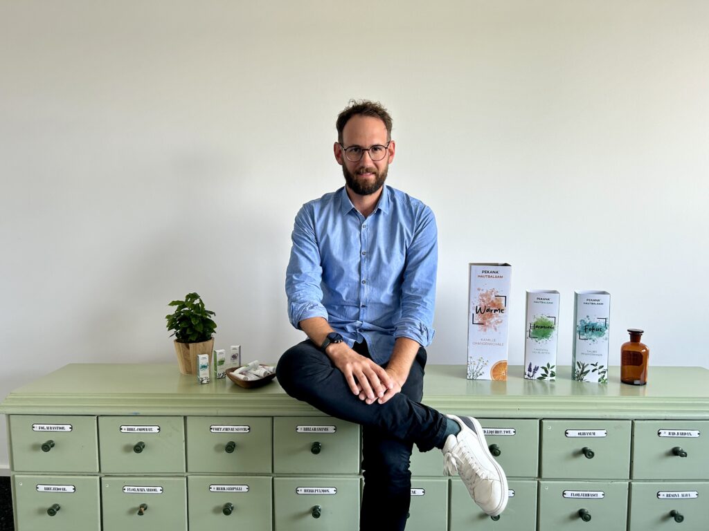 Geschäftsführer Dr. Marius Beyersdorff freut sich über Hautbalsame, die Aromaöle und pulverisierte Mineralien enthalten – für jede Lebenslage. Fotos: PEKANA.