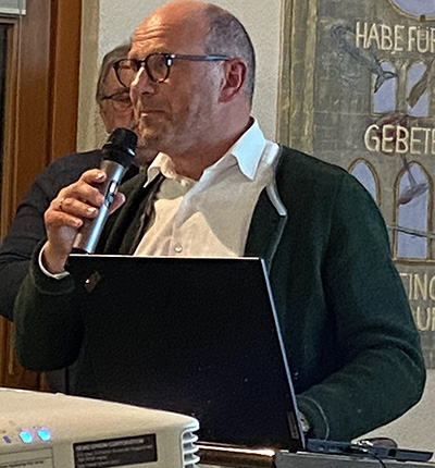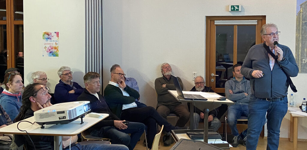 Mit-Veranstalter Armin Kohler (Bild) aus Waltershofen bedankte sich auf der Saalbühne zunächst, dass „der Bürgermeister sich Zeit genommen hat“. Seit 2023 habe die Firma Uhl Windkraft erklärt, dass sie im genannten Forst zwischen Emmelhofen, Bremberg, Oberrot und Haslach Windkraft-Tüme aufstellen wolle. Nabenhöhe: 175 Meter. Name: „Kisslegg Ost“.