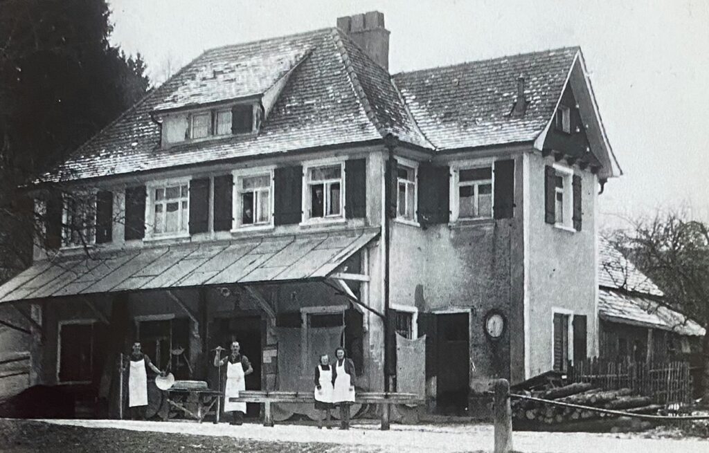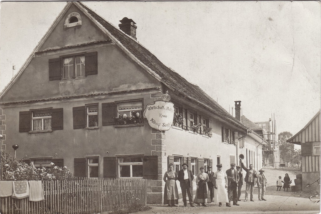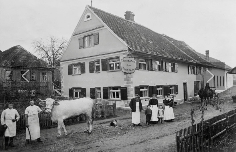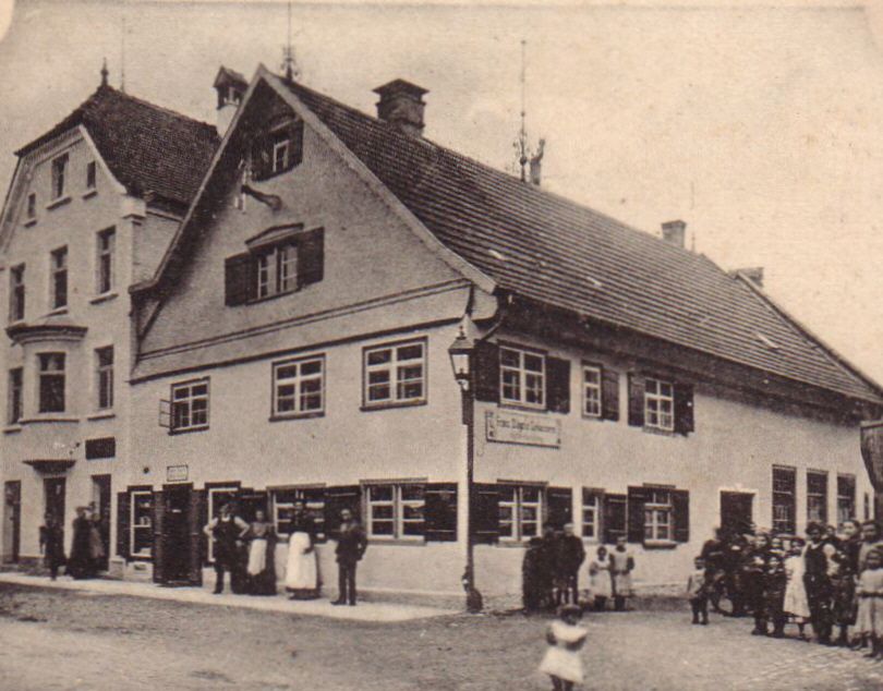Nachstehend ein Foto der Metzgerei Sontag von 1911: Es zeigt Albert Sontag vor dem Hauseck (mit Mütze und weißer Schürze). Rechts neben ihm seine Frau Pauline mit Kindern sowie die Hausmagd, die ein Sontag-Kind auf dem Arm hat. Links zwei Metzger.