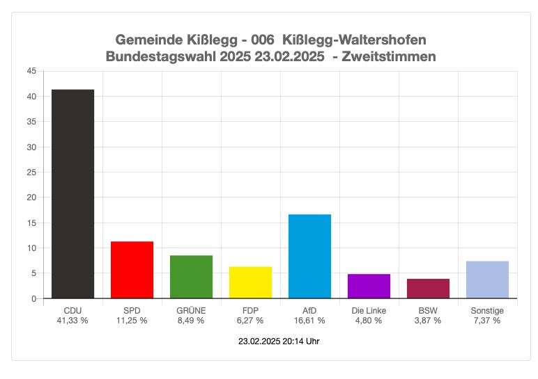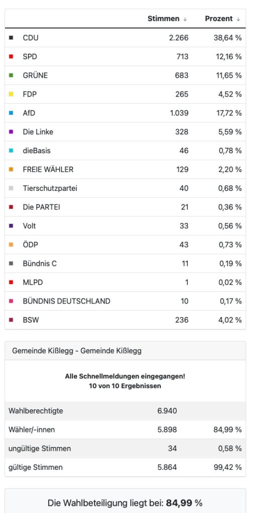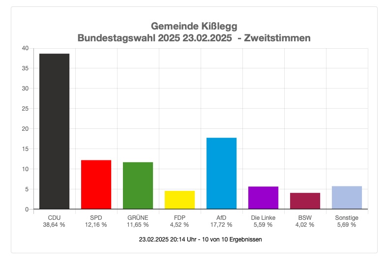 Das Kißlegger Gesamtergebnis (Kernort mit drei Wahlbezirken, Kißlegg-Land, Immenried und Waltershofen und Briefwahl) haben wir bereits am Sonntagabend vermeldet. Es lautet wie folgt: Die CDU holte in Kißlegg 38,6 Prozent der für die Sitzverteilung im Bundestag entscheidenden Zweitstimmen. Auf die AfD entfielen 17,7 Prozent, auf die SPD 12,2 Prozent. Auf den weiteren Plätzen folgen: Grüne mit 11,7 Prozent, Die Linke mit 5,6 Prozent, FDP mit 4,5 Prozent, BSW mit 4,0 Prozent, Sonstige mit 5,7 Prozent. Die Wahlbeteiligung betrug 84,99 Prozent. Nachstehend das Ergebnis als Grafik (entnommen der Homepage der Gemeinde; Stand: 23. Februar 20.14 Uhr).