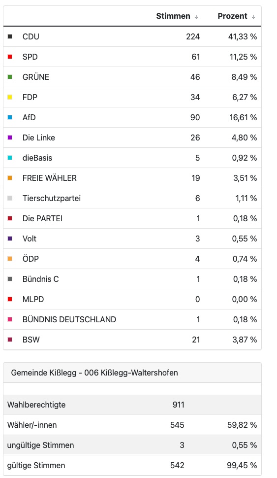 Waltershofen (rei) – In Waltershofen holte die CDU 41,3 Prozent der an der Wahlurne abgegebenen Stimmen. Auf Platz zwei liegt die AfD mit 16,6 Prozent vor der SPD mit 11,3 Prozent. Nachstehend das Waltershofer Ergebnis in grafischer und tabellarischer Form. Achtung: Es sind im Waltershofer Ergebnis keine Briefwahlstimmen enthalten.