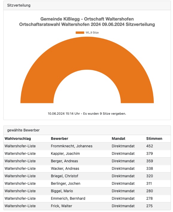 Waltershofen (rei) – Neun Mitglieder hat der Ortschaftsrat Waltershofen. Stimmenkönig ist Johannes Frommknecht; auf ihn entfielen 452 Wählervoten. Auf Platz zwei rangiert Joachim Kappler (379 Stimmen). Nachstehend das Ergebnis der Ortschaftsratswahl von Waltershofen, entnommen der Webseite der Gemeinde Kißlegg: