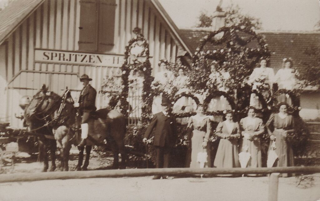 Festwagen vor dem alten Spritzenhaus, im Zentrum des Bildes Bürgermeister Friedrich Wirth. Friedrich Wirth war Bürgermeister in Immenried von 1910 bis 1946 und hat viel Gutes in der Gemeinde bewirkt, unter anderem den Schulhausbau. Ihm wurde in Immenried ebenfalls eine Straße gewidmet.