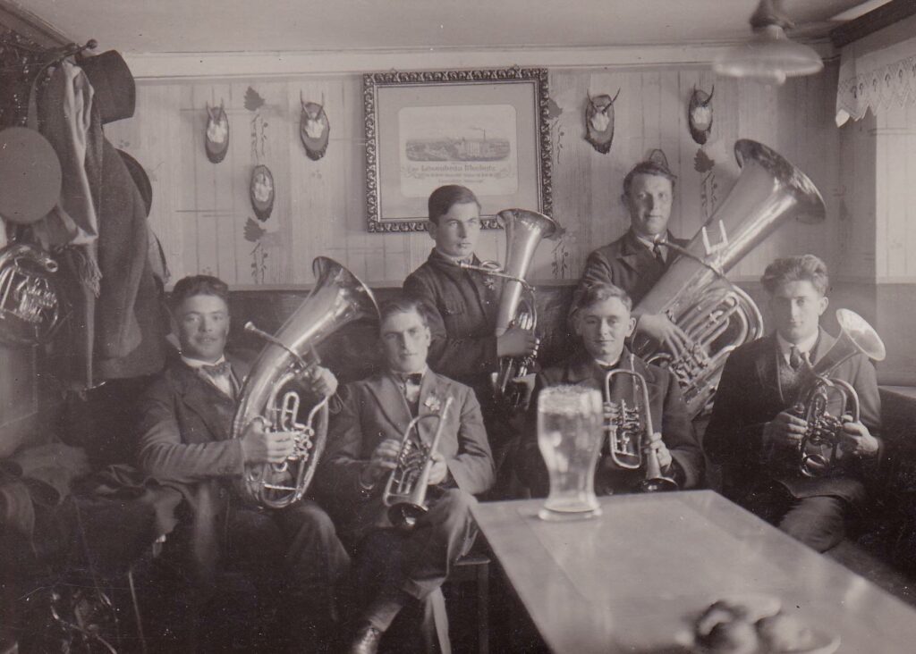 Aufnahme von Musikanten im Gasthaus „Zum Lamm“, im Volksmund immer nur als „d’r Obere“ bezeichnet, weil das Gasthaus sich am weitesten oben an der Straße Richtung Arnach / Bad Wurzach befand. Die anderen beiden Gasthäuser, der „Hirsch“ und das „Rössle“, waren weiter unten angesiedelt (der „Hirsch“stand da, wo heute das Café „Fatima“ ist; das „Rössle“ hatte auch eine Tankstelle). Das Musikanten-Bild im „Lamm“ entstand etwa 1933.