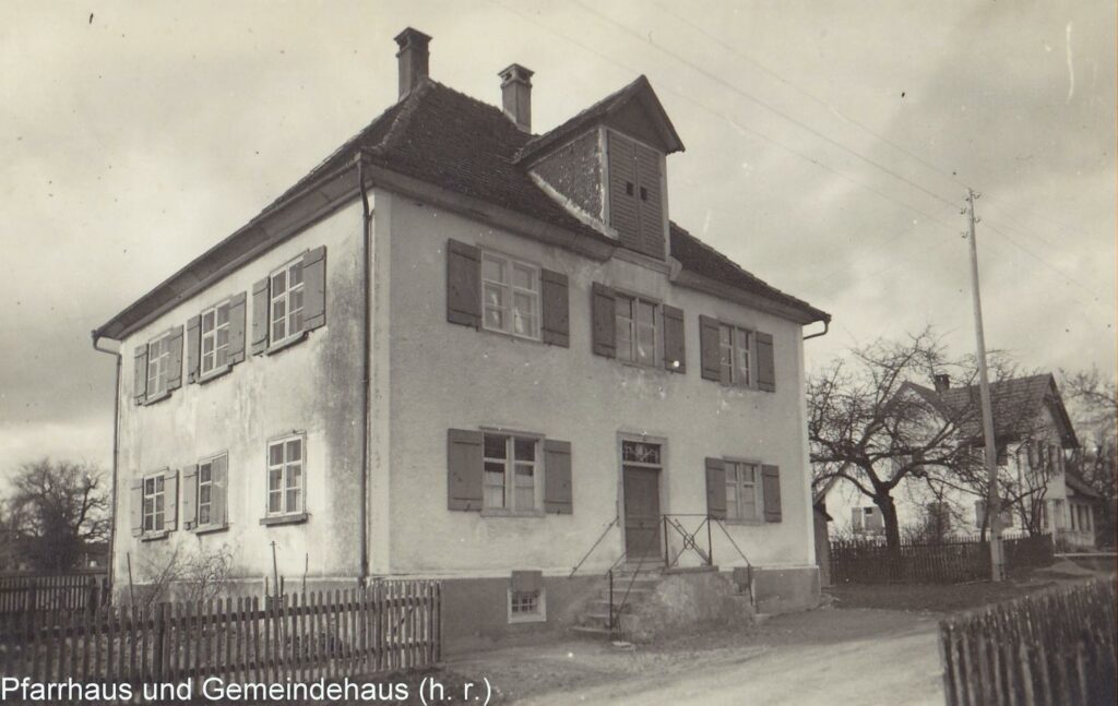 Aufnahme des Pfarrhauses aus dem Jahr 1927, das sich heute noch im gleichen Gesicht darstellt. Erwähnenswert hier besonders Pfarrer Adolf Braun, der die Bevölkerung mit seinen Malereien begeisterte. Er war ein Schüler des bekannten Biberacher Malers Jakob Bräckle und verstand es meisterhaft, die Landschaft und die Höfe um Immenried in Öl zu fassen. Seine Bilder sind bis heute bei den Sammlern sehr begehrt. Pfarrer Adolf Braun lebte und wirkte in Immenried von 1959 bis 1990. Sogar eine Straße wurde nach ihm benannt.