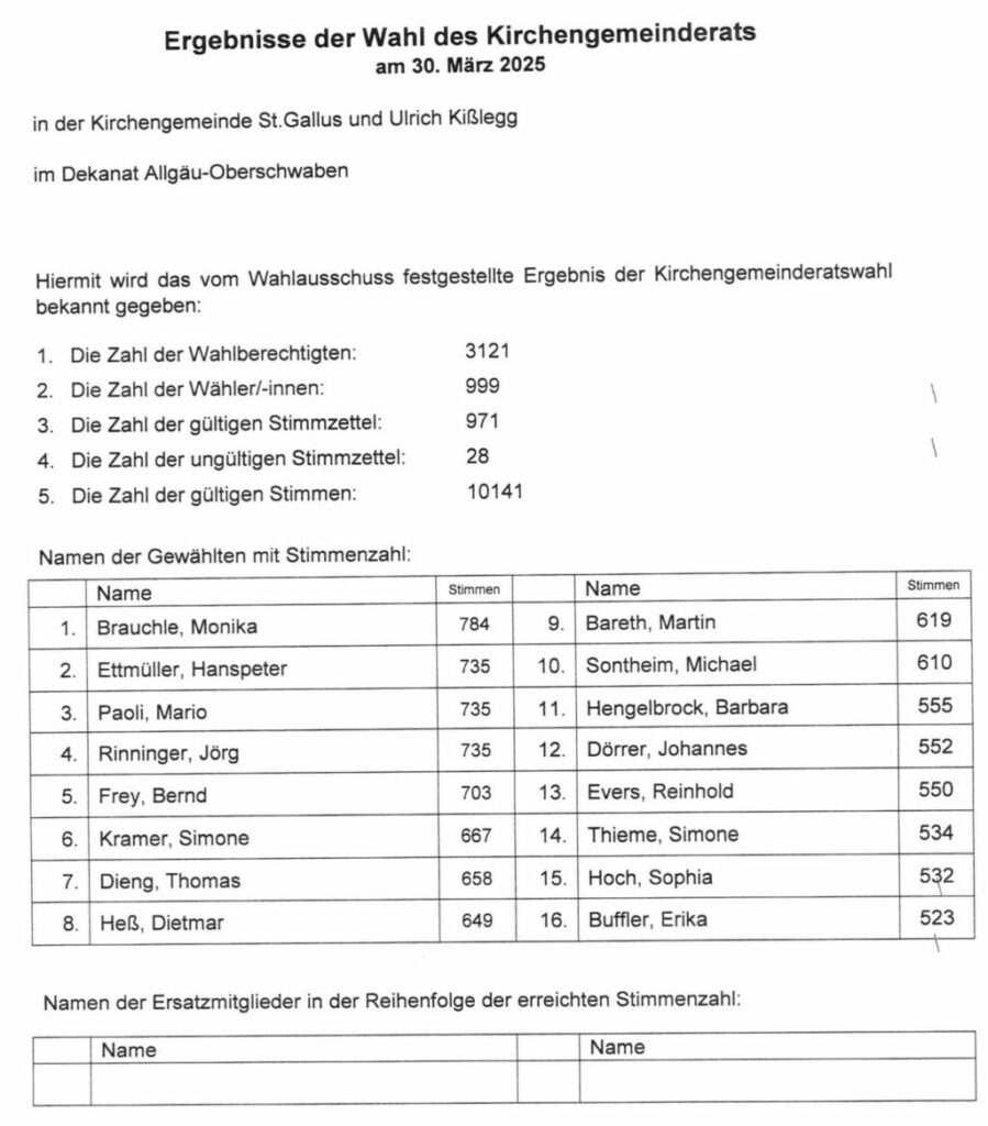 Kißlegg (rei) – In der katholischen Kirchengemeinde St. Gallus und Ulrich Kißlegg waren bei den Kirchengemeinderatswahlen am 30. März 3121 Katholiken über 16 Jahre wahlberechtigt. Von diesen gingen 999 zur Wahl. Das ergibt eine Wahlbeteiligung von 32,0 Prozent. Von den 16 Kandidaten erreichte Monika Brauchle mit 784 Stimmen das beste Ergebnis. Nachstehend das Ergebnis im Einzelnen: